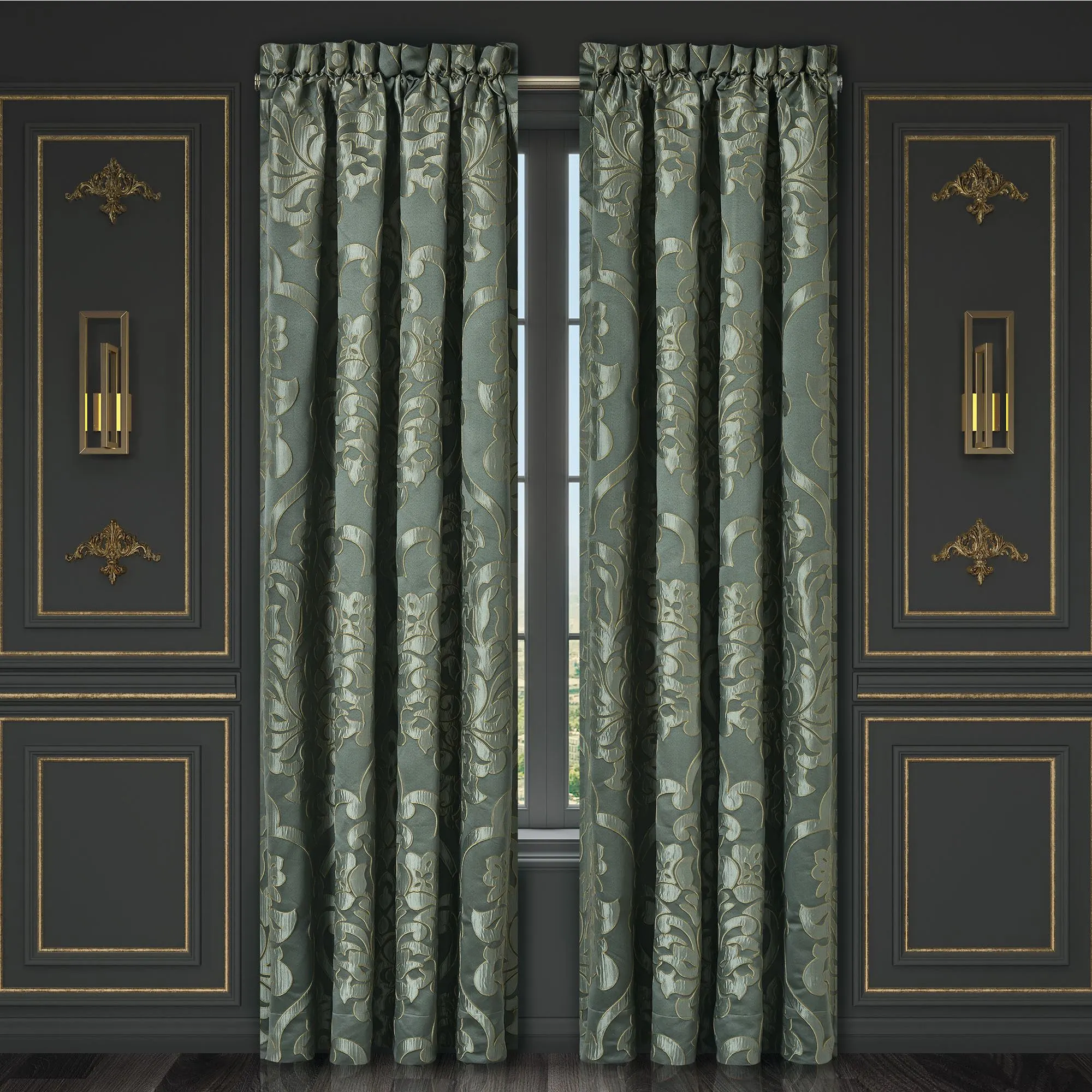 Window Treatment has damask. The lined Wide Curtain Pair has tailored edges and a 3" rod pocket. Tiebacks are included. Curtains are available in two lengths. Each Waterfall Valance has pleated flange edges and a 3.25" rod pocket. We recommend one valance for every 12"-15" of window width.