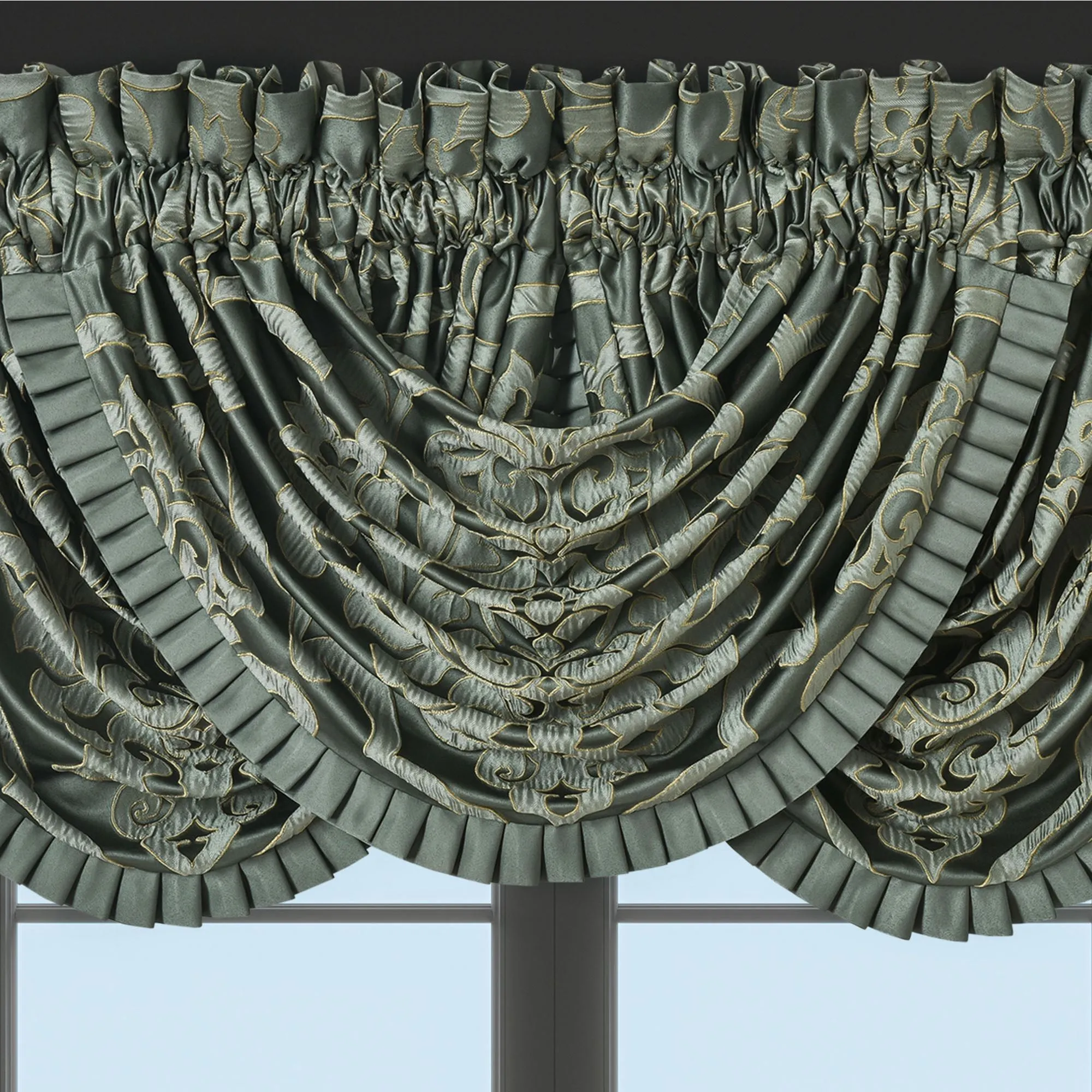 Window Treatment: Wide Curtain Pair has a 3" rod pocket and is 100"W; choose 84"L or 95"L. Each Waterfall Valance has a 3.25" rod pocket and is 43"Wx33"L. We recommend one valance for every 12"-15" of window width.
