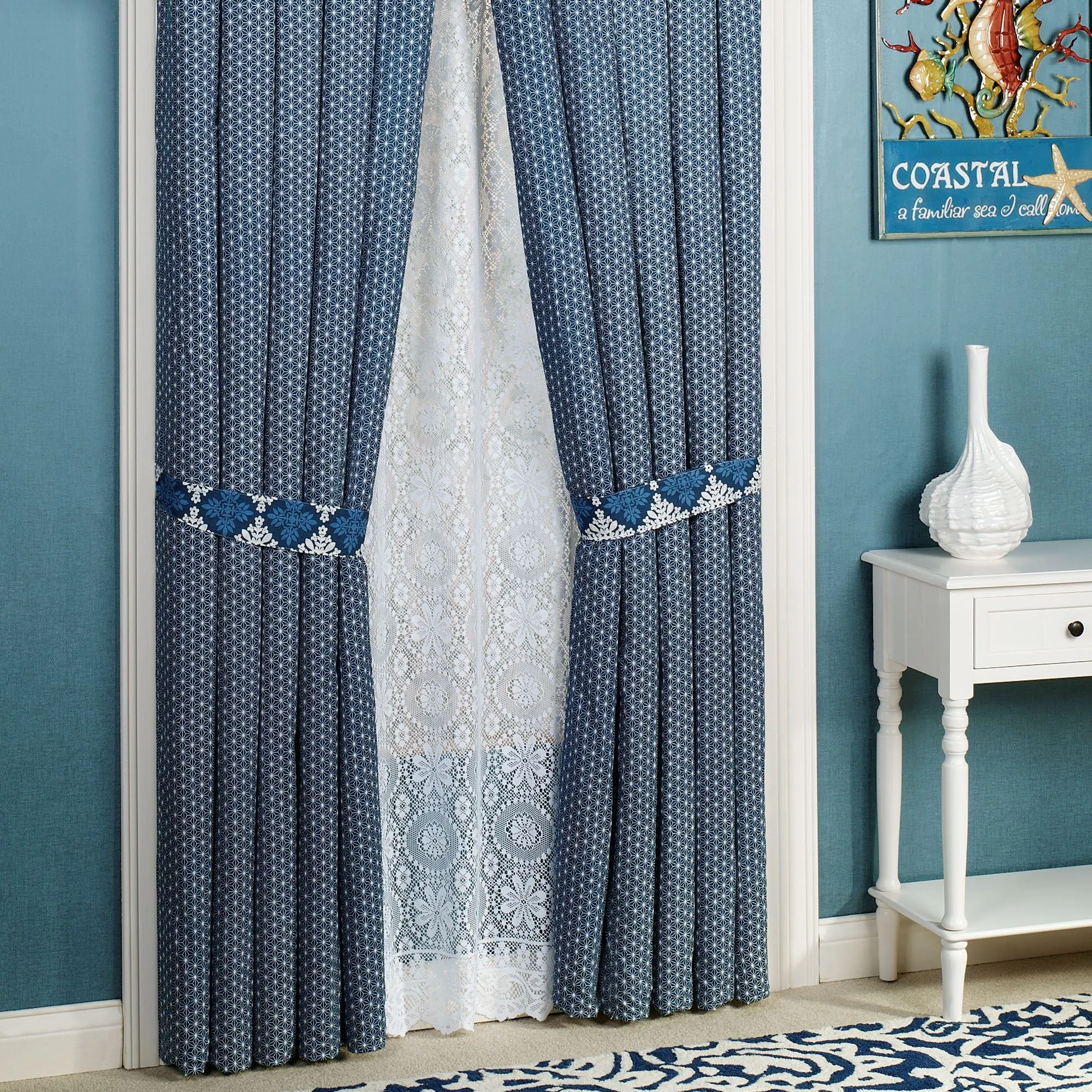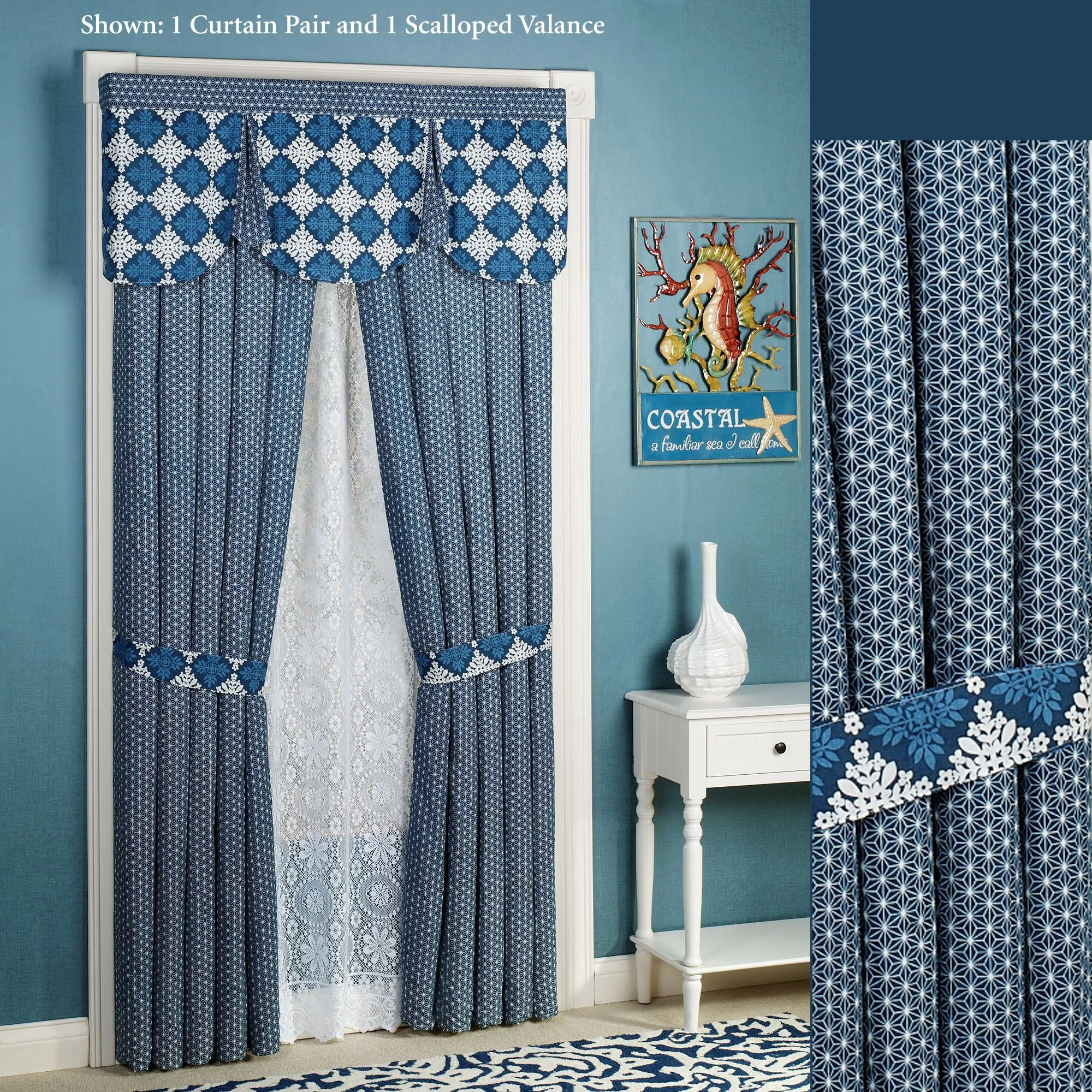 The cotton Santorini Window Treatment evokes the energy and beauty of an exotic island retreat. Tailored Curtain Pair has an all-over white star pattern on blue; tiebacks are included. Valance has white and blue floral medallions on indigo with a white star pattern on blue in between. Lined window treatment has 3" rod pockets. Machine wash. Imported. The curtain pair width is the total width of two panels together.