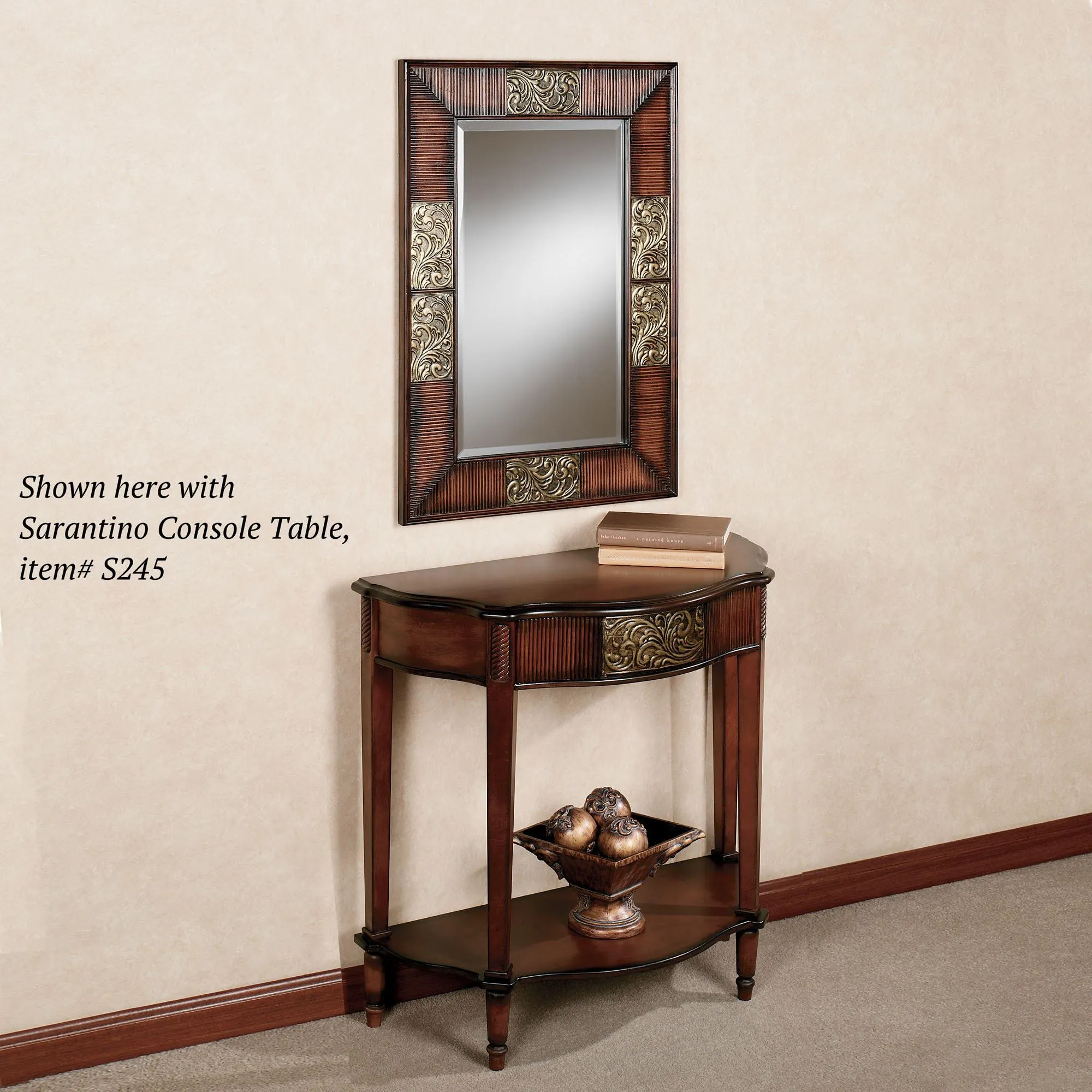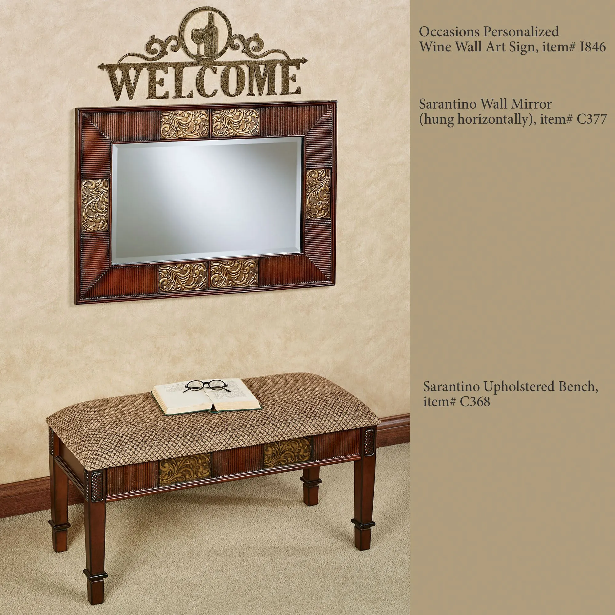 Use the Sarantino Wall Mirror to create an elegant statement in your home. Rectangular, beveled wall mirror has a wooden frame with a natural cherry finish and metal aged gold, medallion accents with black highlights. Overall, measures 24"Wx35"H; weighs 17 lbs.