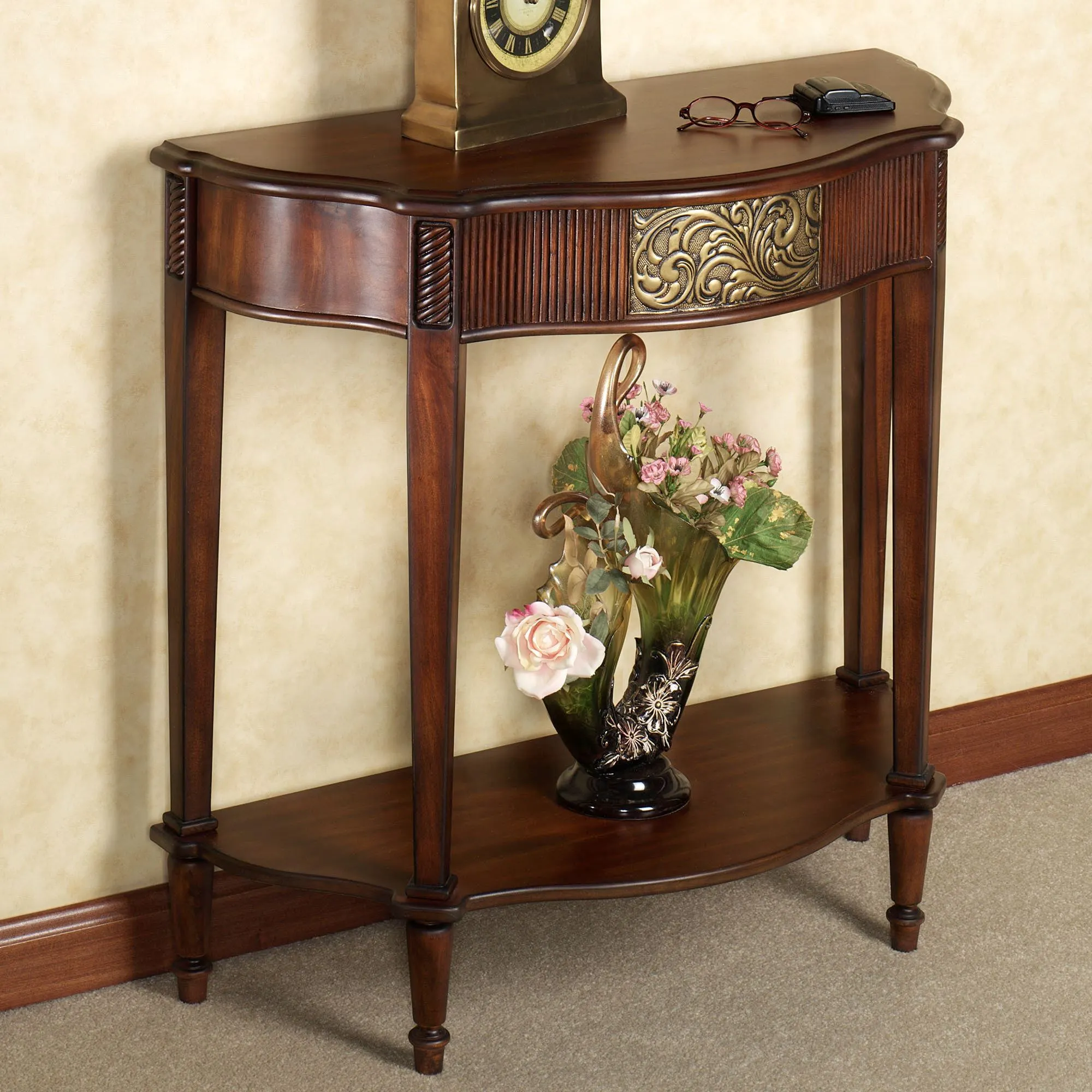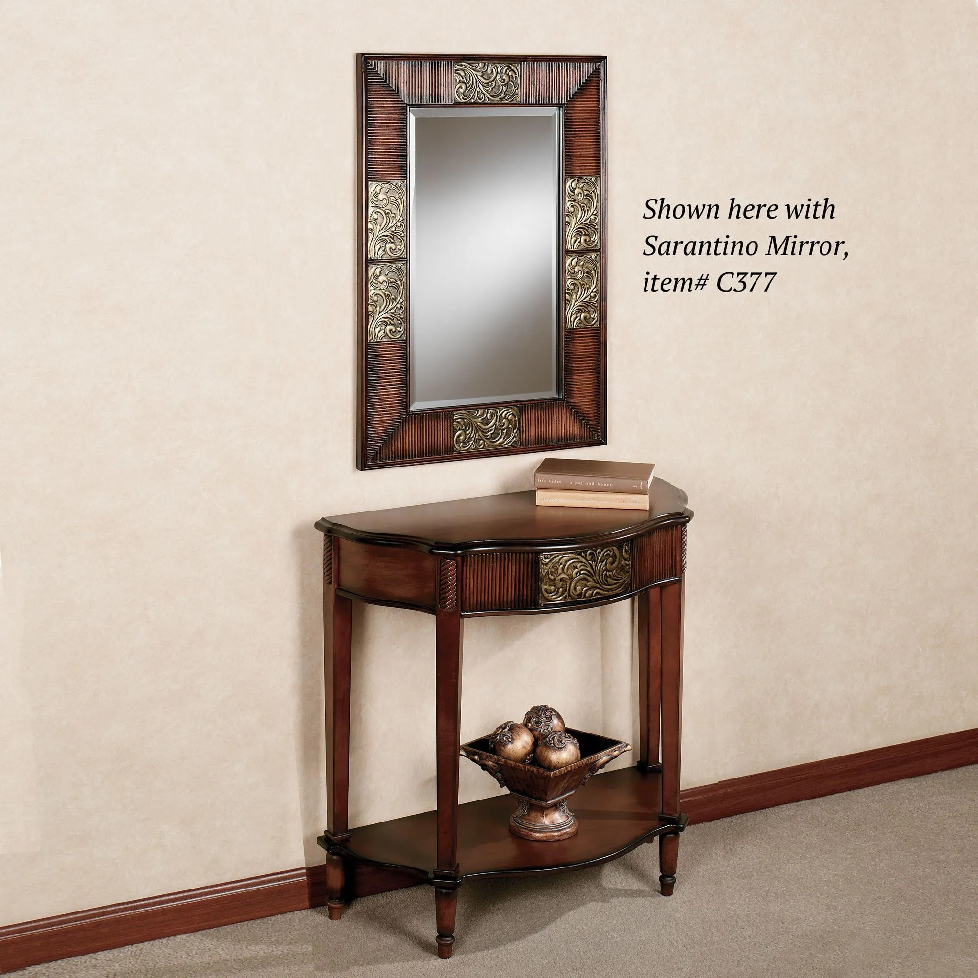 Create an elegant statement in your home with the Sarantino Console Table. Wooden furniture, with a natural cherry finish, has an aged gold, metal medallion with black highlights. Console table also features a bottom shelf that provides adequate display possibilities. Overall, 34"Wx15"Dx33"H; weighs approx. 24 lbs.