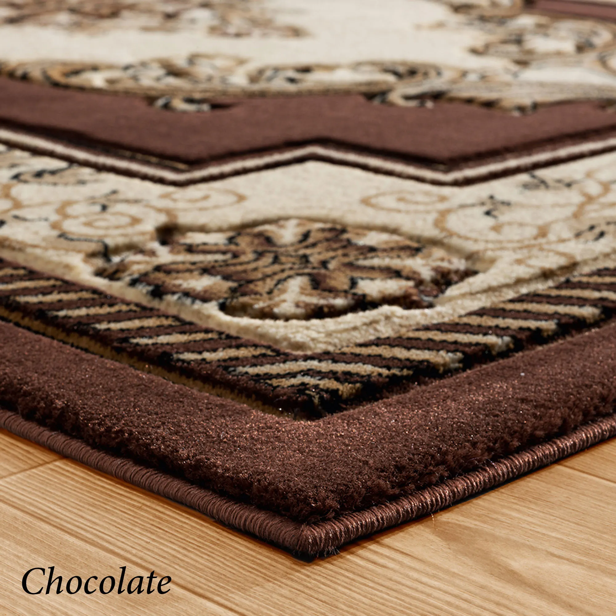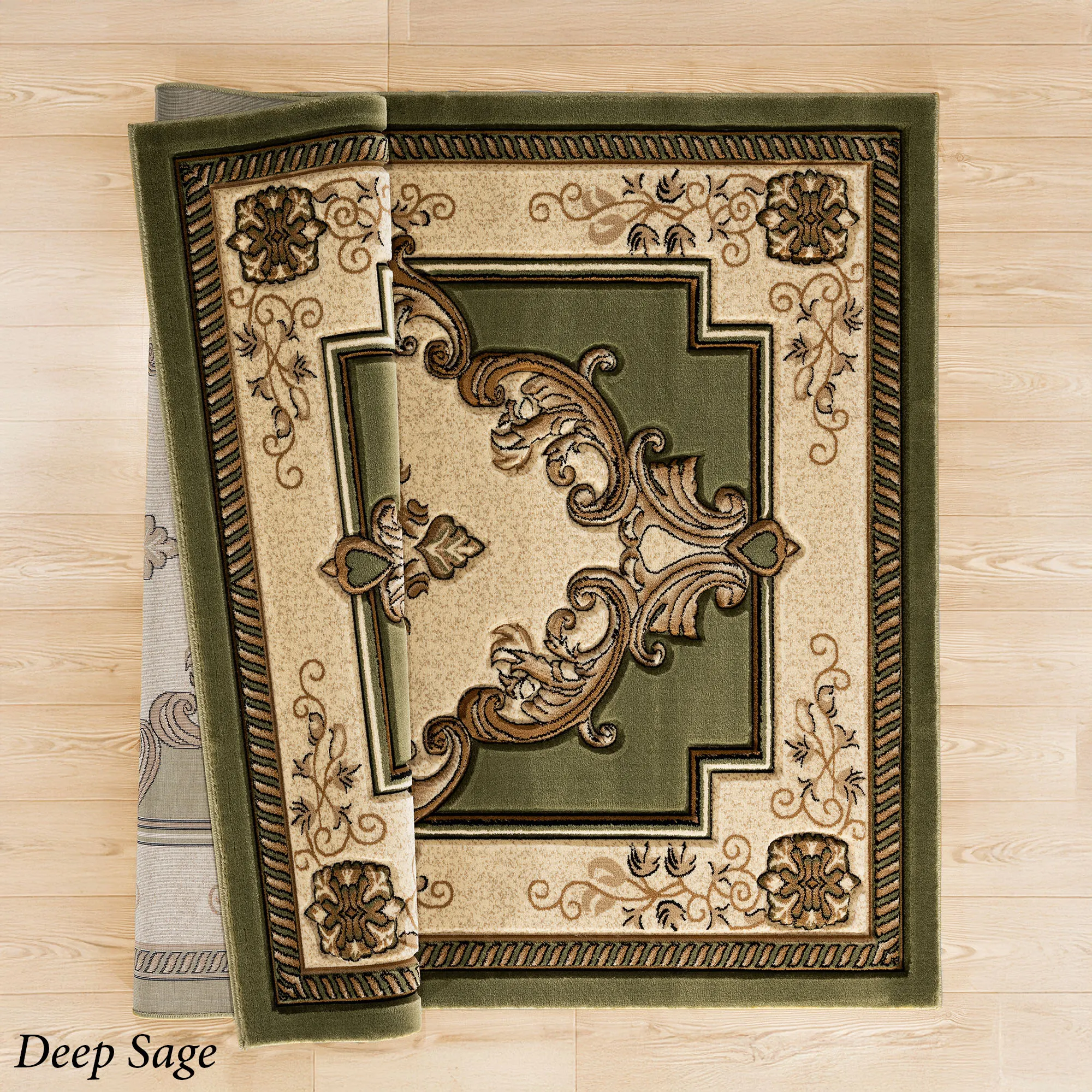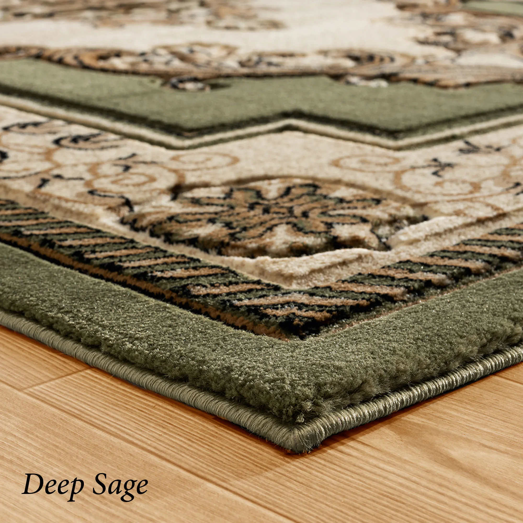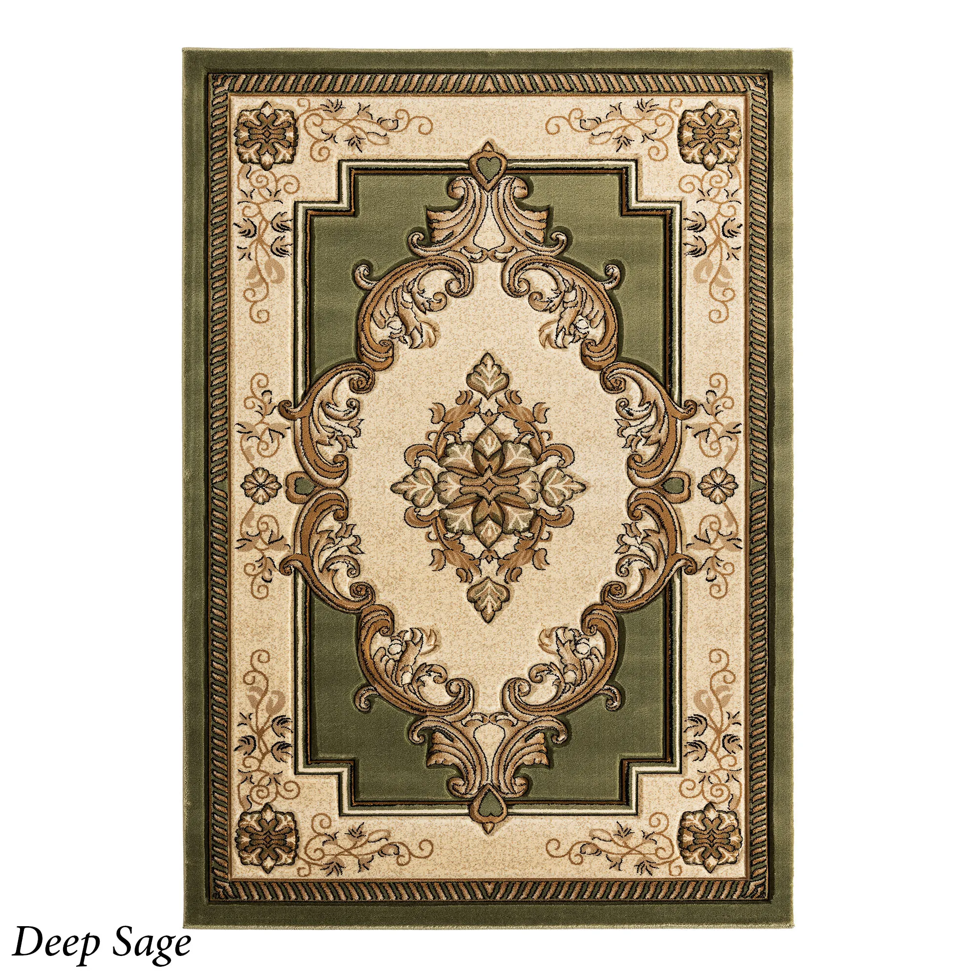 A classic Turkish design is beautifully replicated on the Sariah Rug. This power-loomed polypropylene area rug, .53" thick, features carved designs including a sophisticated central medallion and a detailed floral and vine border, along with ornate motifs. Blue includes shades of blue, brown, light cream, tan, beige, and black. Burgundy includes shades of burgundy, tan, black, light cream, ivory, and beige. Chocolate includes shades of chocolate, tan, black, light cream, ivory, and beige. Deep Sage includes shades of dark green, tan, black, light cream, ivory, and beige. Carved edges are serged, and the backing is jute. We recommend professional cleaning by a rug cleaner. Imported.