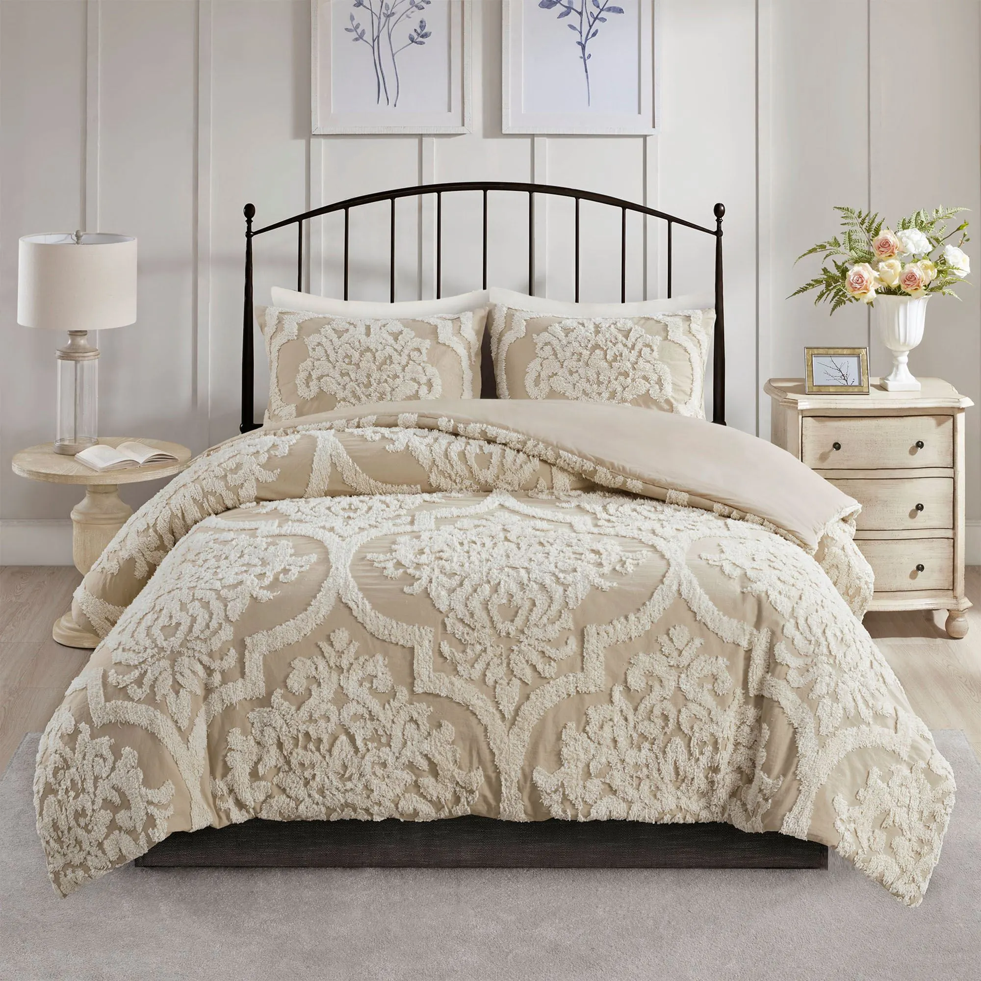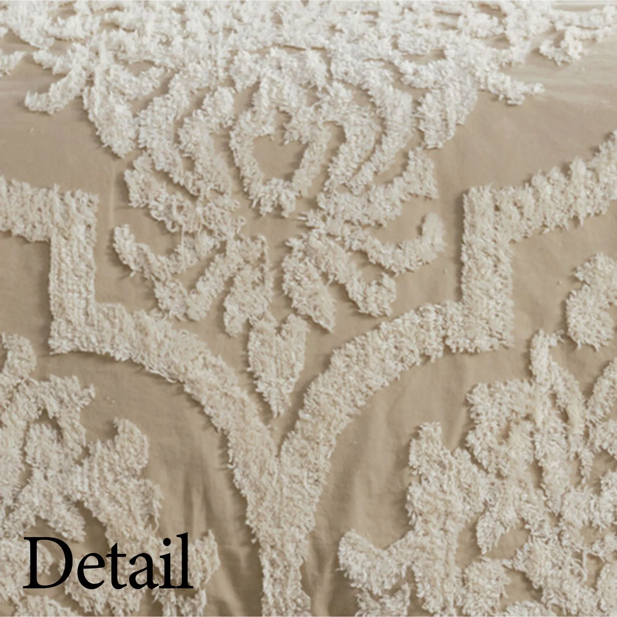 A tufted chenille damask pattern beautifully embellishes the Sasha Light Taupe Bedding with true beauty and graceful elegance. The Mini Comforter Set includes a comforter and shams. This cotton bedding, by Madison Park, features a medallion design and is OEKO-TEX(R) certified, meaning that it does not contain any harmful substances or chemicals. The tailored comforter has a natural tufted chenille design on a light taupe background and a solid color backing. The tailored shams mimic the comforter and have French back closures. Machine wash separately. Imported.