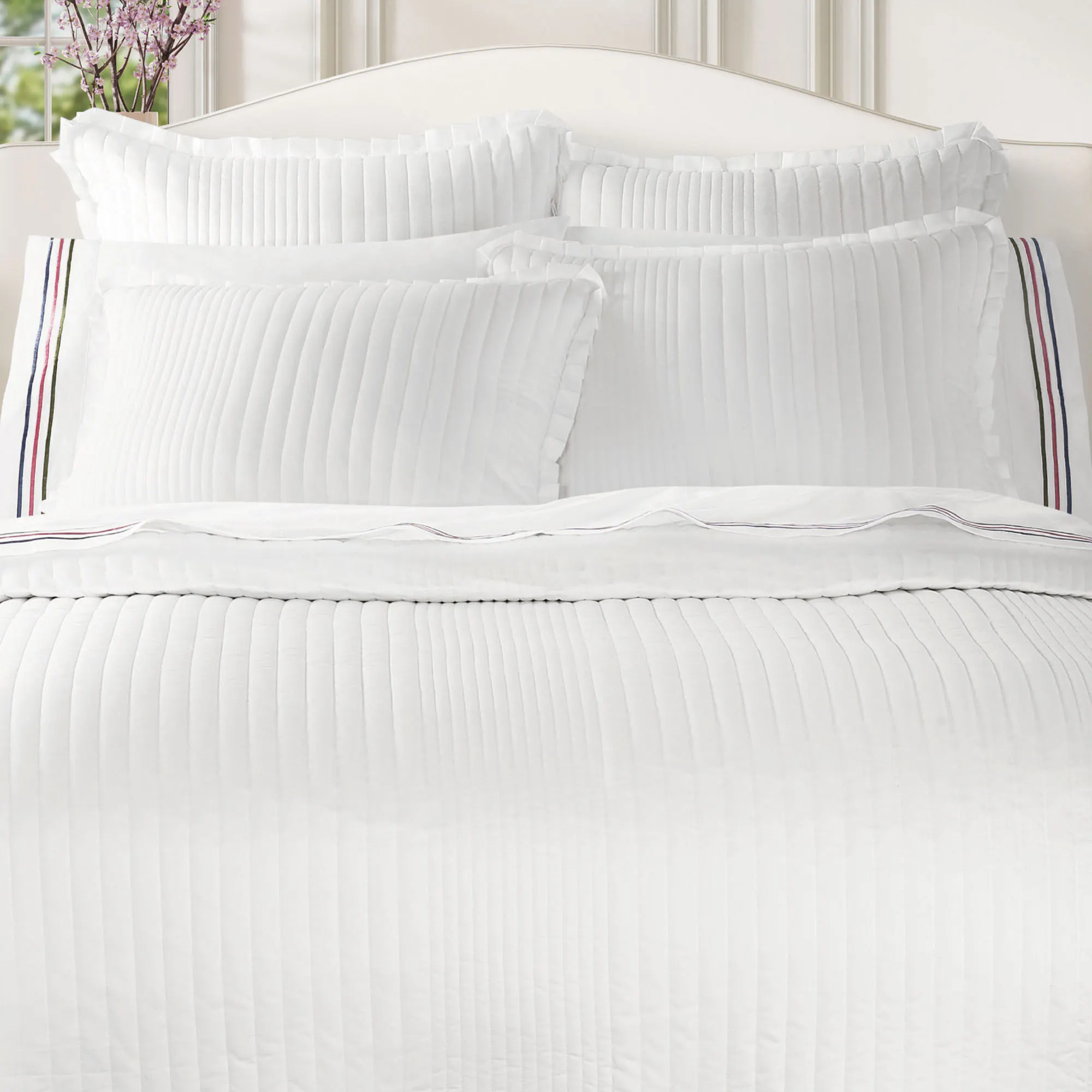The Savannah II Bedding has a crisp, clean look. This durable, cotton sateen ensemble, from J. Queen Cottage, is solid white with channel quilting and is perfect for year-round use.
