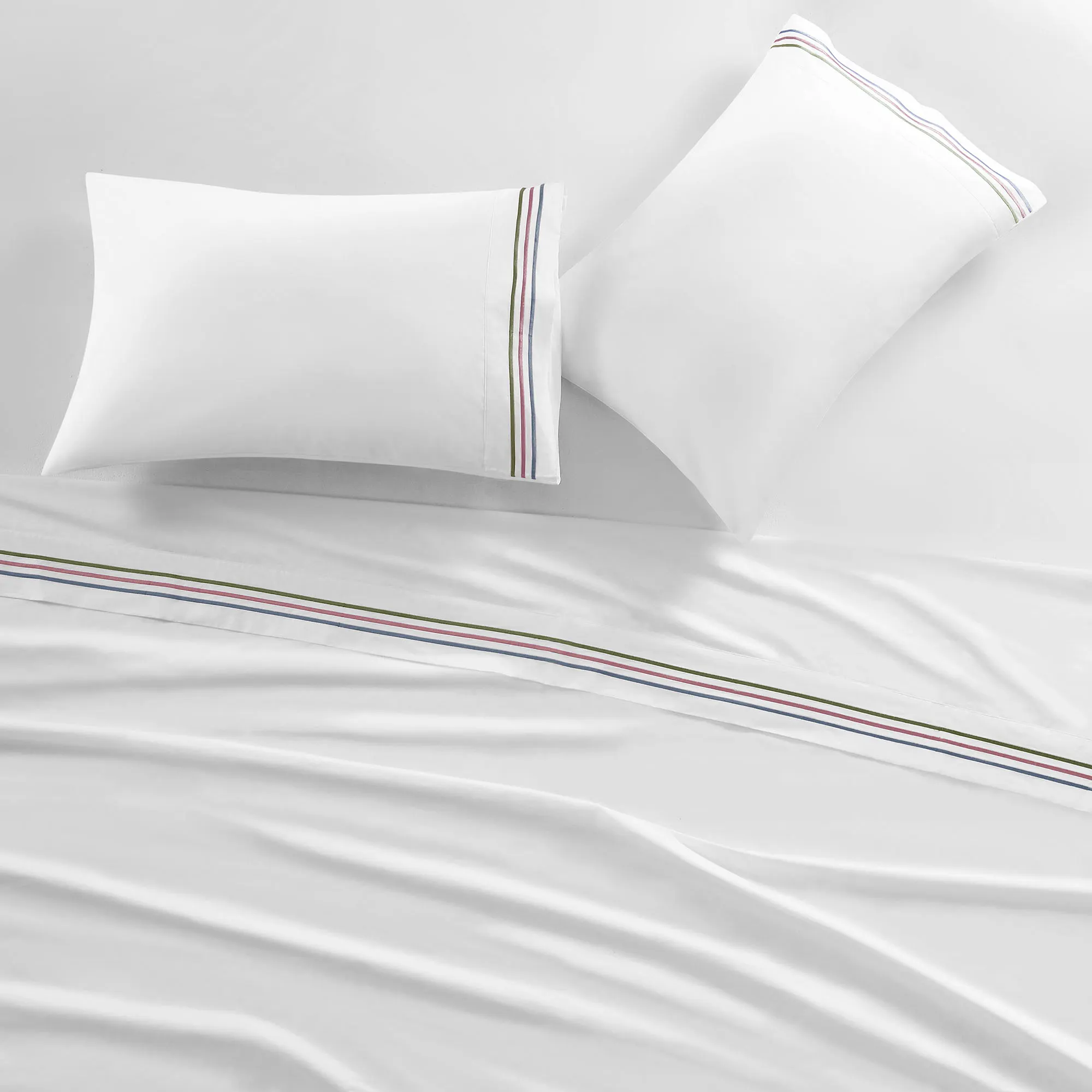 The Sheet Set includes one flat sheet, one fitted sheet, and two pillowcases. The white sheets have a 300 T.C. The flat sheet and pillowcases have embroidered stripe designs in green, pink, and blue on white. The fitted sheet has 16" deep pockets and fits up to an 18" deep mattress. For sheet set, choose Full, Queen, King, or Cal King.
