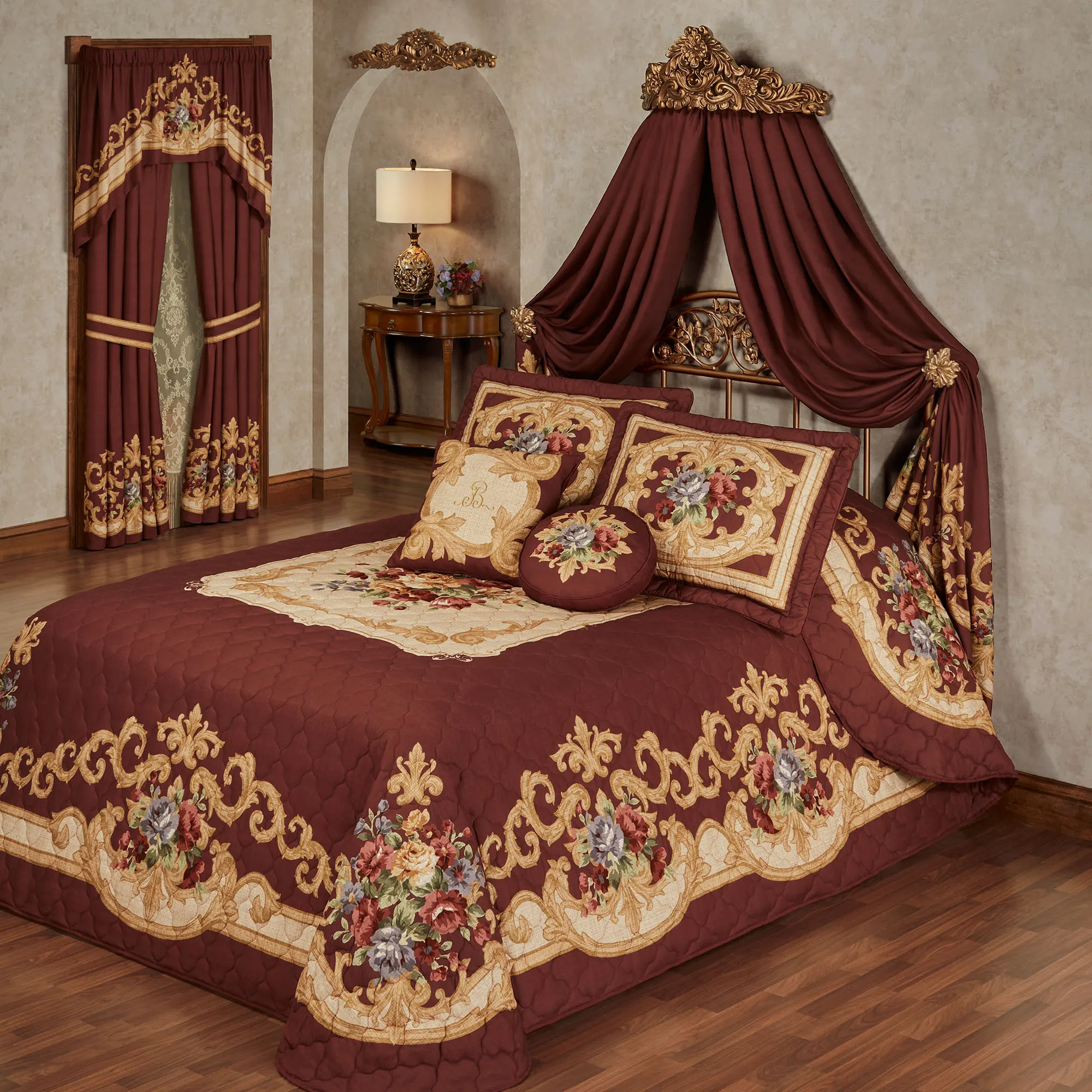 The Savonnerie Bedding tantalizes classic tastes and harkens to rich design traditions of the past. The Bedspread Set includes a grande bedspread and shams. Resplendent with Aubusson motifs of scrollwork and bouquets, the cordovan brushed polyester microfiber bedspread features robust printed shades of cordovan, claret, tarragon, cypress, wisteria, honey, and gold. Oversized bedspread features a bouquet on honey, grand Aubusson frames, quatrefoil quilting, a 24" drop, bottom bell corners, and a reverse pillow tuck to cover your pillows. Backing is cordovan brushed polyester microfiber. Fill is polyester. Machine washable. Imported.