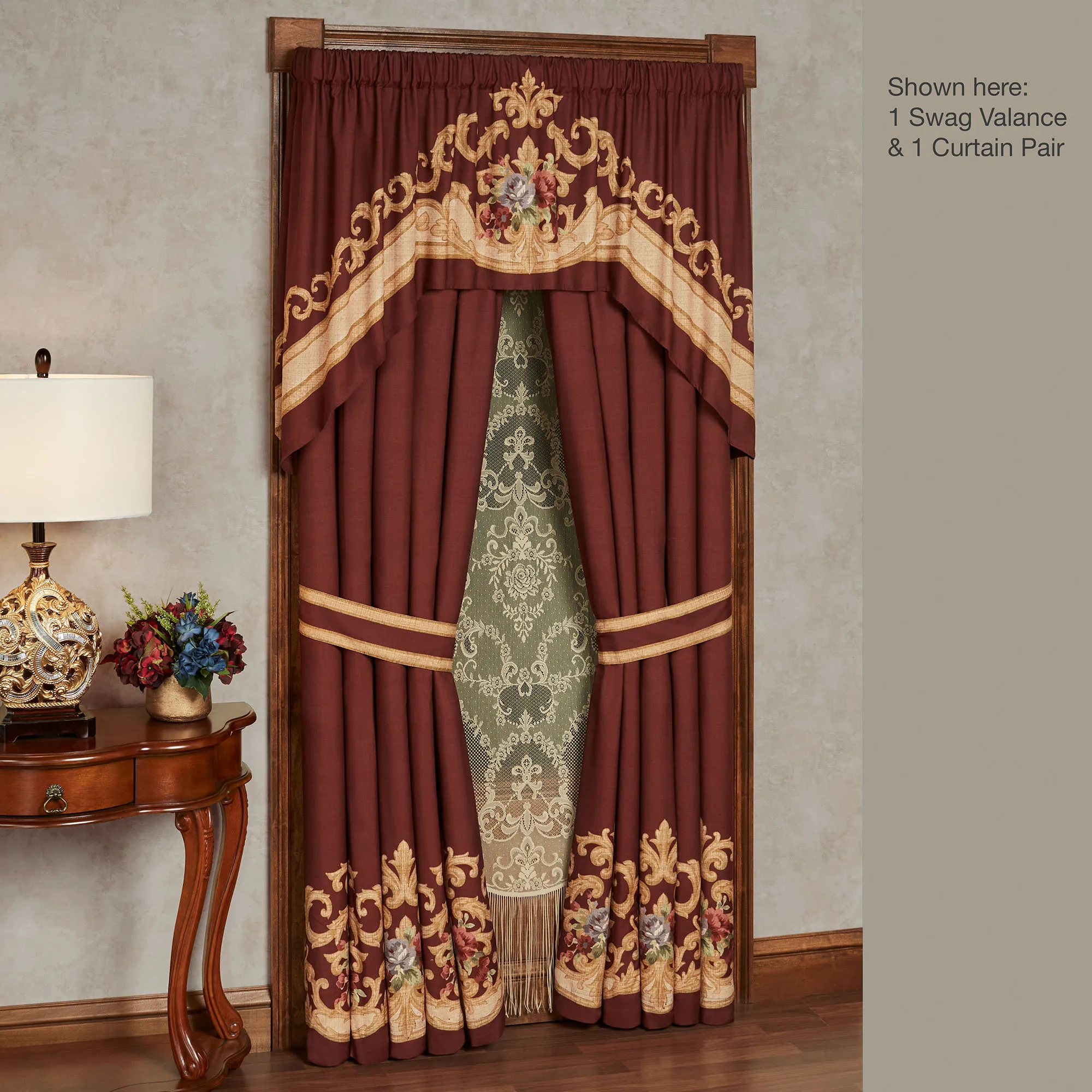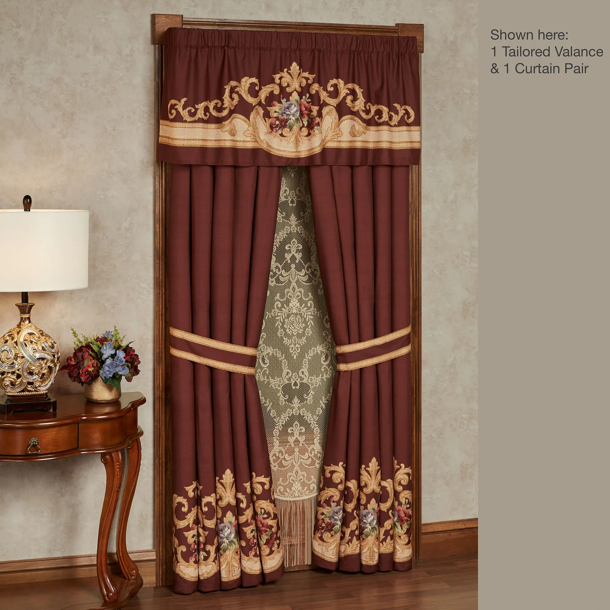 Lined Window Treatment has tailored edges and 3" rod pockets. Wide Curtain Pair has motifs along the bottom. Striped tiebacks are included. Coordinating valances are available. Choose Swag Valance or Tailored Valance.