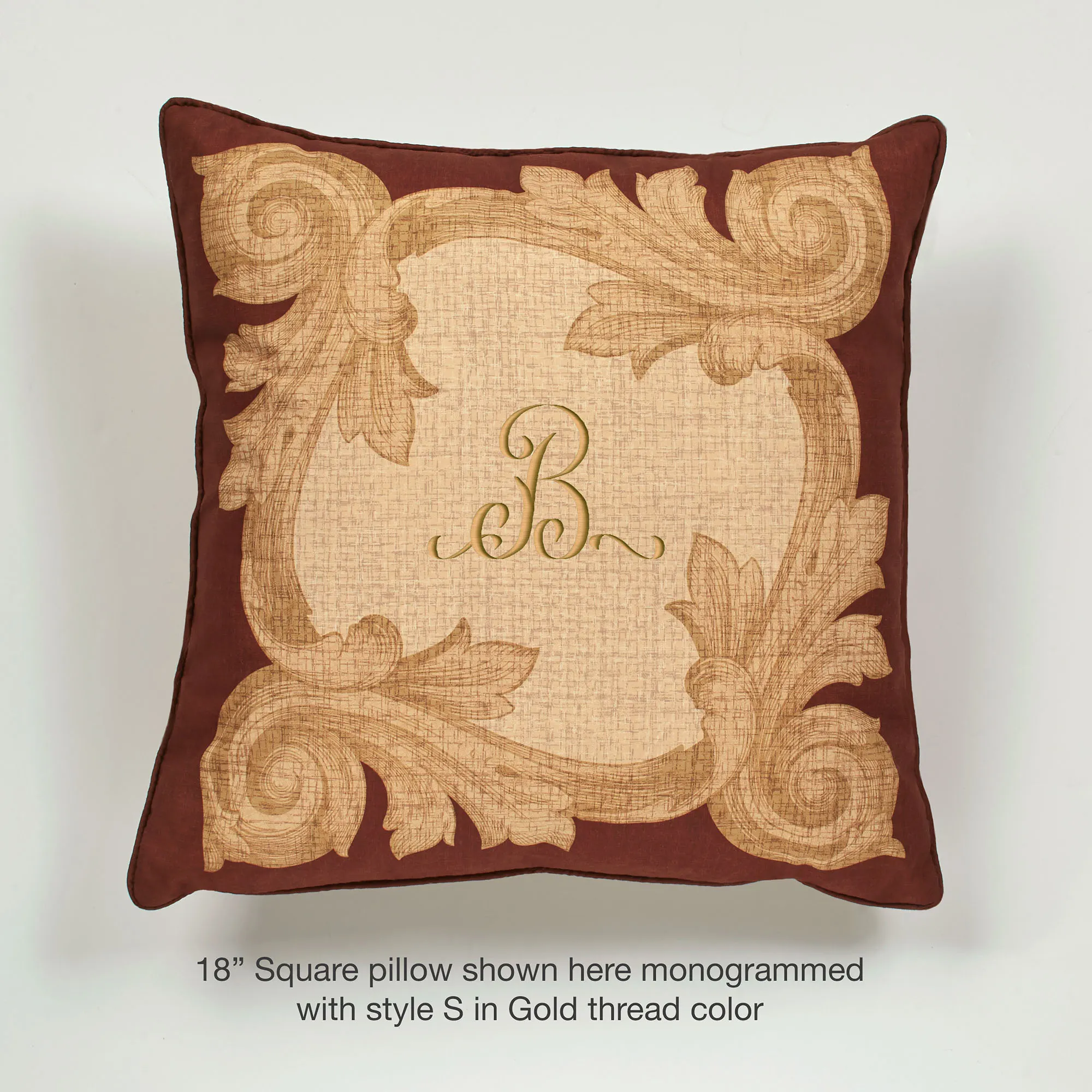 Piped Pillows are cordovan. Spot clean. Square has a honey center and a scrollwork frame; zipper closure. Square pillow may be monogrammed for an additional charge. Monogramming is shown in the Gold thread color. Round has Aubusson motifs and a 2" gusset.