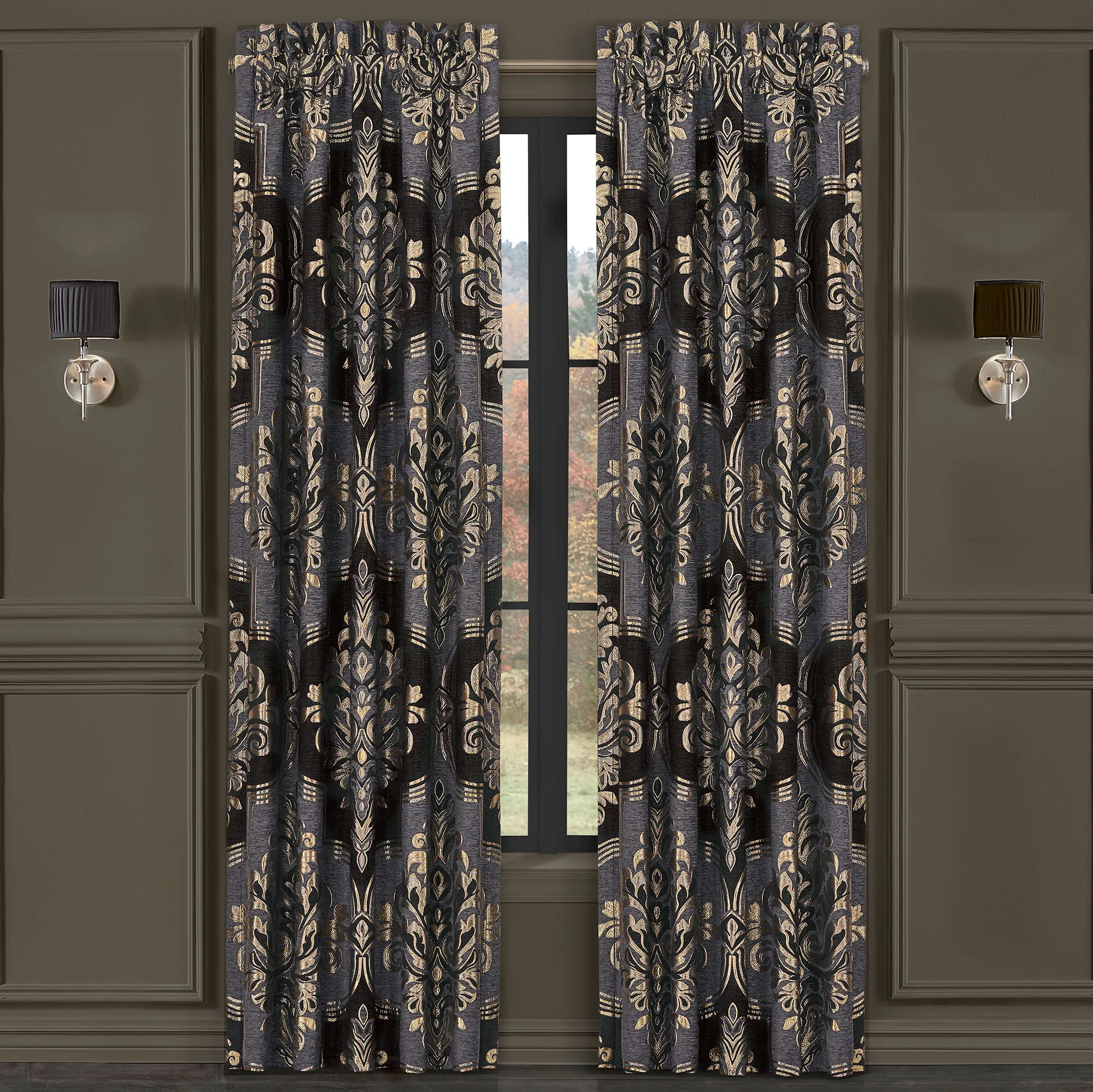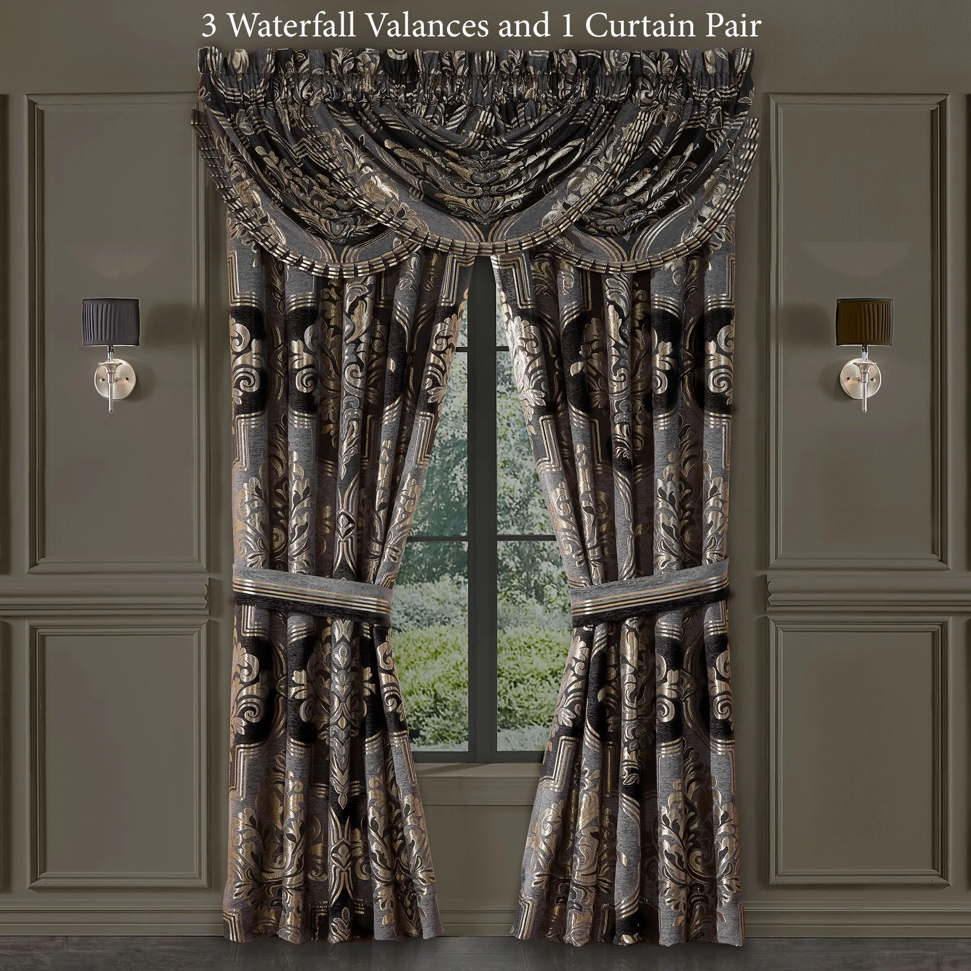 Enchantingly dramatic, the Savoy Window Treatment exudes an elevated air. From J. Queen New York, the polyester window treatment features classic jacquard-woven scrollwork damask encased in beautiful quatrefoil outlining. Shimmering metallic gold embellishes the rich pewter and black chenille designs with a radiant allure. Lined window treatment has 3" rod pockets. Specify Wide Curtain Pair or Waterfall Valance. Wide Curtain Pair has tailored edges. Tiebacks are included. Each Waterfall Valance has pleated edges. We recommend one valance for every 12"-15" of window width. Dry clean only. Imported. The curtain pair width is the total width of two panels together.