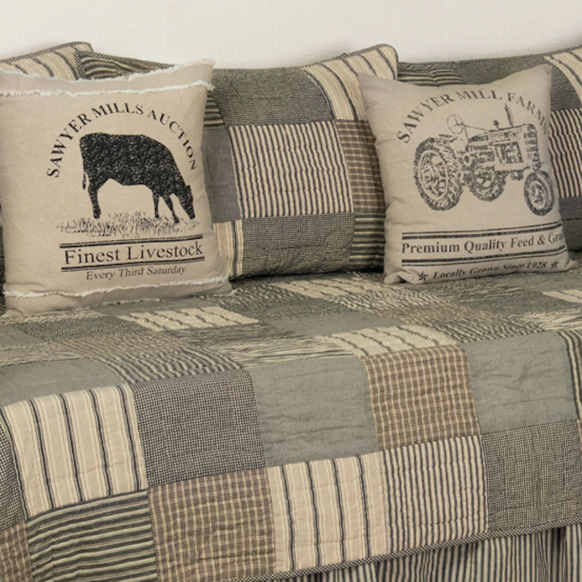 The plaids and stripes on the Sawyer Mill Patchwork Daybed Bedding create a cozy sleeping space. From April & Olive, the Daybed Set includes a daybed quilt, a bedskirt, and three standard shams. Cotton daybed quilt features patchwork blocks with printed designs in charcoal, cream, light taupe, tan, black, taupe, and gray. Daybed quilt also has stitch-in-the-ditch and echo hand-quilting and a 12" drop. Backing has printed stripes in charcoal, cream, and light taupe. Daybed quilt fill is cotton. Machine wash gentle; click on the Details tab for full care information. Imported. Sorry, the tractor pillow shown is not available.