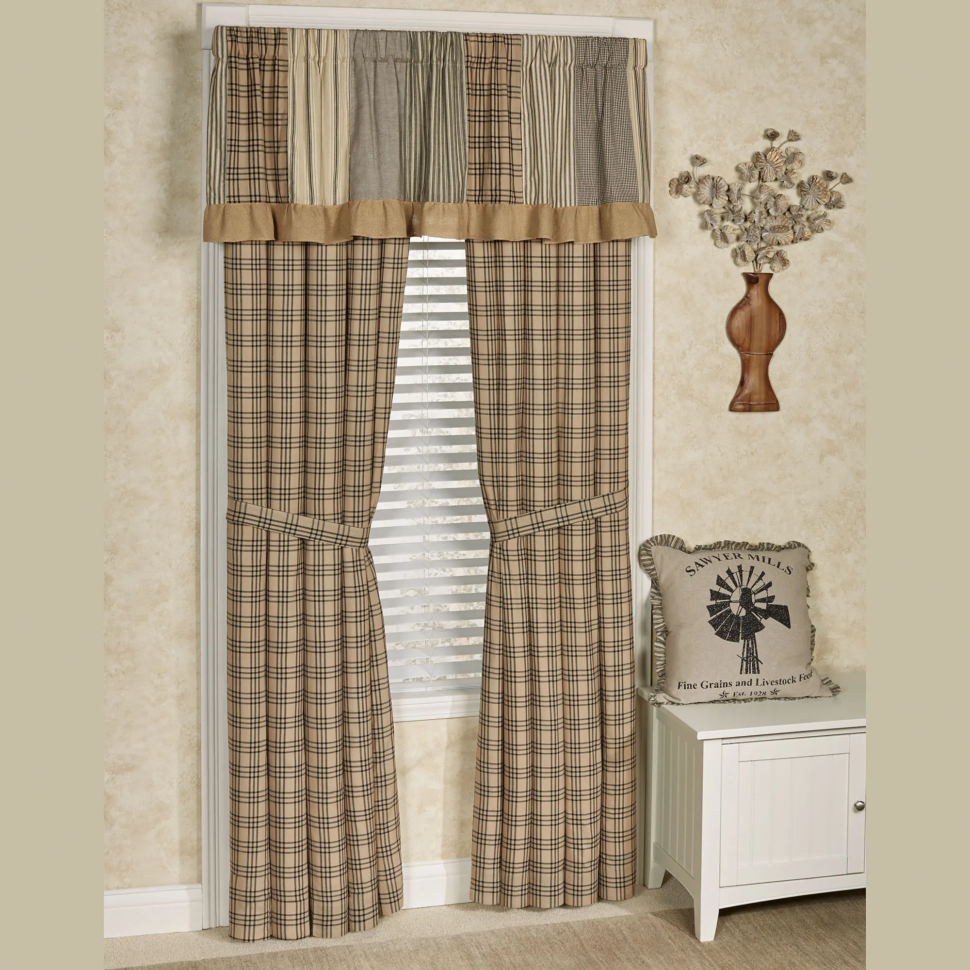 Tailored Window Treatments are lined and have 3.25" rod pockets. Curtains have printed plaid in black and tan. Tiebacks are included. Valance mimics the daybed quilt with a 3" burlap ruffle.