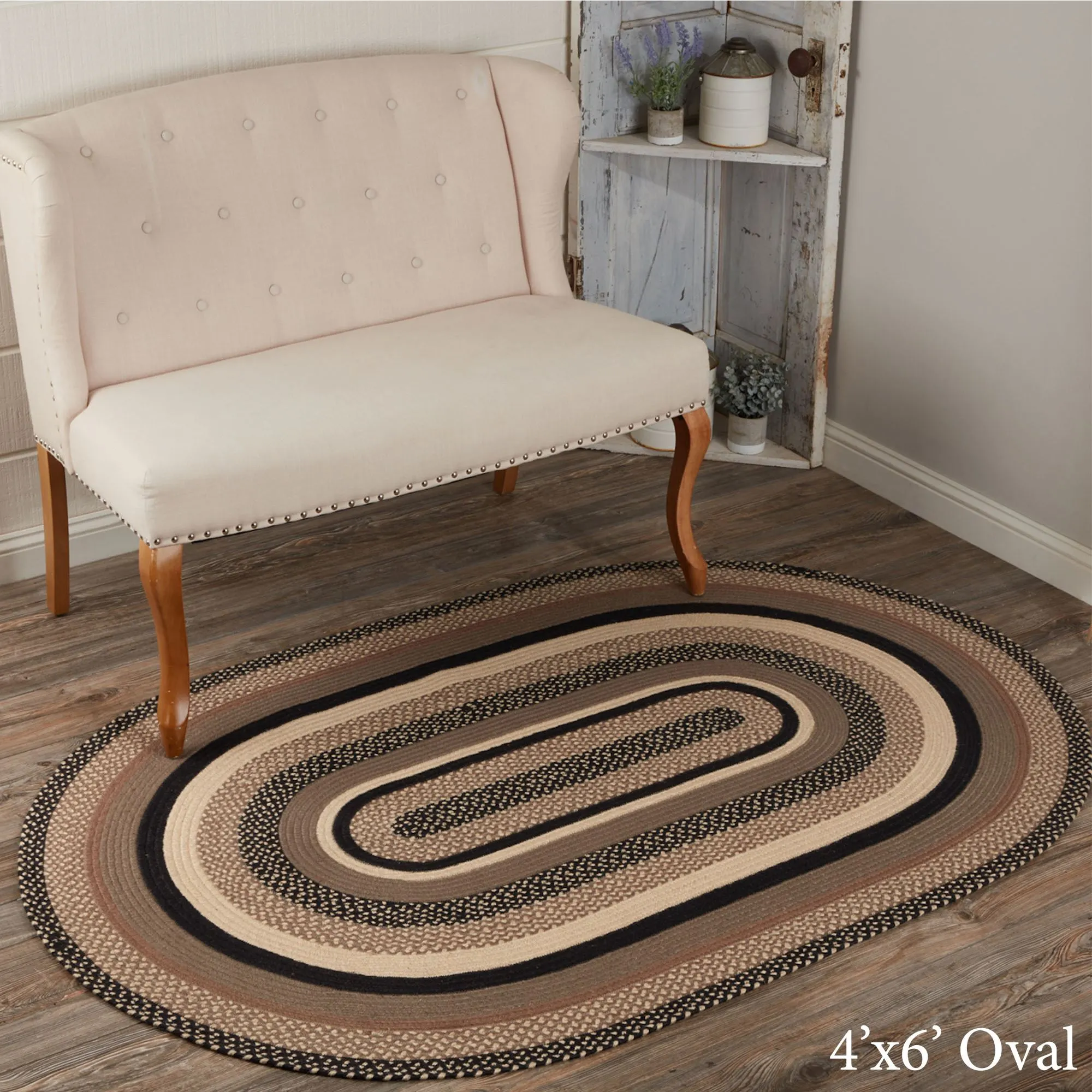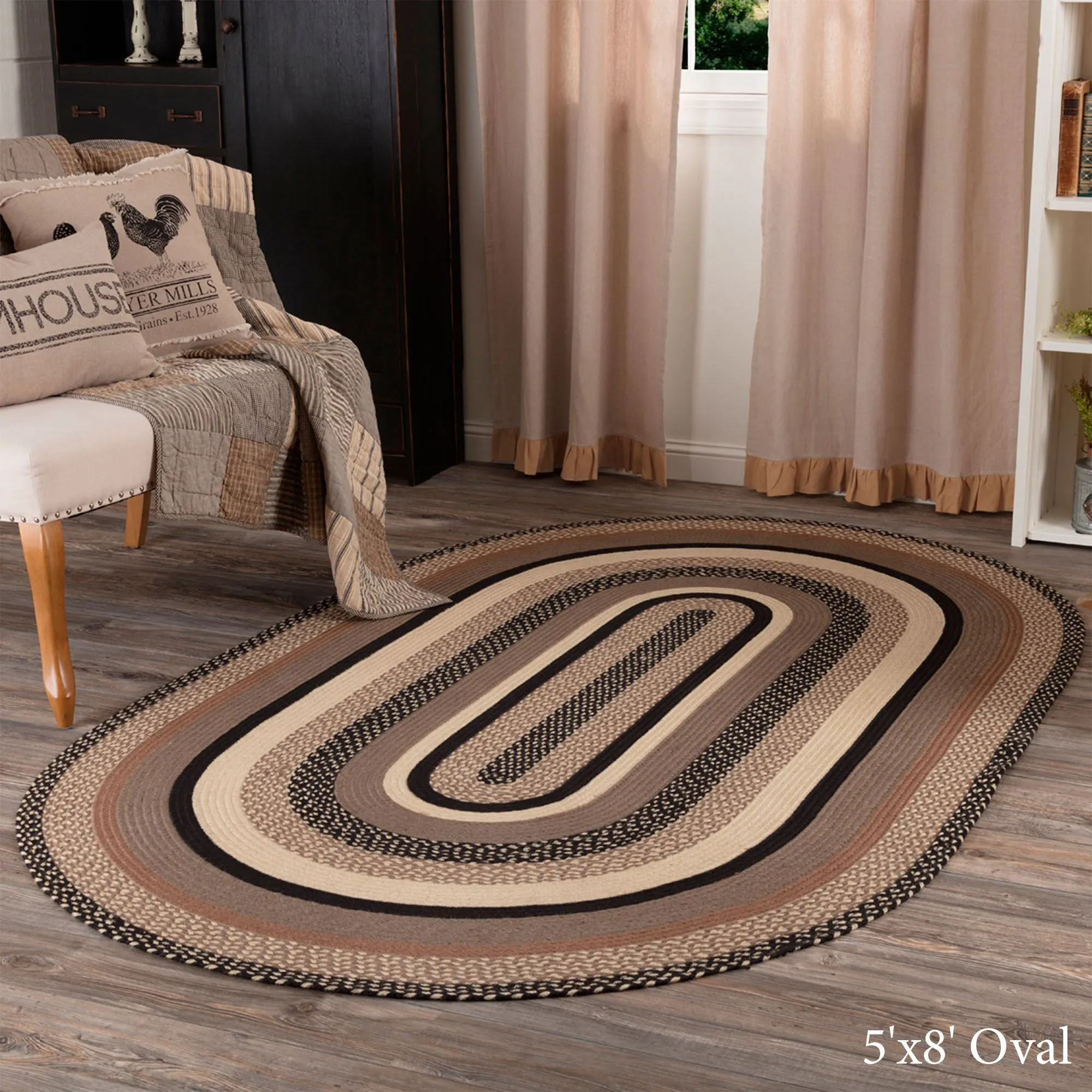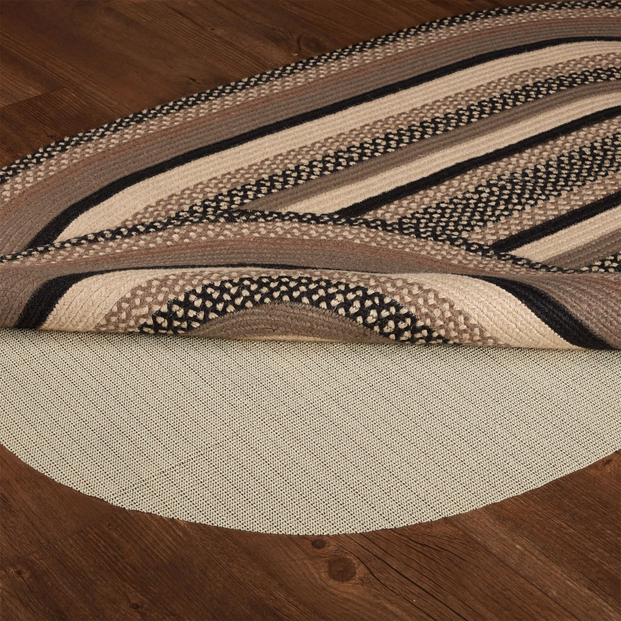 The Sawyer Mill II Braided Oval Rug is a jute/cotton/acrylic blend and includes a PVC rug pad. Imported.