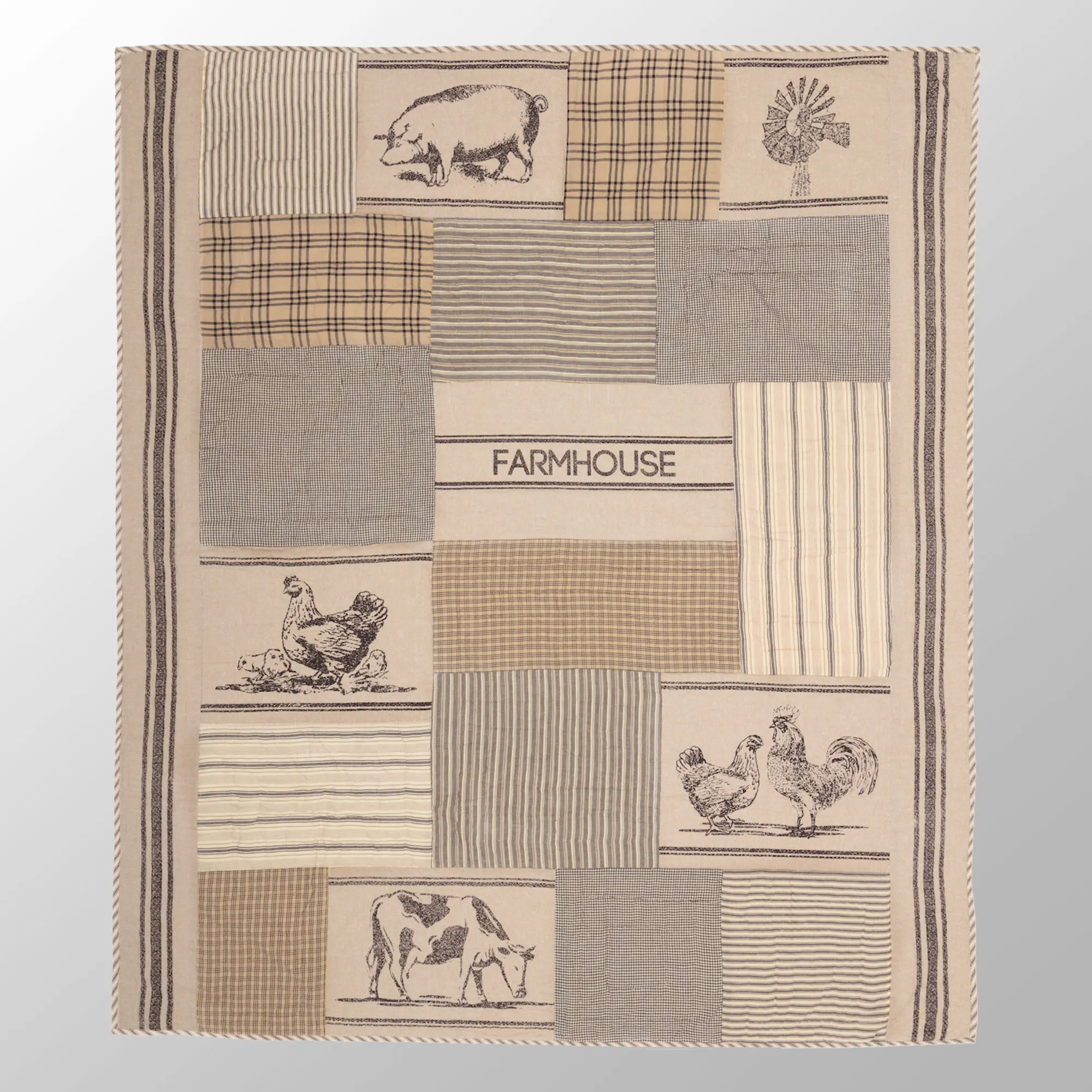 The handsome plaids and stripes on the Sawyer Mill Patchwork Throw Blanket by April & Olive create a cozy and comfortable space. This cotton throw features patchwork blocks with printed designs in shades of charcoal, cream, light taupe, tan, black, taupe, and gray. Throw has a patchwork pattern along with chickens, a pig, a cow, a windmill, and the word "Farmhouse." Throw also has stitch-in-the-ditch hand-quilting, bound edges, cotton fill, and a backing with a printed grainsack stripe pattern. Throw has a 2.75" rod pocket on the back for hanging. Measures 50"x60". For throw: Machine wash gentle; click on the Details tab for full care information. Imported.