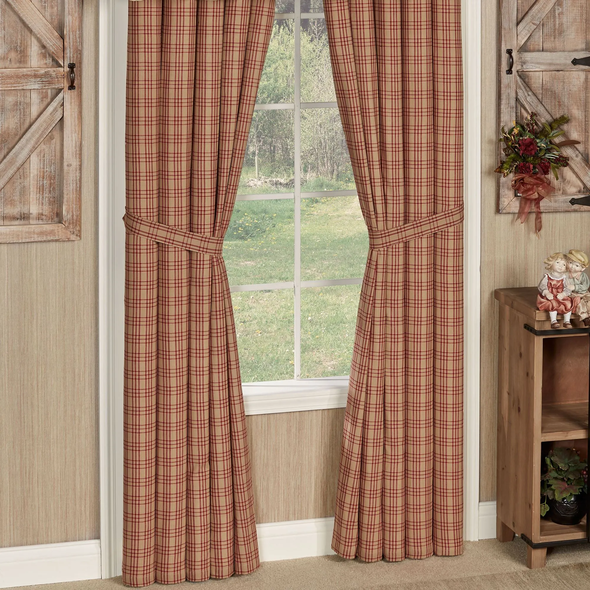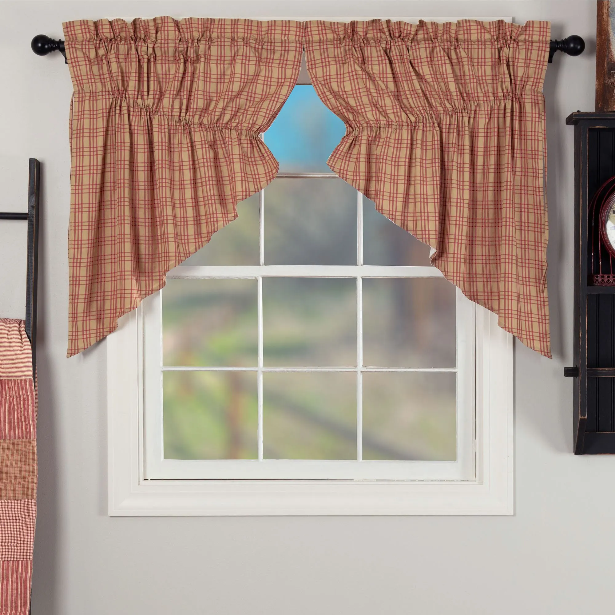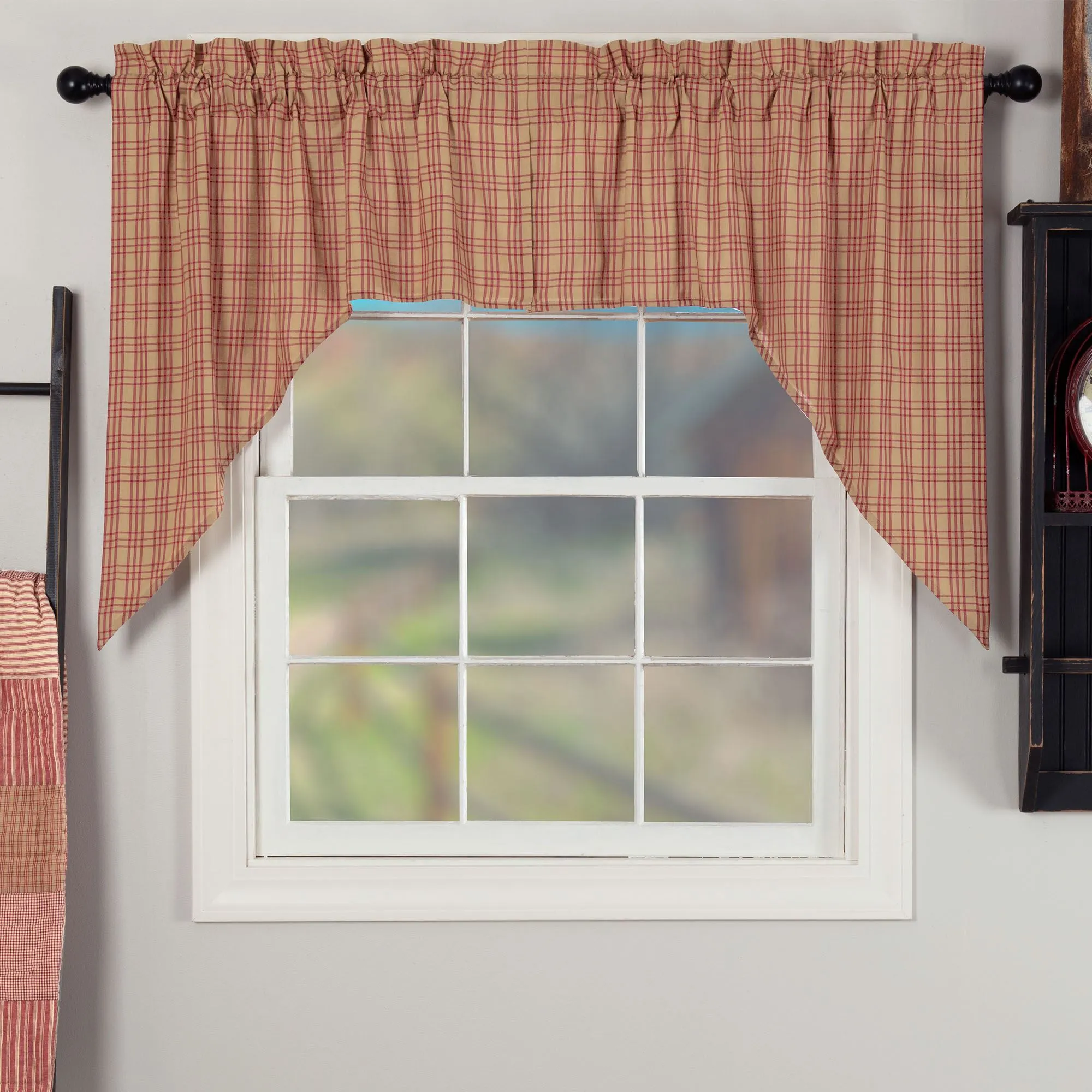 The Sawyer Mill Red Window Treatment displays classic farmhouse colors. Lined, pure cotton window treatment has tailored edges and 3.25" rod pockets. Plaid items are dark red and tan. Specify Ruffled Valance, Tailored Curtain Pair, Prairie Swag Valance Pair, or Swag Valance Pair. Ruffled Valance has patchwork blocks with plaids, checks, and stripes in vanilla, champagne, tan, dark red, and cranberry; valance also has a ruffled vanilla bottom band. Tailored Curtain Pair is plaid and includes tiebacks. Prairie Swag Valance Pair is plaid with adjustable drawstrings. Swag Valance Pair is plaid. Machine washable. Imported. The curtain pair width is the total width of two panels together.
