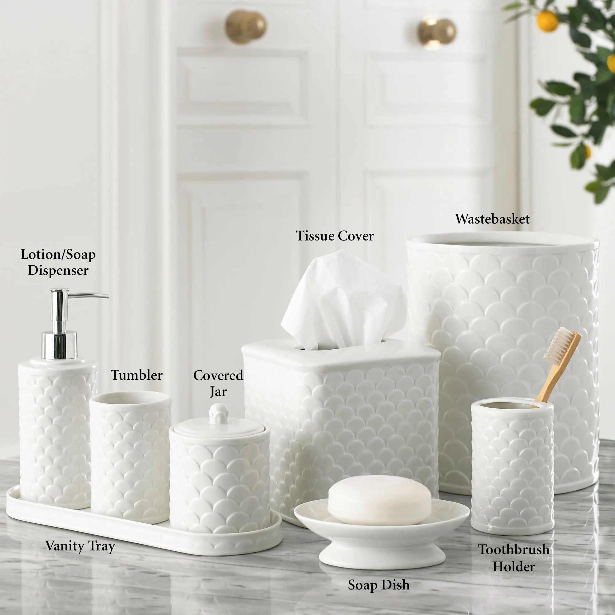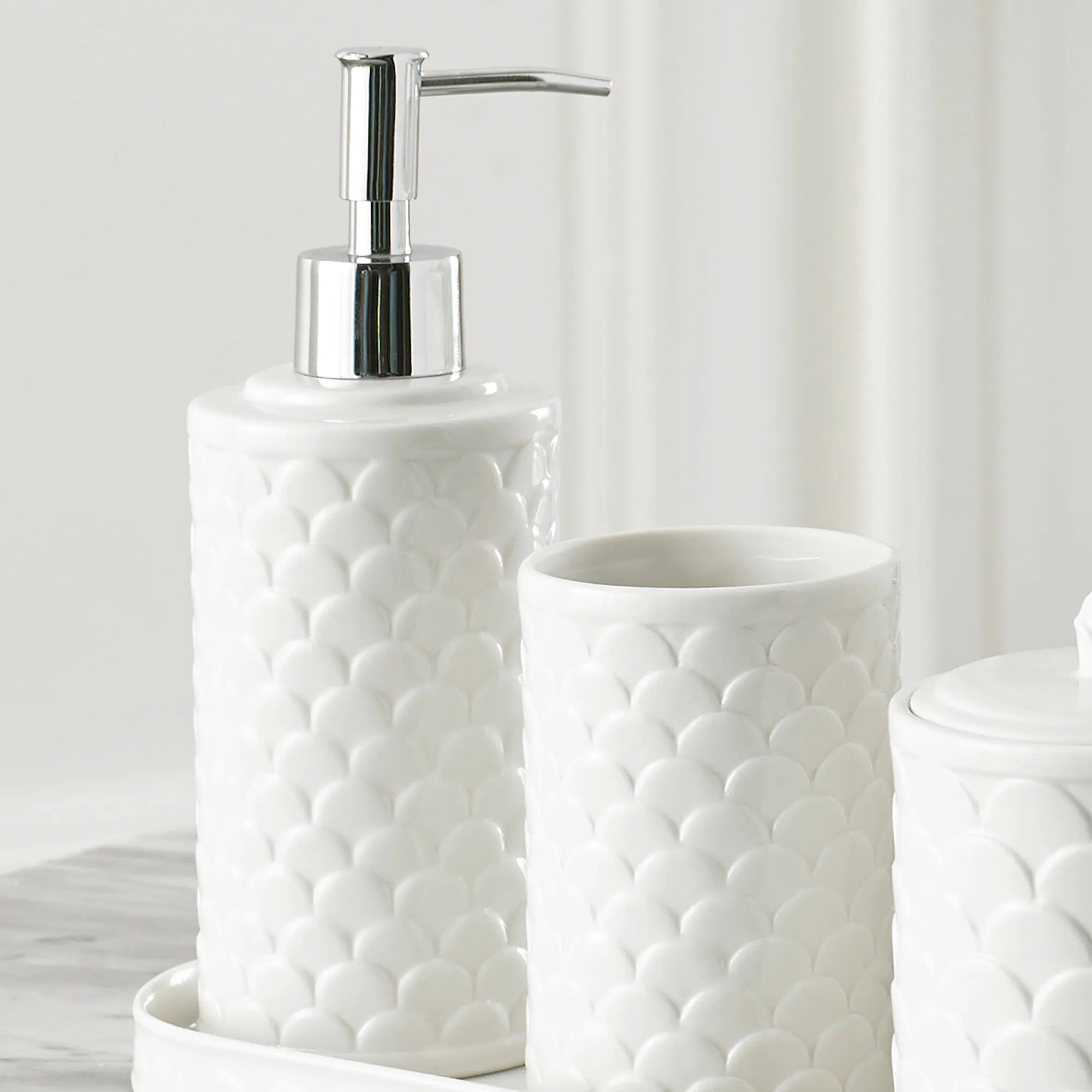 Made of fine porcelain, the Scala Bath Accessories add a crisp and clean touch to your bathroom decor. Each ivory bath accessory features an overlapping pattern for a modern, coastal interpretation reminiscent of mermaid scales. Accessories are sold individually. Specify Vanity Tray, Lotion/Soap Dispenser, Tumbler, Covered Jar, Tissue Cover, Soap Dish, Wastebasket, or Toothbrush Holder.