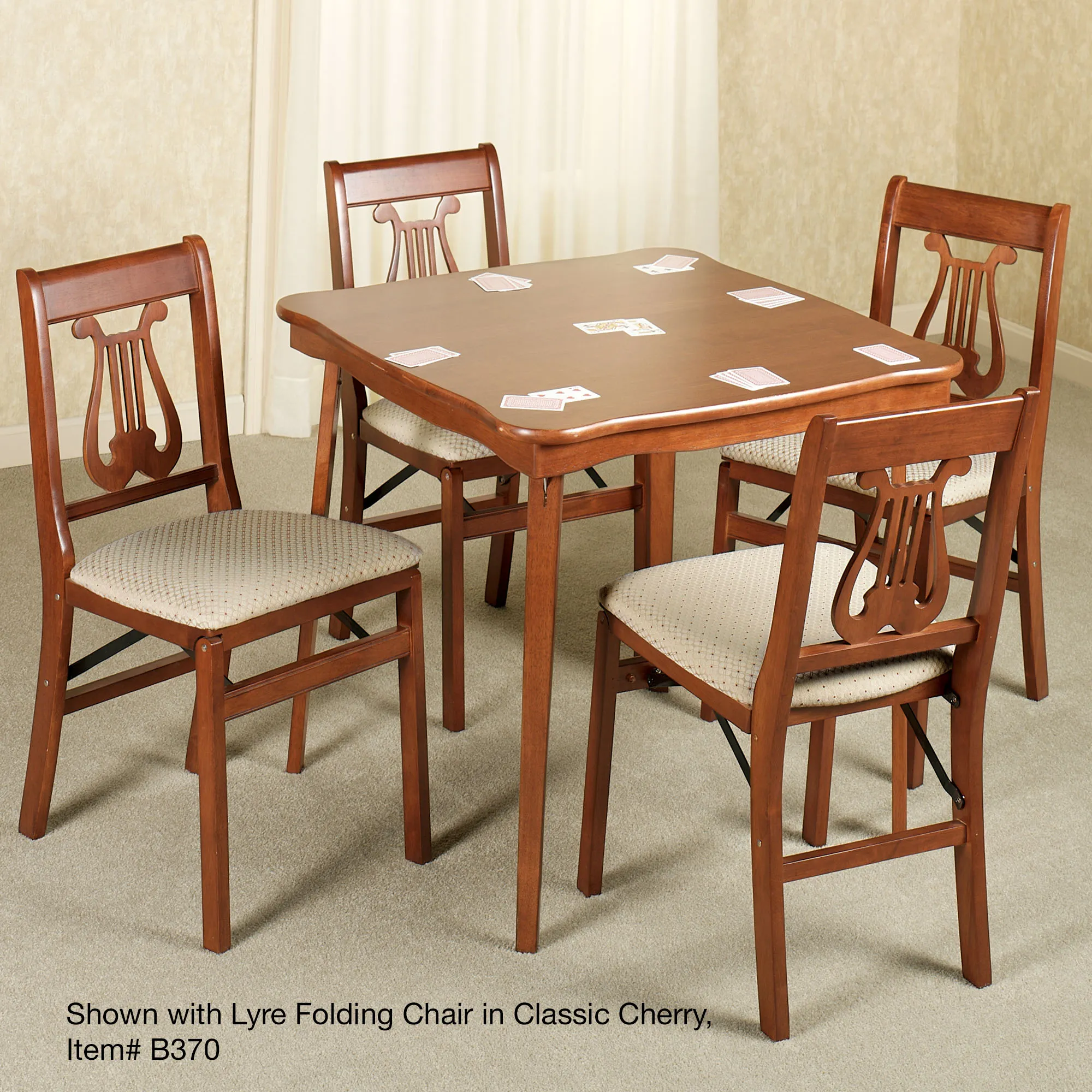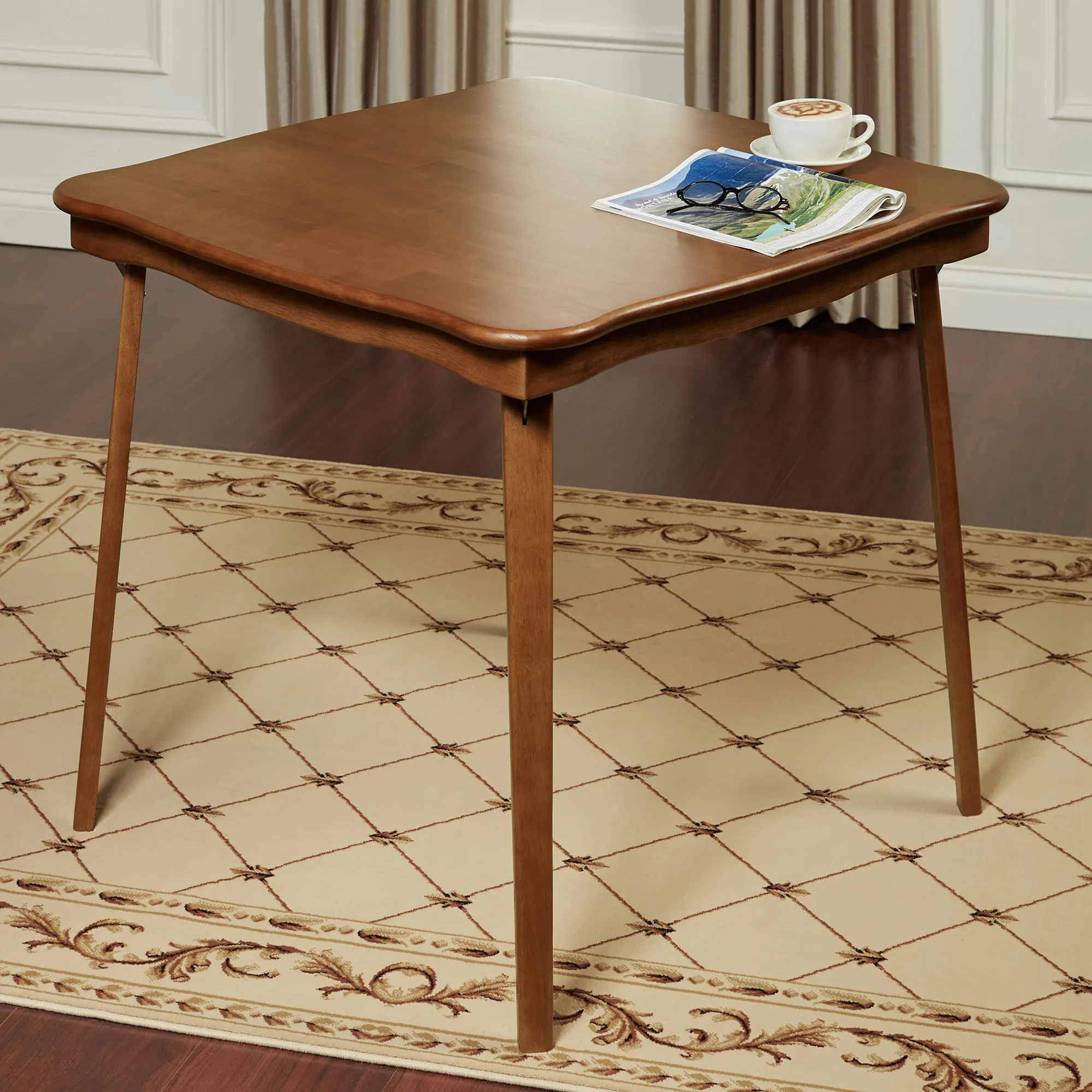 The compact Scalloped Edge Folding Card Table by Stakmore has an on-the-spot convenience that comes in very handy for those sudden card games and social visits. Handcrafted, hardwood table folds flat to an easy-to-store 3"D. Weight capacity is 150 lbs. Measures 32"sq.x29"H; weighs 34 lbs. Chairs are not included.