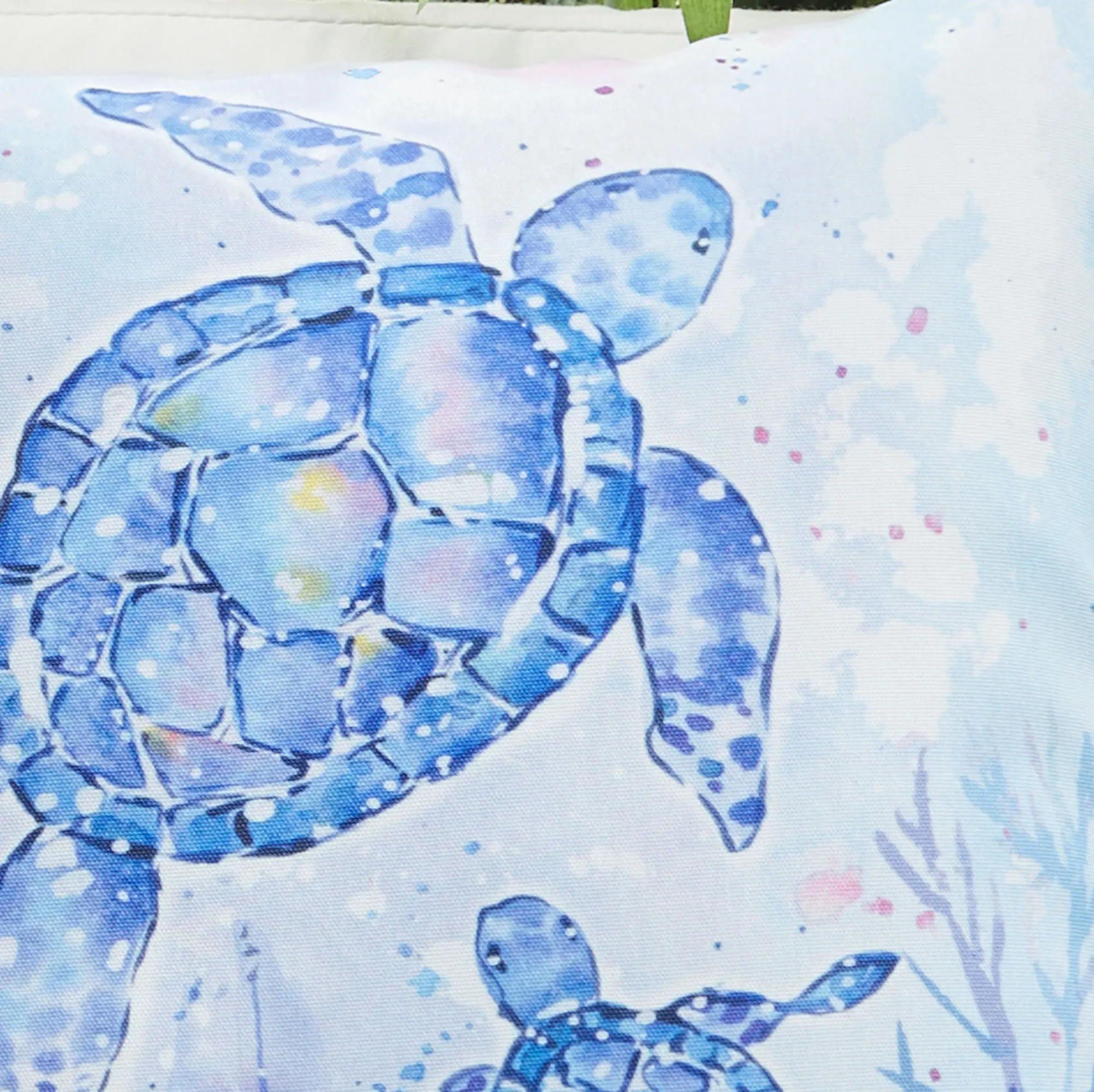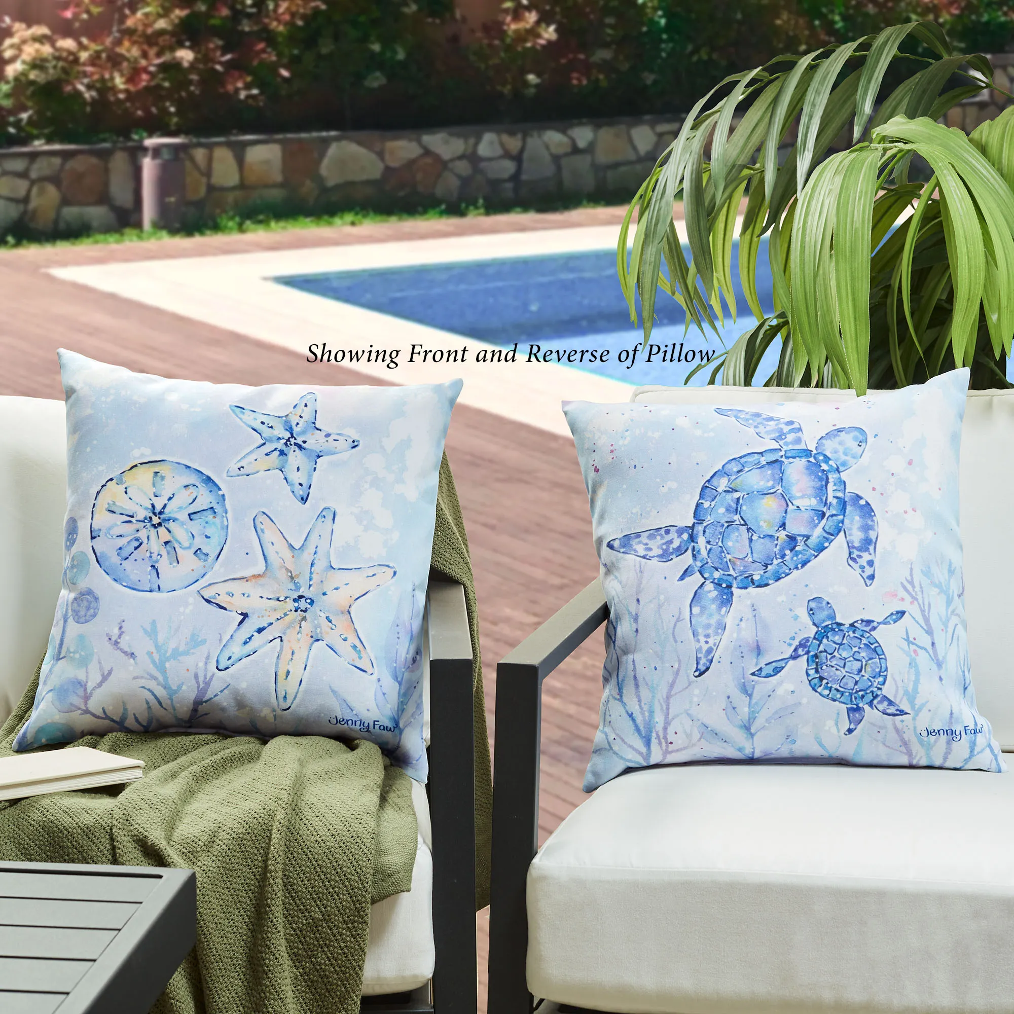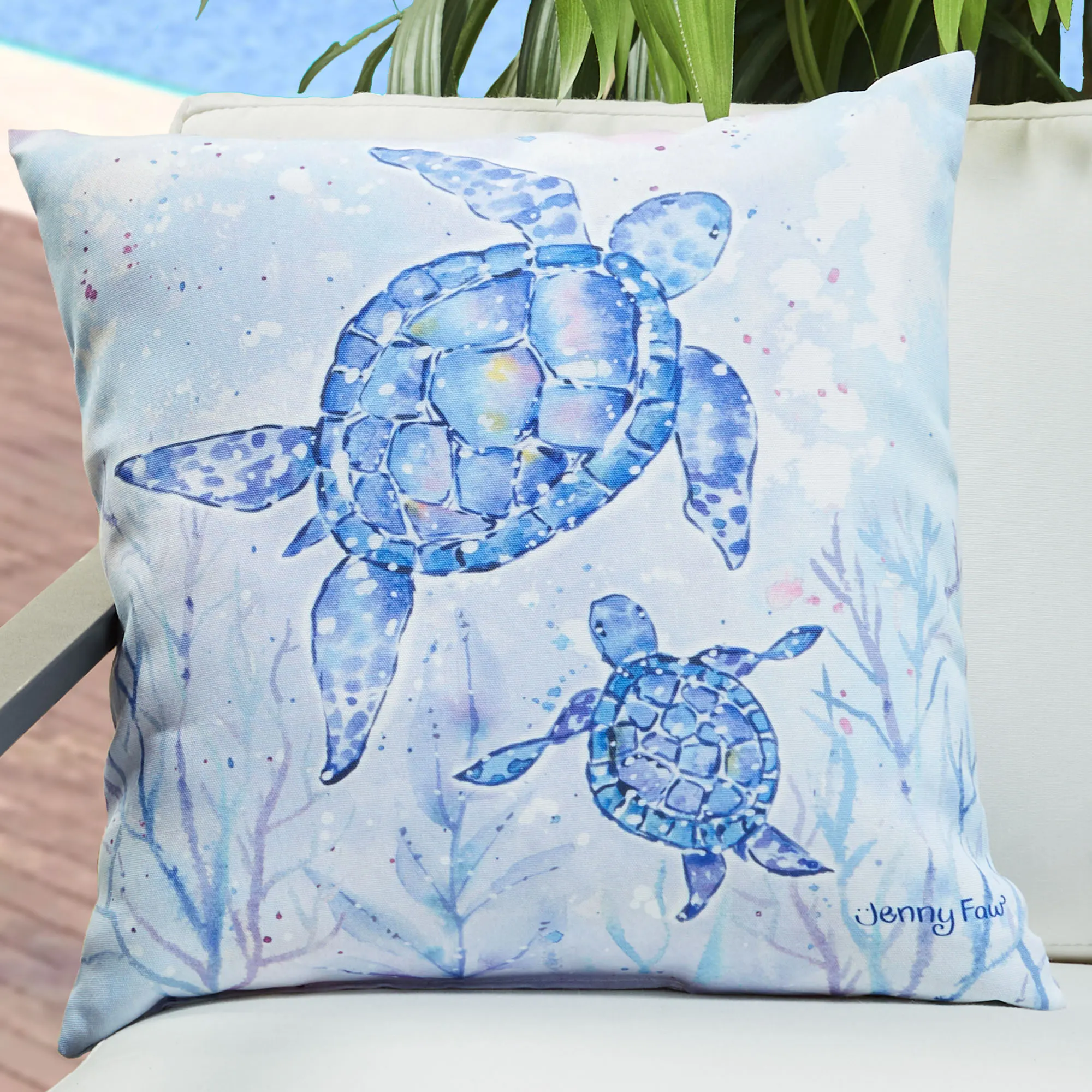 Allow ocean charm to flood your indoor or outdoor space year round with the Climaweave(TM) Sea Creatures II Pillow from Manual Woodworkers(TM). With artwork by (C)Jenny Faw licensed by Courtney Davis, the reversible pillow features two sea turtles on one side and two starfish and a sand dollar on the other, all floating through a dappled coral reef, seaweed, and bubbles. Soft shades of blue, white, pink, purple, yellow, and melon fill the printed coastal scenes. The tailored 18" square pillow has a durable, fade- and moisture-resistant polyester design with polyester fiber fill. Spot clean. Imported/USA.