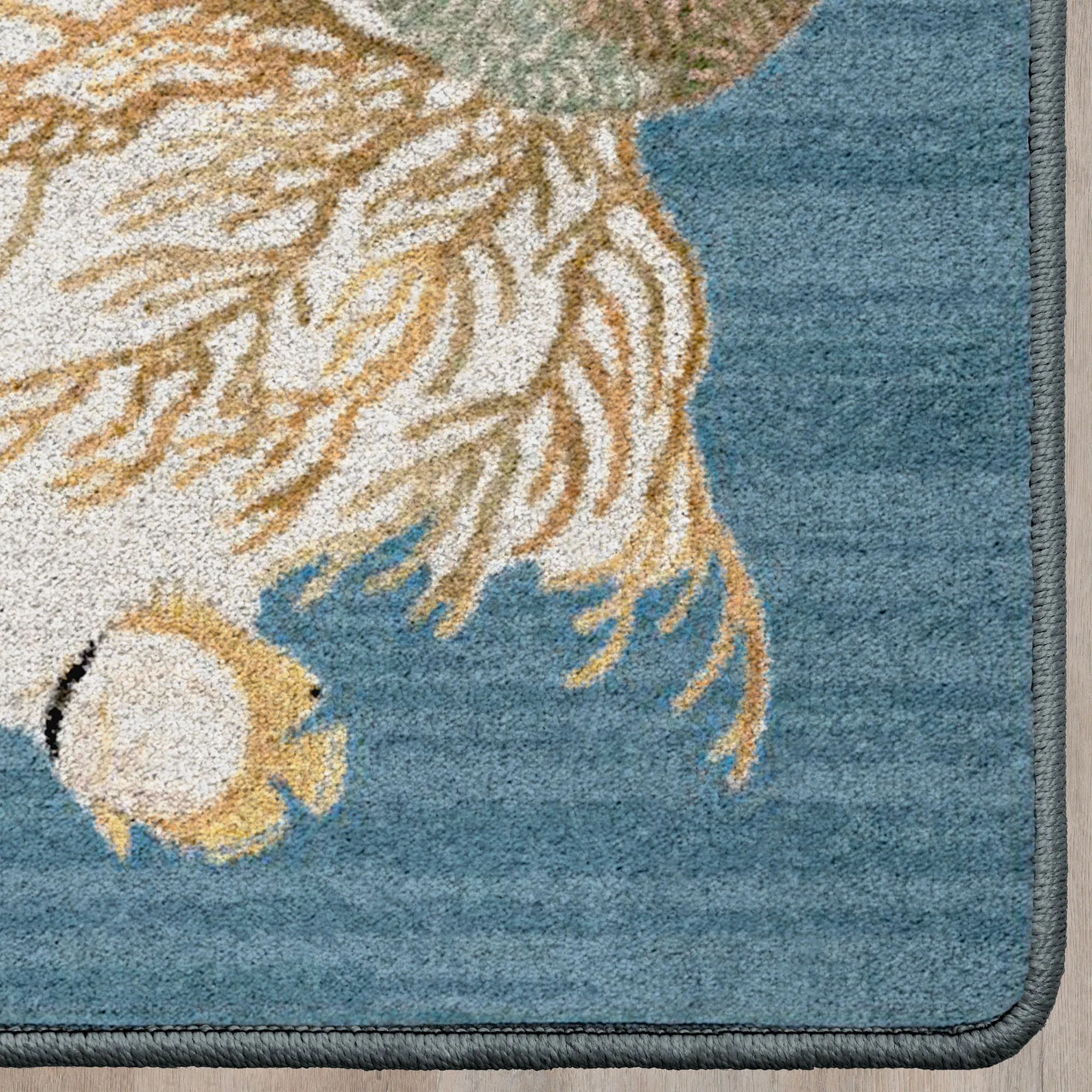 Sea Fans sway in the deep blue sea, providing homes for exotic fish, just as they provide tropical style to your space. Proudly made in the USA, the .3" thick, power-loomed rug features a kid- and pet-friendly, stain- and warp-resistant, and durable power-loomed nylon design backed in a polypropylene/polyester blend. With a Guy Harvey(C) signature in the corner, the tropical rug features a medium blue striped border surrounding a realistic coral reef frame and light cream center. Soft hues of off-white, black, butter, taupe, blue, camel, latte, gold, and coral fill the underwater scene. We recommend professional cleaning by a rug cleaner.