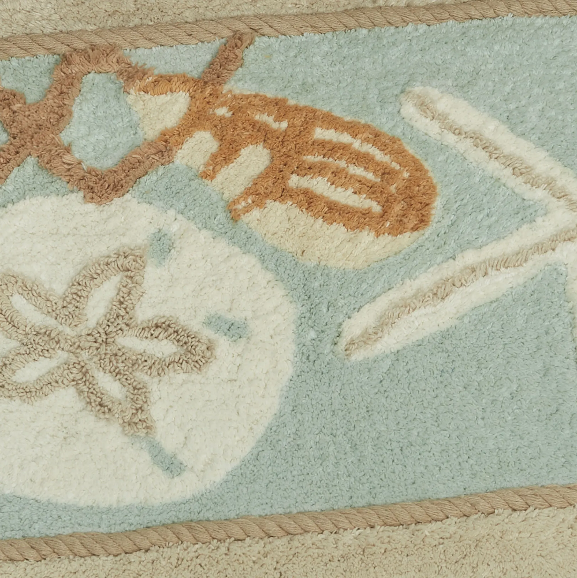 A starfish, sand dollar, and net are displayed on the Sea Glass Coastal Bath Rug. Made of cotton, this tufted rug, .5" thick, has twist cording and includes shades of tan, white, beige, sienna, and light blue. The spray latex backing has nonskid properties. Machine washable. Made in India.