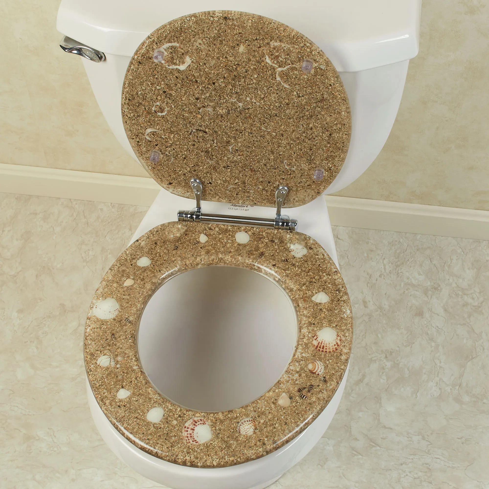 The Sea Isle Coastal Decorative Toilet Seat is a practical way to add to your beach theme. This handpainted resin toilet seat features brown sand and shells. This easy-to-install seat fits most standard sized fixtures. Metal hinges are chrome-plated. Distance between the bolts is 5.5". Measures 14.75"Wx16"L. Clean with a soft, damp cloth using mild detergent. Do not use abrasive cleaners.