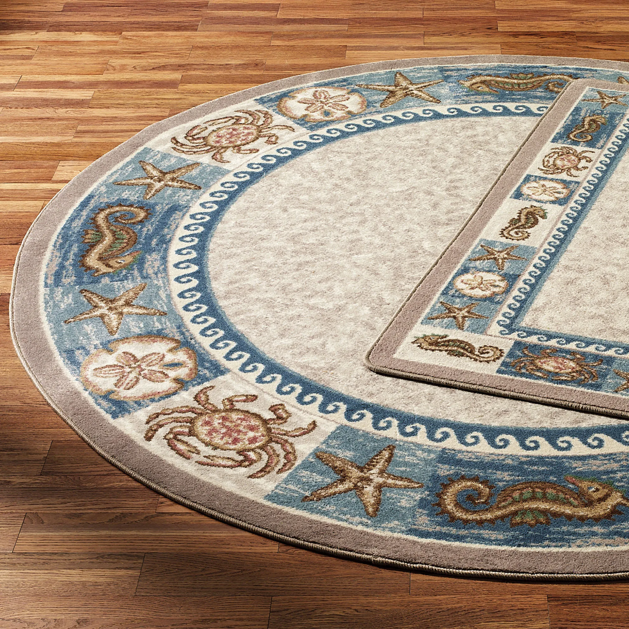 Sea Life Area Rugs from Milliken(R) are machine-tufted from nylon. Fields of sandy beaches are framed by waves and borders of crabs, starfish, sand dollars, and seahorses. Coastal area rugs have a soft 3/8" thickness. We recommend professional cleaning by a rug cleaner. USA.