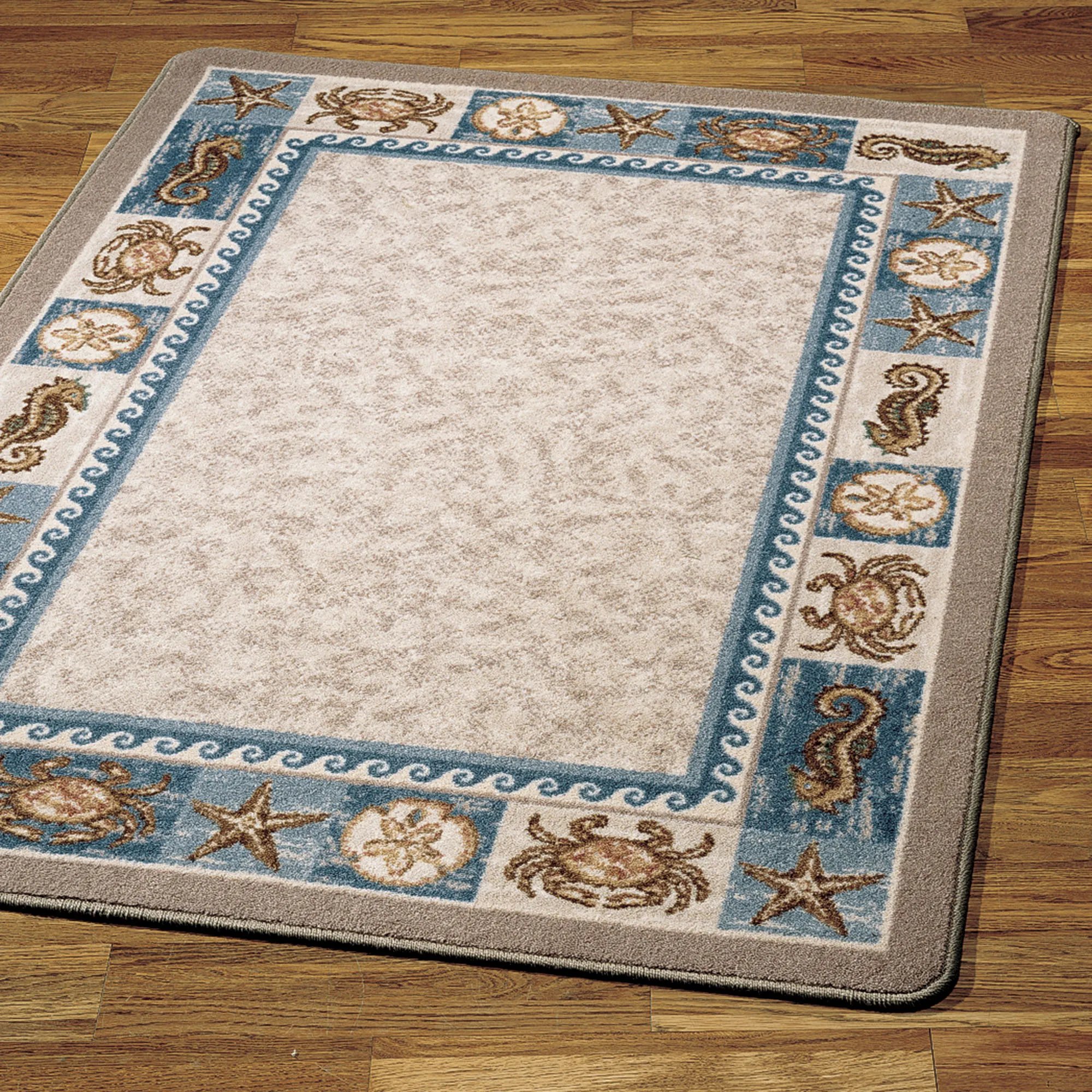 Sea Life Area Rugs from Milliken(R) are machine-tufted from 100% nylon in the USA. Fields represent sandy beaches framed by waves. Blocks with crabs, starfish, sand dollars, and seahorses form a border that precedes a solid frame. Colors are oyster white, bleached sand, dark pebble, light marina, and captain's blue. Area rugs have a soft 3/8" thickness. Soil- and stain-resistant rugs are treated with BioCare(R) to inhibit odor causing mold and mildew. Design may vary by size.