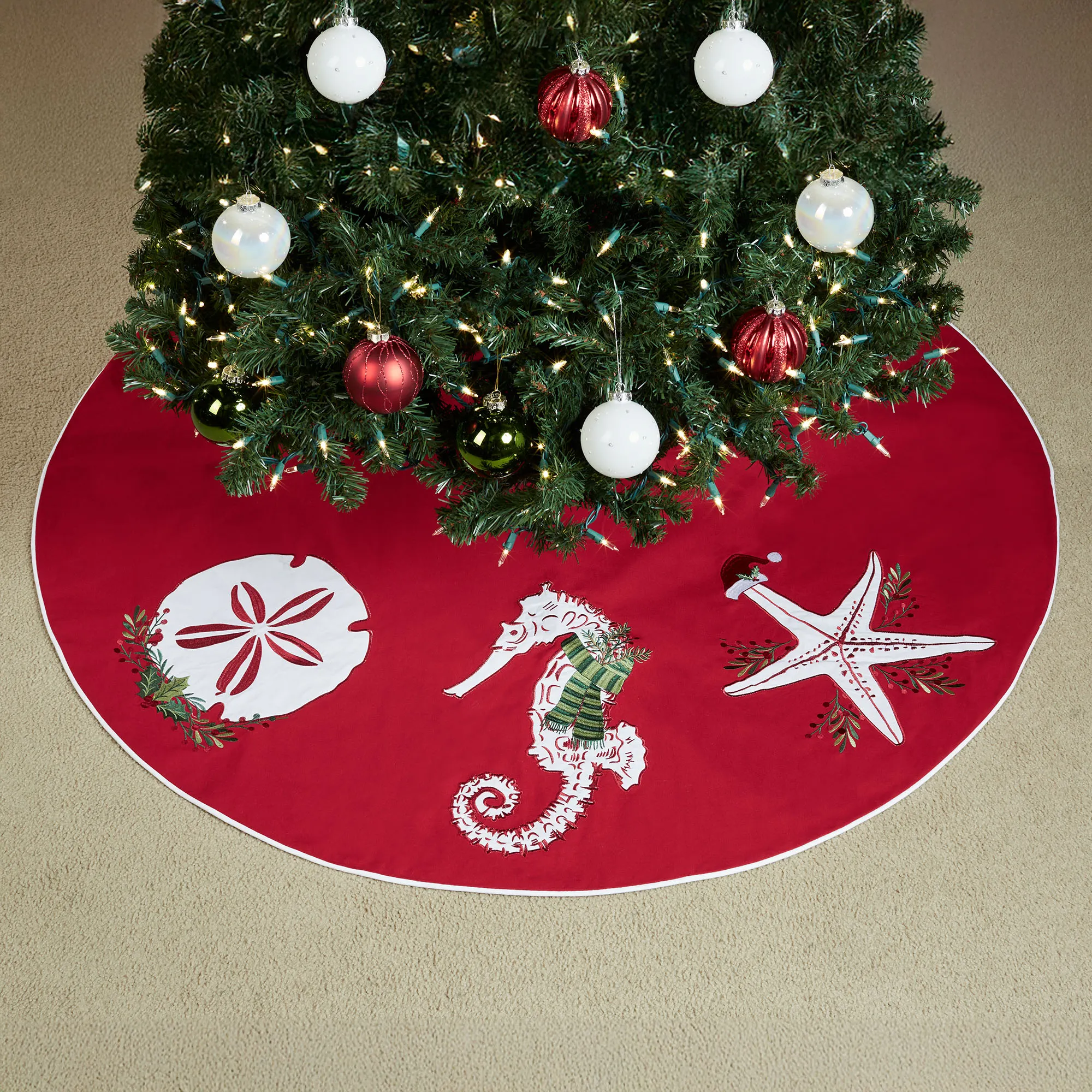 Celebrate the holidays with festive Sea Life from beneath the waves. White applique coastal designs decorate the red cotton tree skirt, complete with embroidered greenery and red berry details. The sand dollar sits atop a greenery swag with holly leaves, the seahorse wears a green striped scarf, and the starfish wears a Santa hat; tie closure. The coastal Christmas tree skirt measures 54" dia. Spot clean only. Imported.