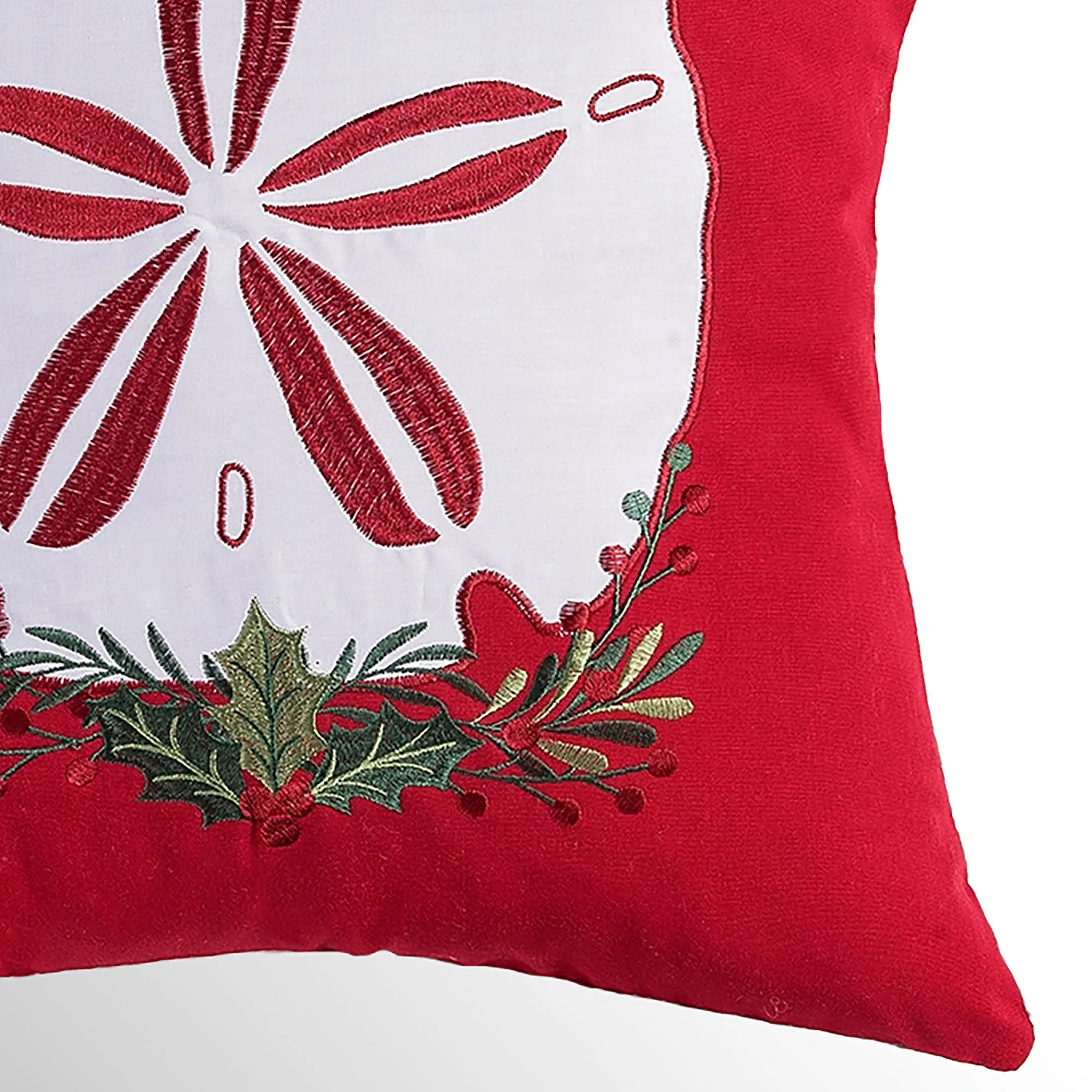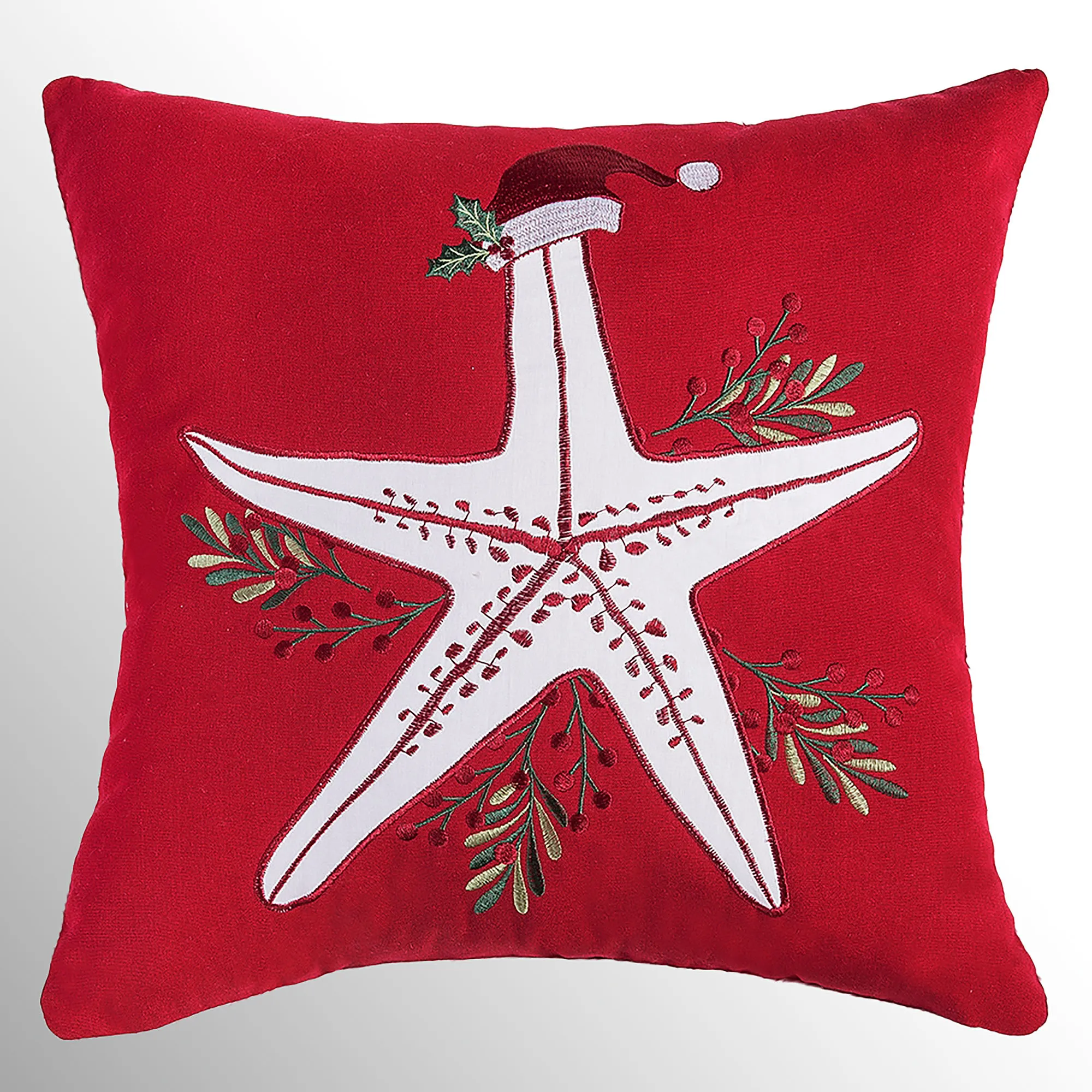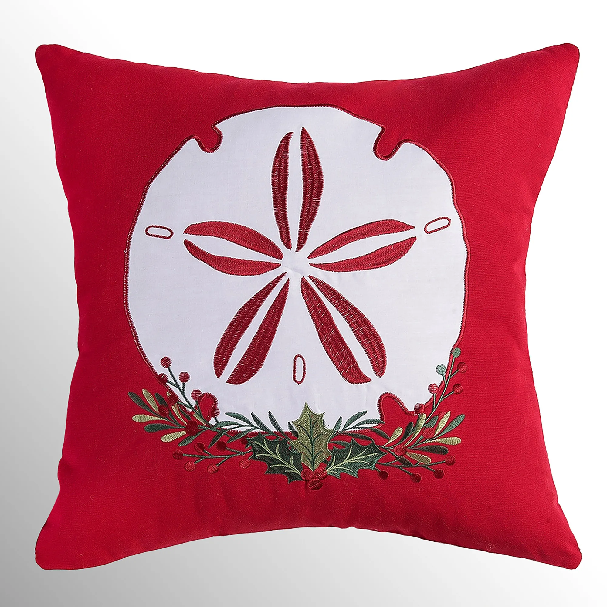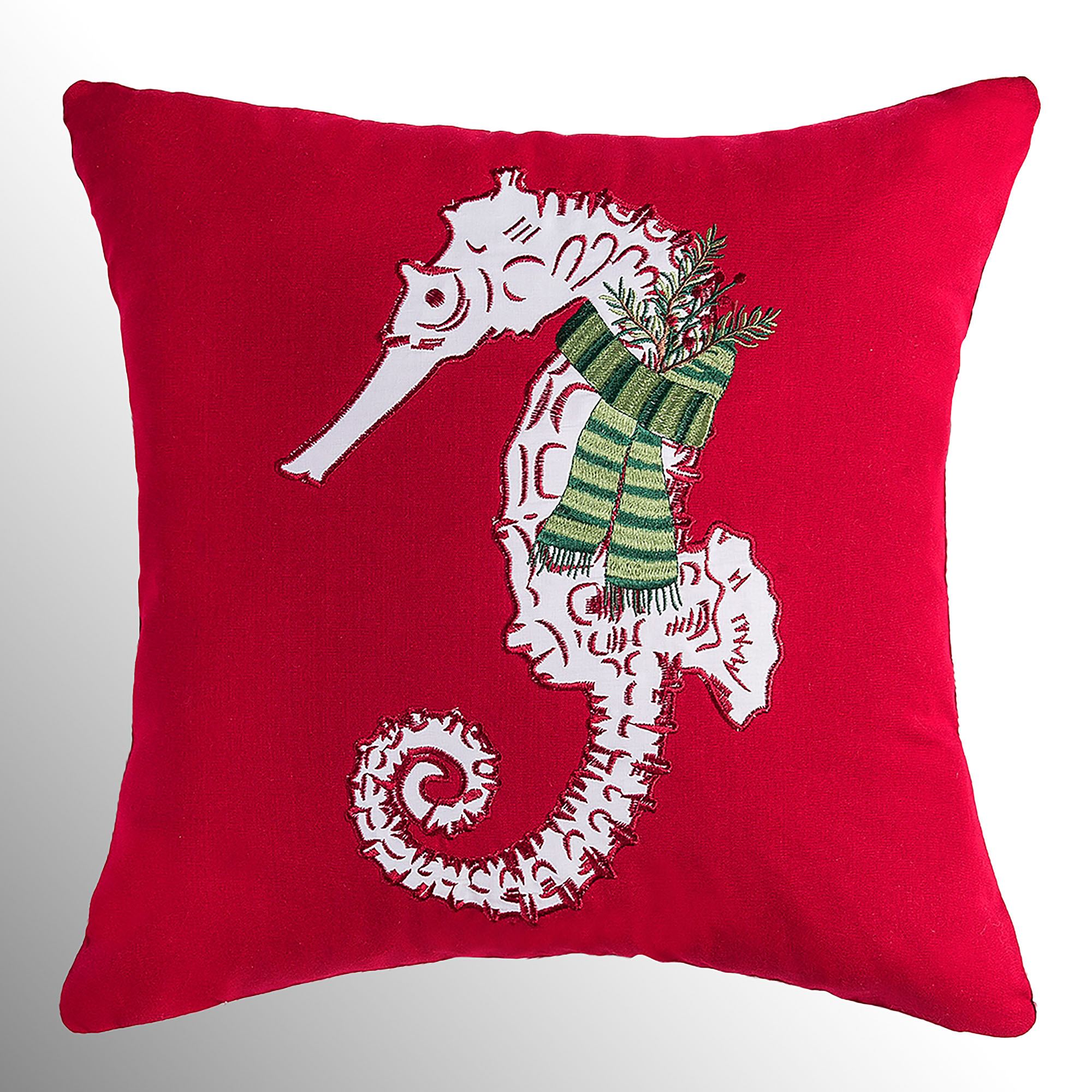Celebrate the holidays with festive Sea Life from beneath the waves. A white applique coastal design decorates each red cotton square pillow beside embroidered greenery and red berries. Sand Dollar also features a greenery swag with holly leaves. Seahorse wears a green striped scarf. Starfish wears a Santa hat. Piped edges, a hidden zipper closure, and polyester fill complete each 18" square pillow. The coastal Christmas pillows are sold individually. Spot clean only. Imported.