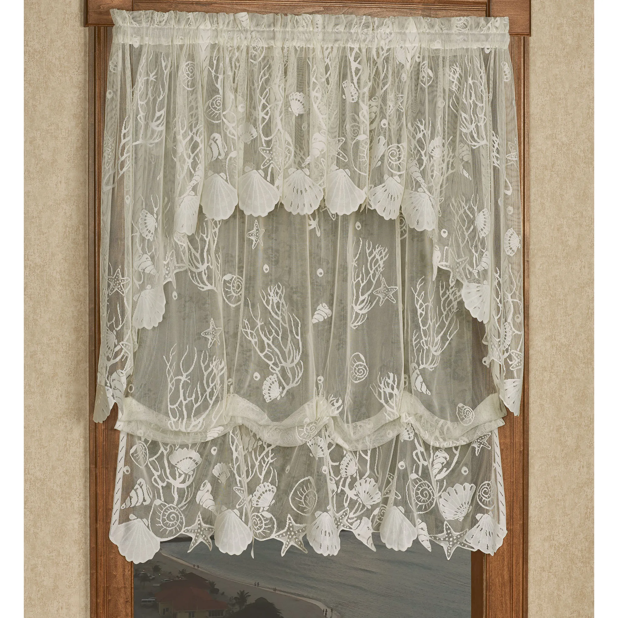 Various Sea Treasures are beautifully scattered across this coastal sheer lace window treatment. Made of fine-gauge jacquard, polyester lace, these window accents have seashells, starfish, and coral motifs along with hand-cut, scalloped bottom edging. Rod pockets are 1.5". Specify Balloon Shade or Curtain Panel; sorry, the Swag Valance Pair and Tailored Valance are no longer available. Balloon Shade is adjustable; measures 56"Wx63"L. Swag Valance Pair is 56"W. Tailored Valance is 56"Wx18"L. Curtain Panel is 56"W. Machine washable. Imported.