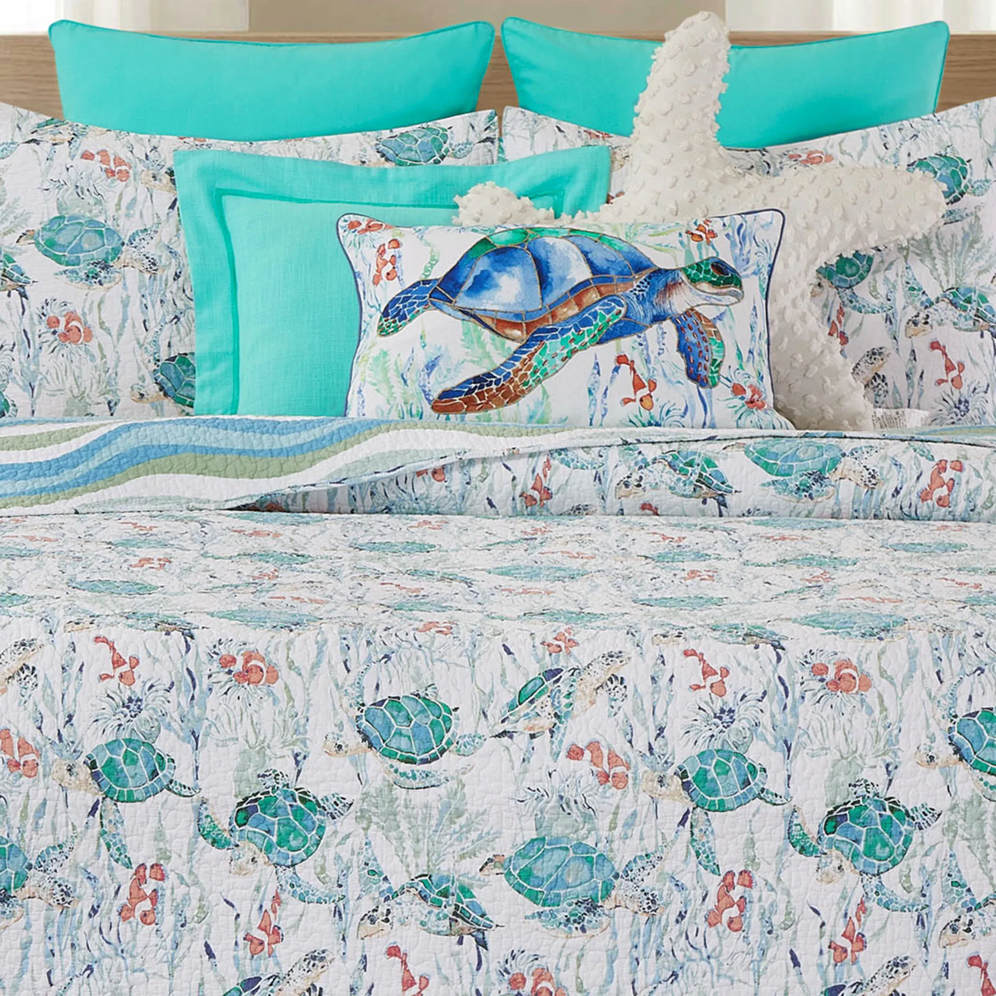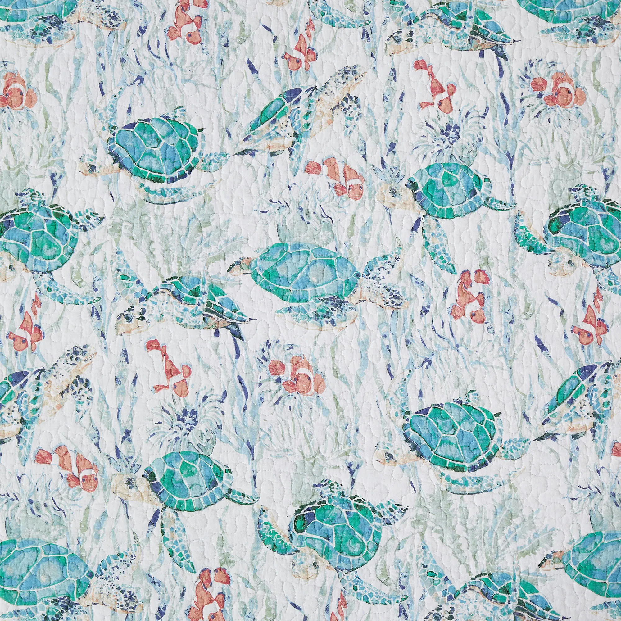 Envision magical waters with the Sea Turtle Cove Coastal Bedding. The Mini Quilt Set includes a quilt and sham(s). The cotton quilt features printed sea turtles, clownfish, and seaweed designs in shades of blue, green, ember glow, aqua, and white on a white vermicelli-quilted background. Quilt reverses to printed wavy line designs; fill is cotton/polyester. Machine washable. Imported. Sorry, the starfish pillow is no longer available.