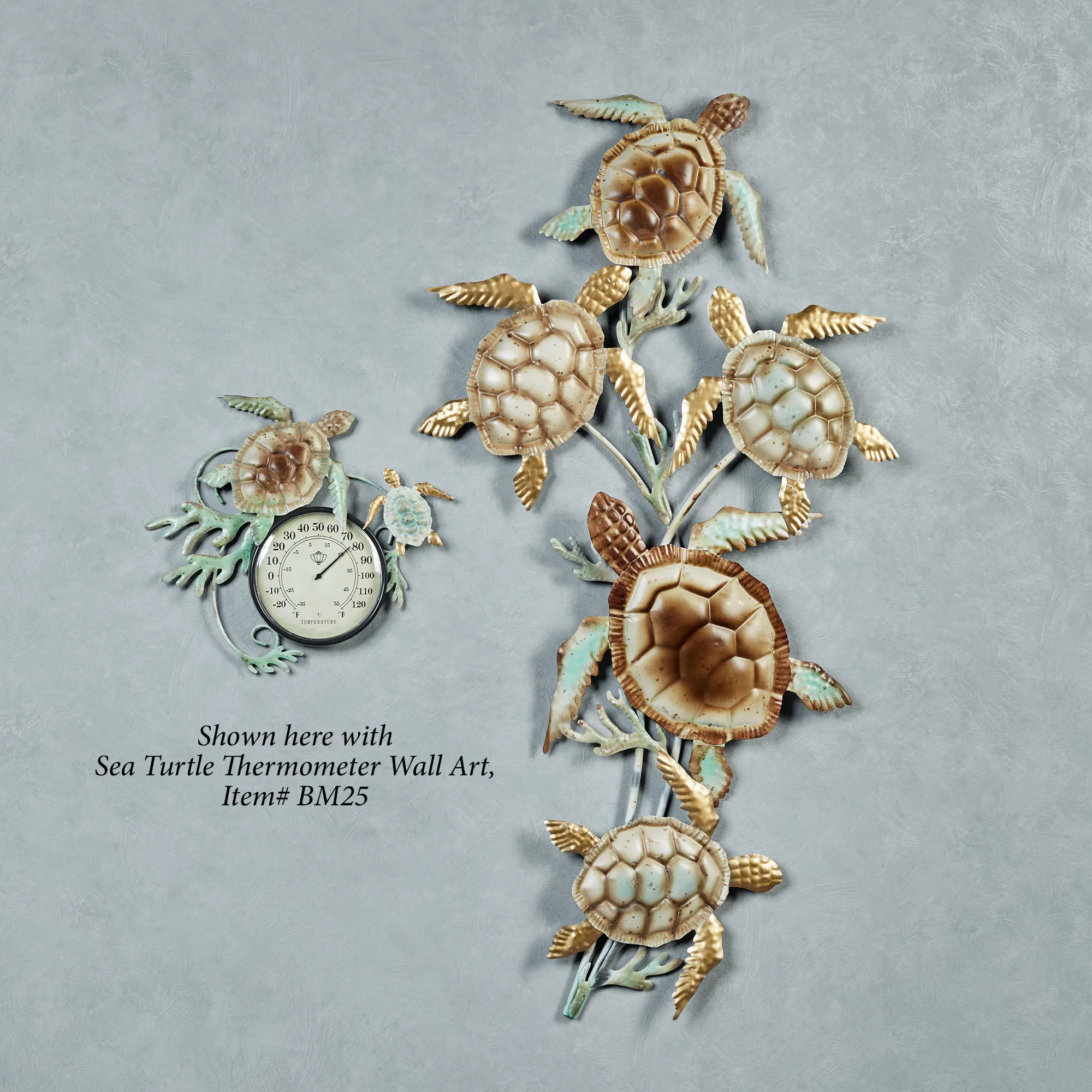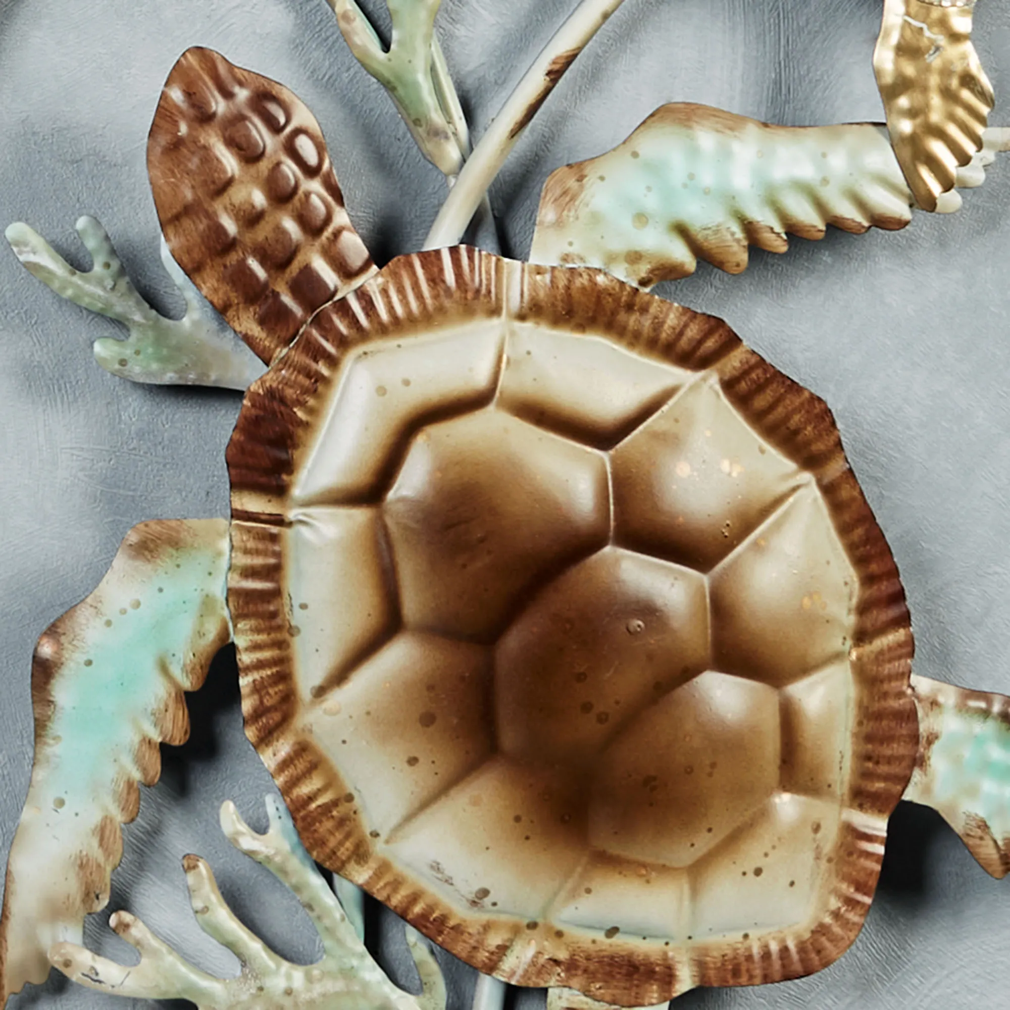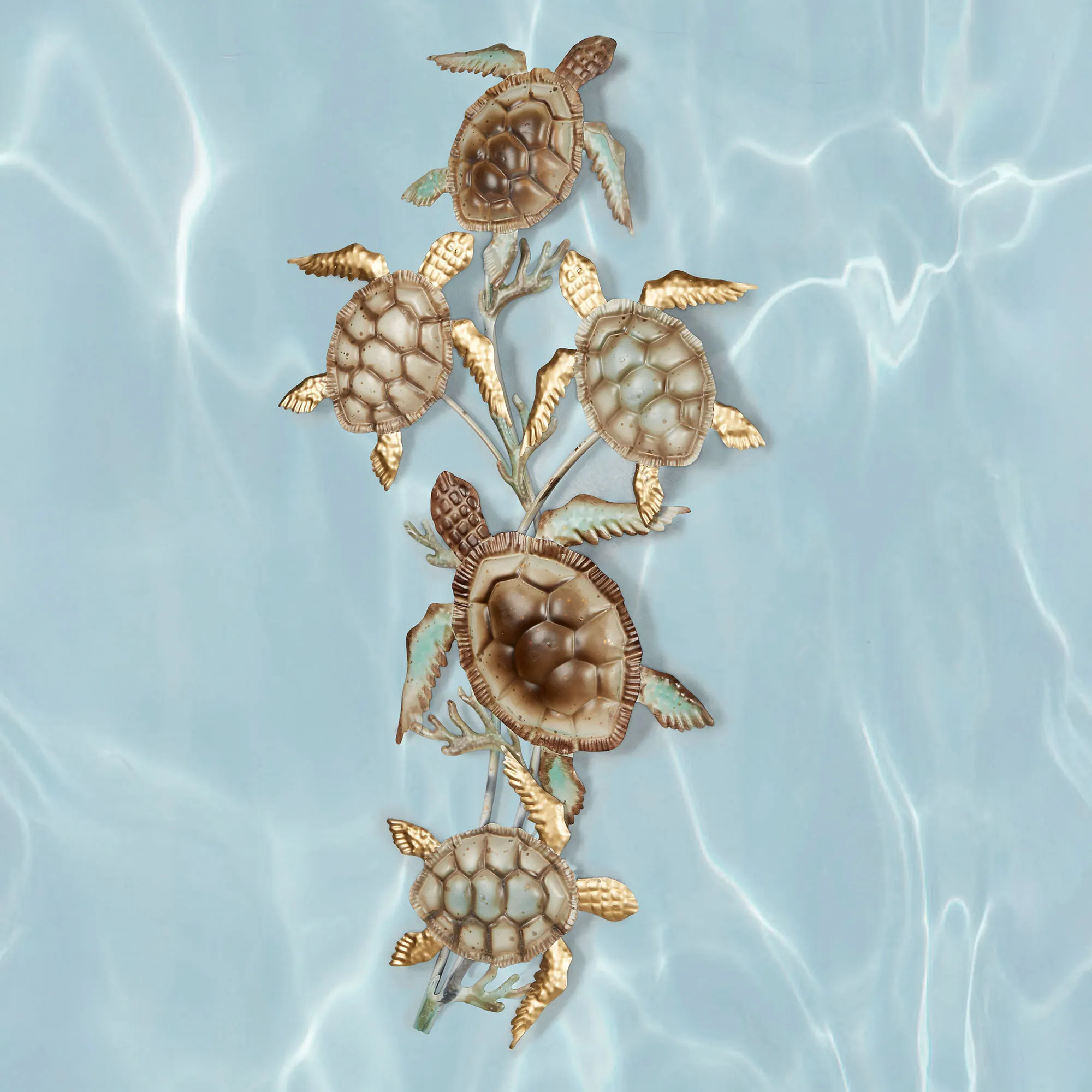 Five Sea Turtles Swimming through the reef transform your indoor or outdoor space year round into an undersea oasis. Crafted from metal, this wall art features powder-coat hues of aqua, blue, green, ivory, and brown. Sea turtle wall art measures 24"Wx2"Dx44"H.