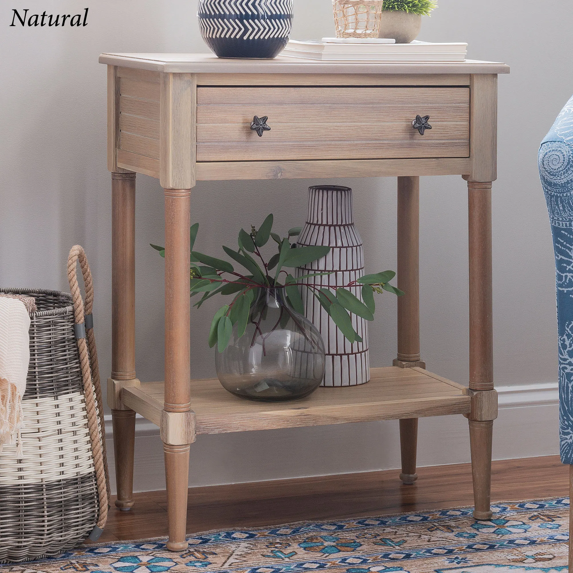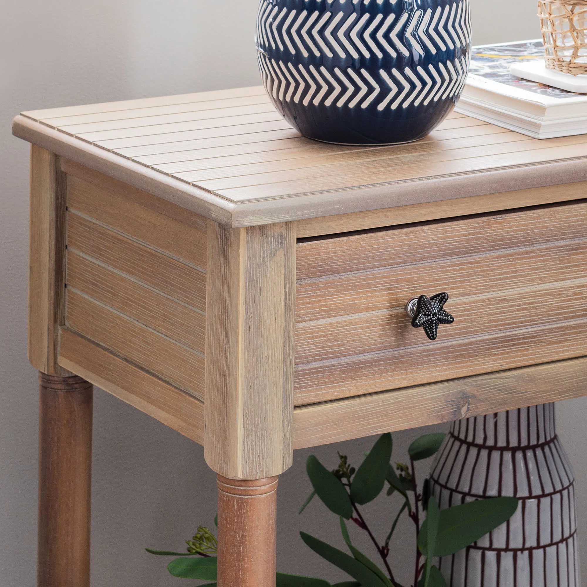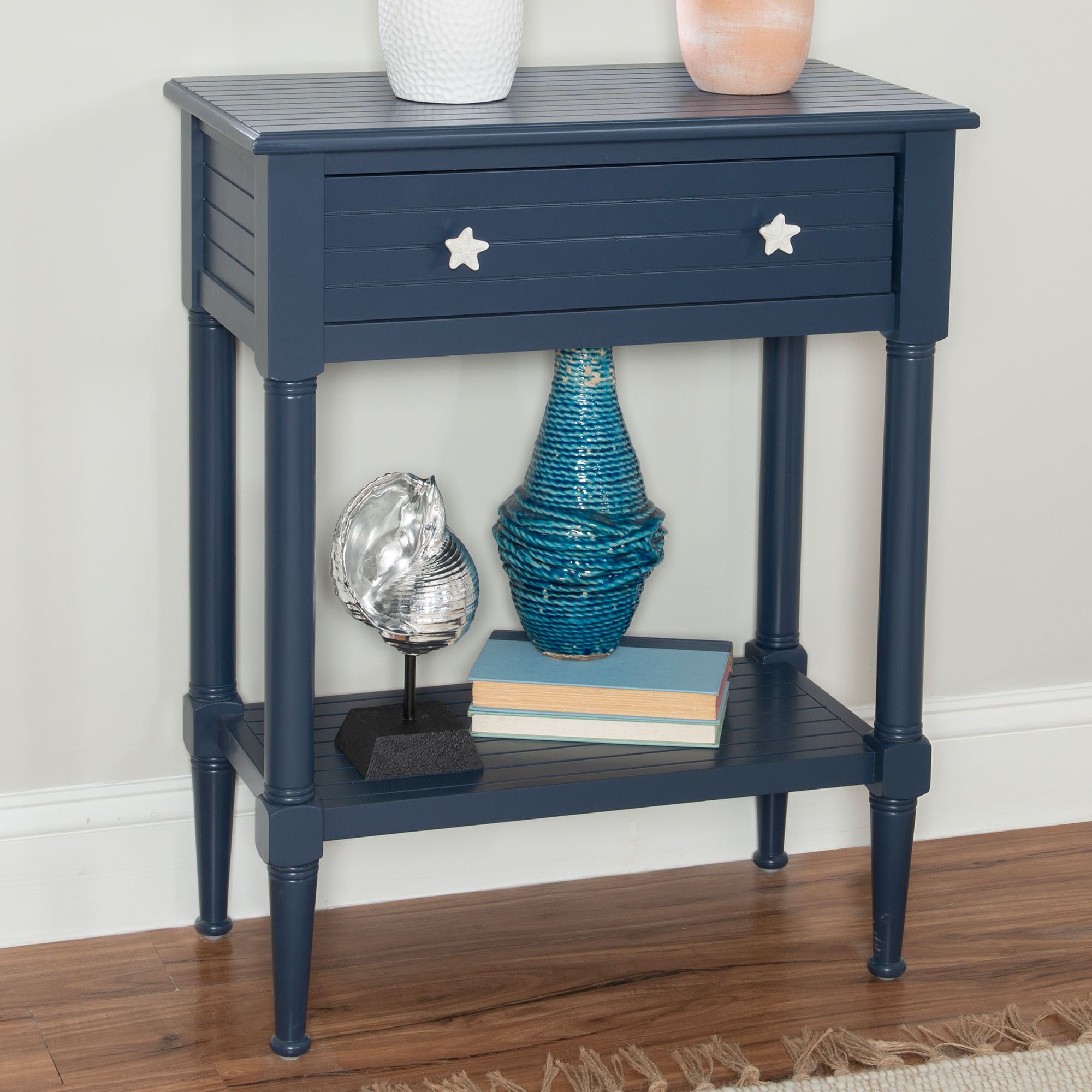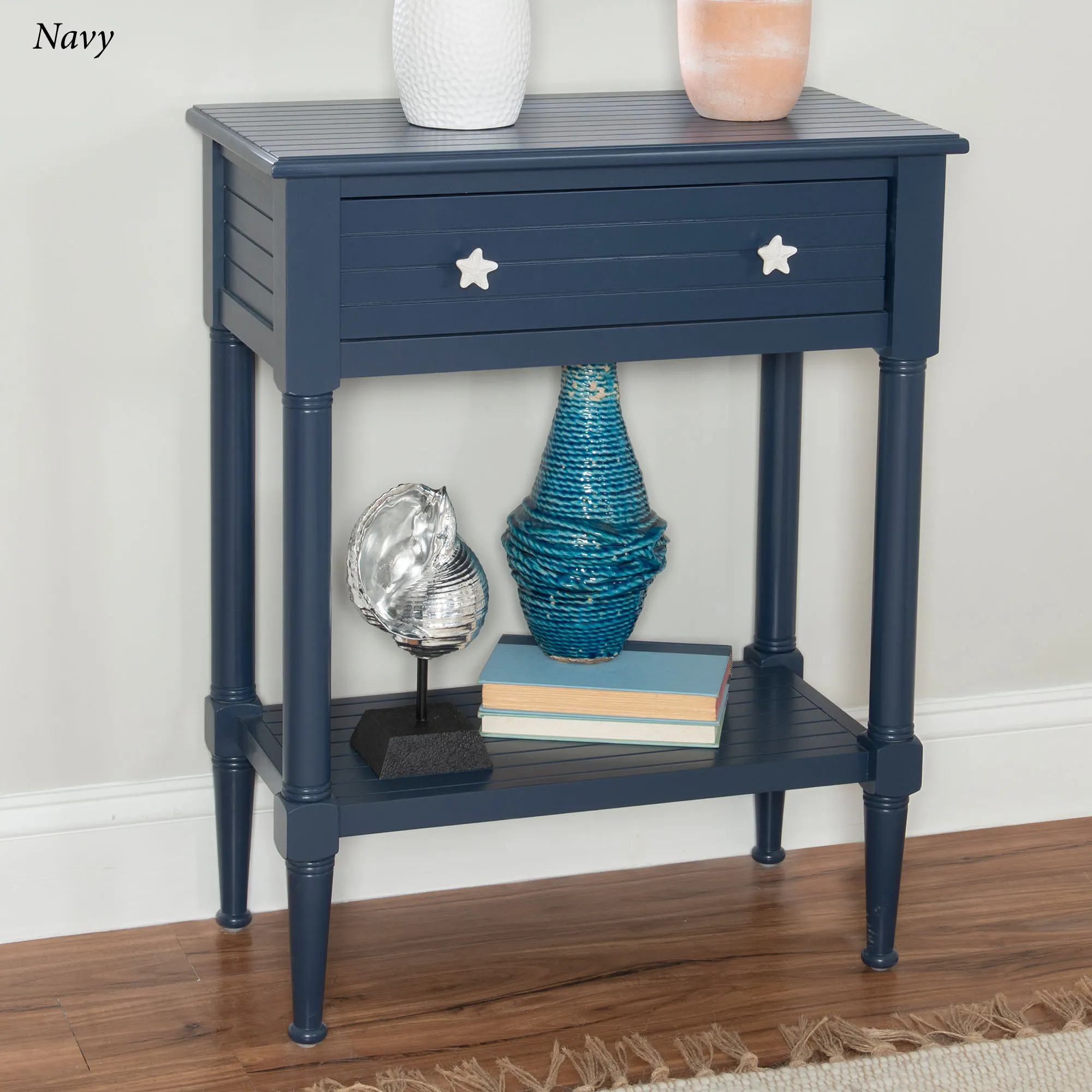 Enjoy the coastal style of the Seaboard Accent Table. This wooden accent table has a slatted beadboard design. The bottom shelf is perfect for display; the drawer has metal starfish knobs and is 18.25"Wx9"Dx3.25"H. Navy and White have a painted finish with white drawer knobs. Natural has a stained finish with rustic black/silver drawer knobs. Overall, the accent table measures 24"Wx13"Dx30"H; weighs 20 lbs.