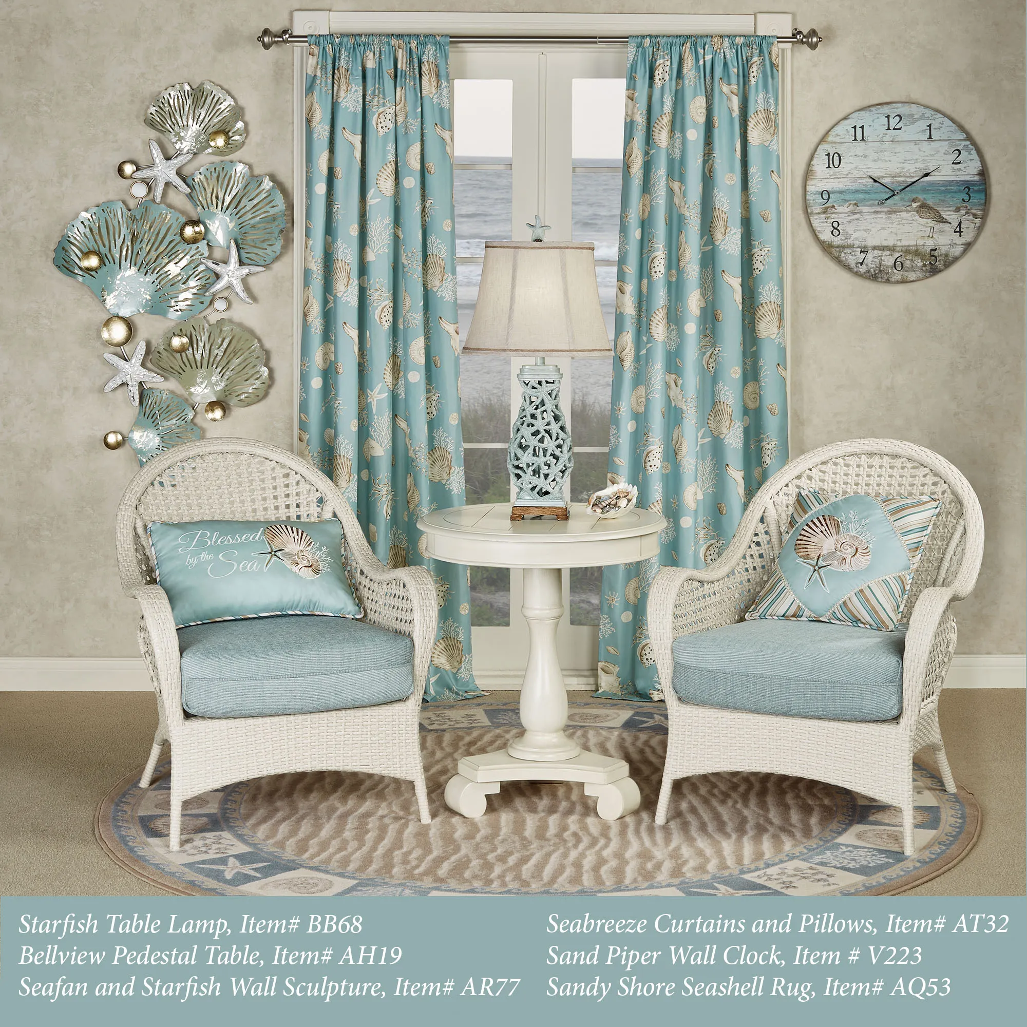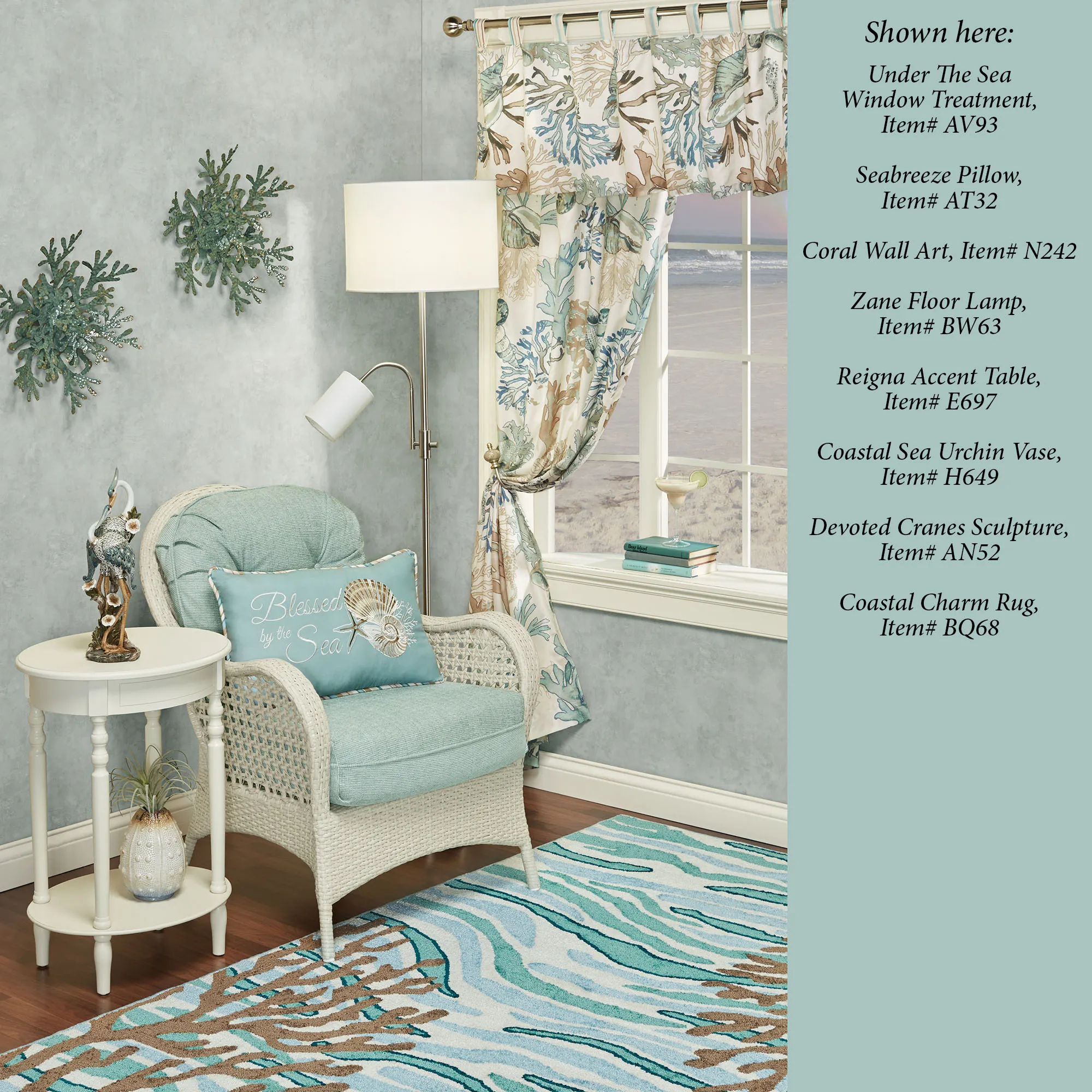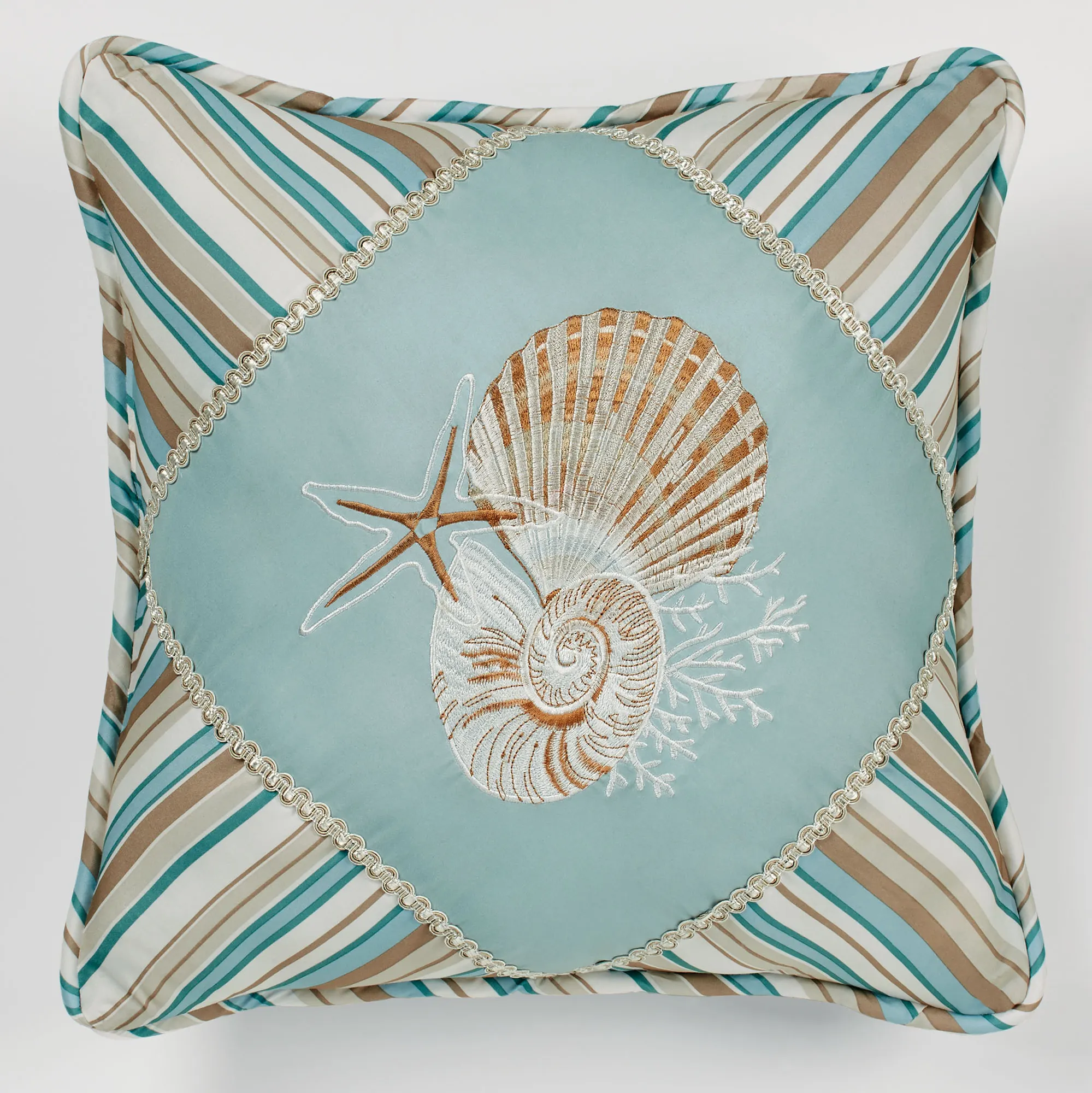 You can almost feel the coastal winds when you decorate with the polyester microfiber Seabreeze Pillows. The two embroidered pillows have shades of brown, natural, cream, aqua, ivory, and teal. The pieced Embroidered Square Pillow, 18", has embroidered sea motifs on aqua, striped corners, gimp trim, and piped ends. The piped Rectangle Pillow, 14"x22", has the words "Blessed by the Sea" and sea motif embroidery on aqua. The Tailored Square Pillow, 16", has overlapping layers of dark beige designs that resemble shells. Fill is polyester. Spot clean. Imported.