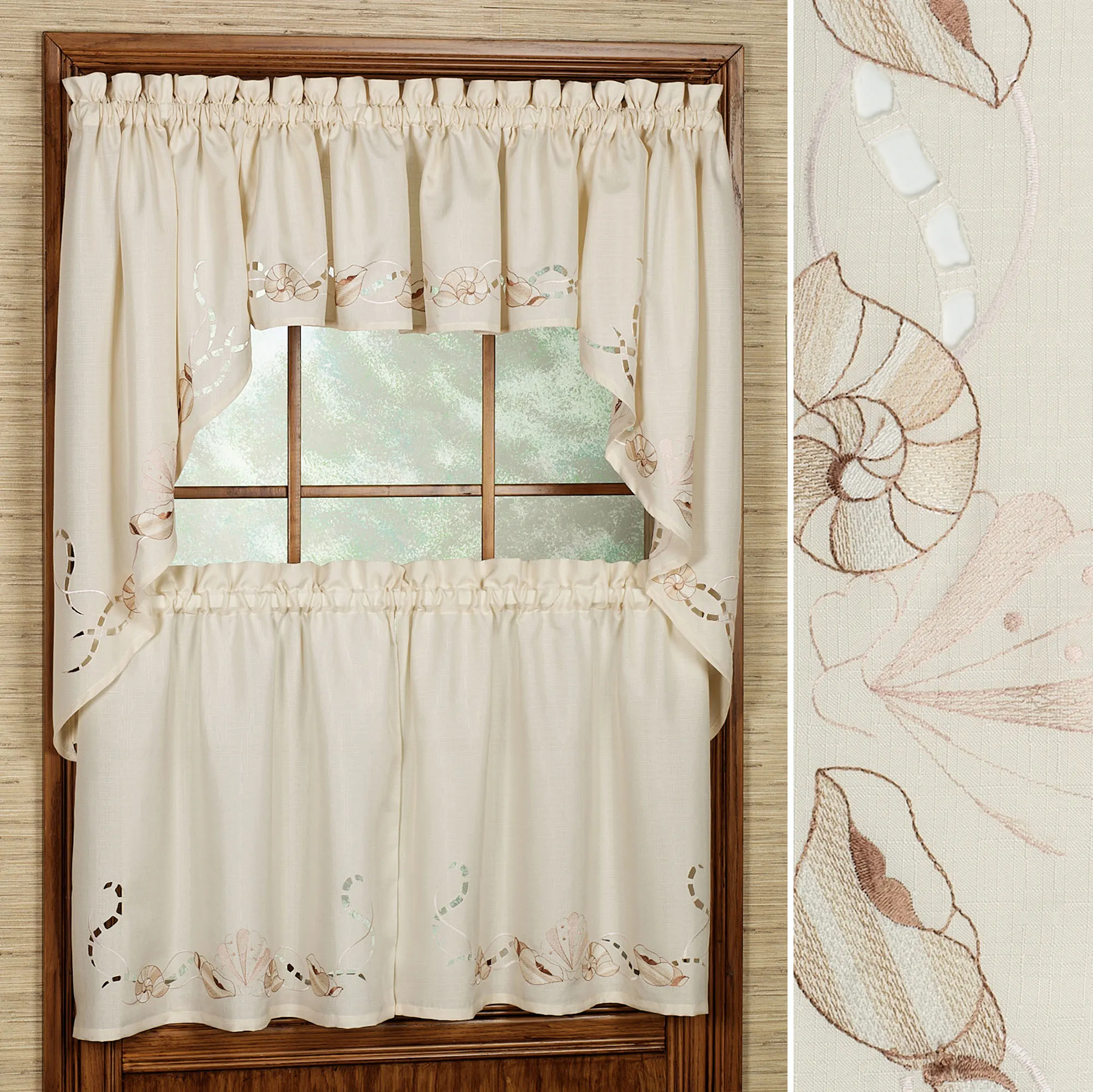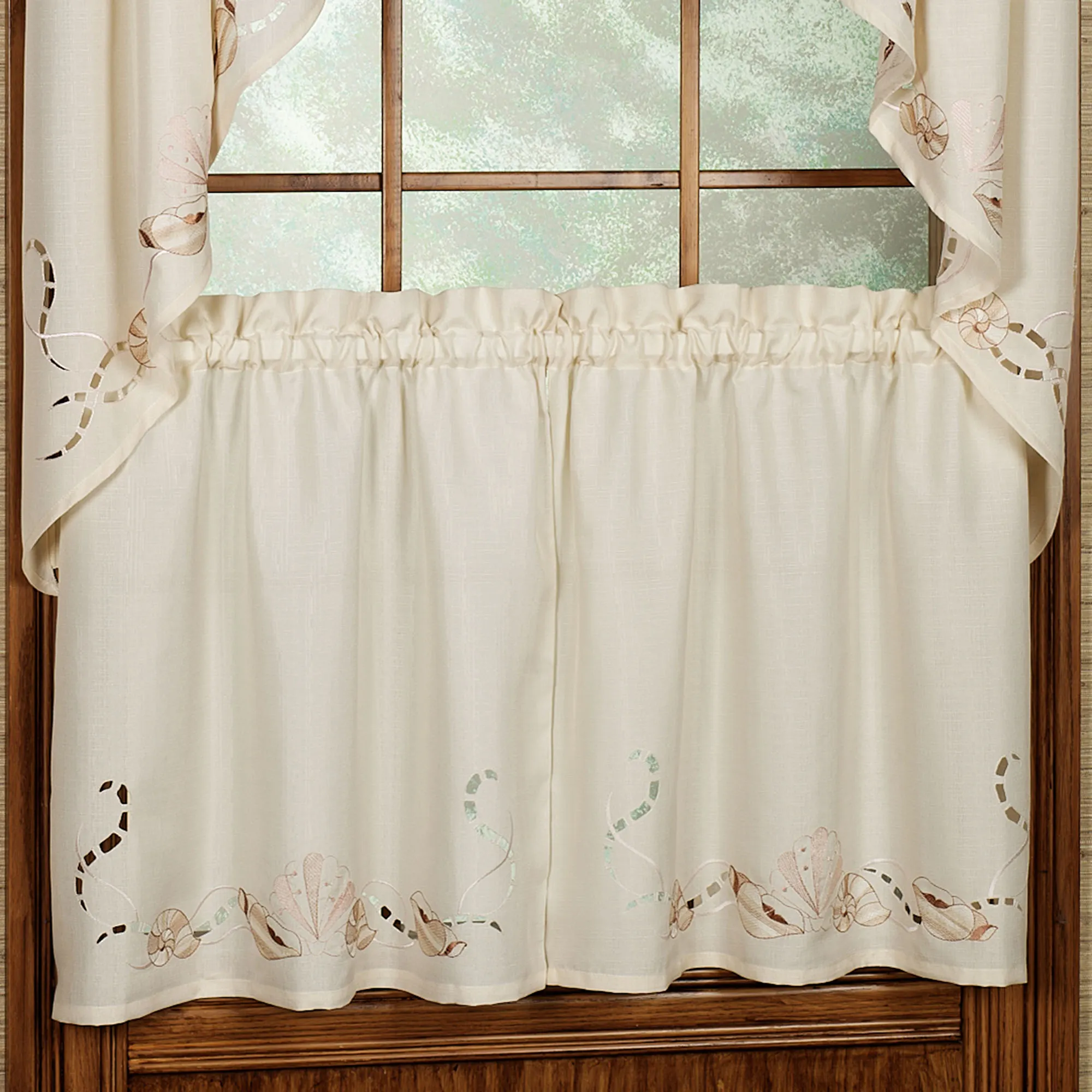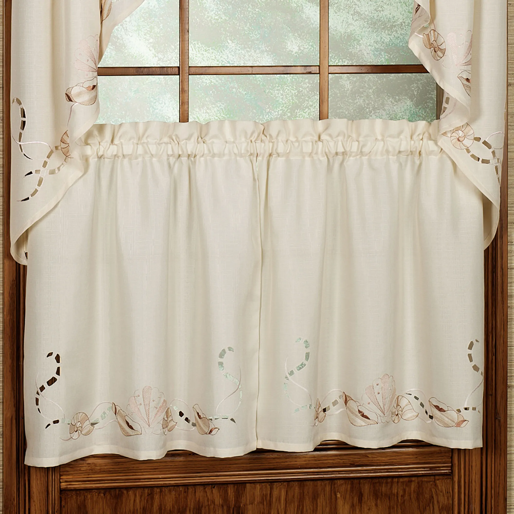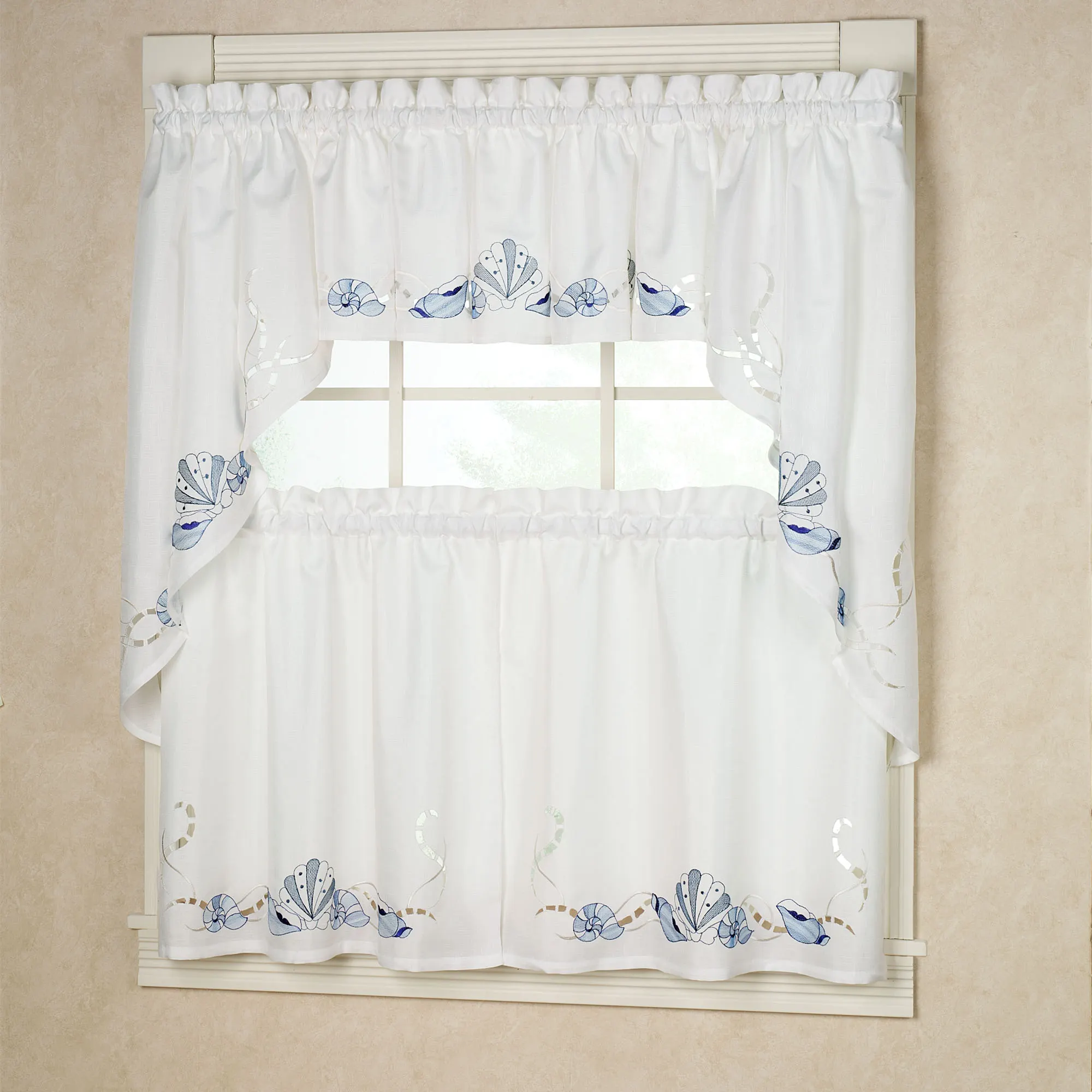 Coastal-themed window accents are solid textured fabric, adorned with a flowing border, embroidered seashells, and cutwork. Specify White or Sand. White has embroidery in varying shades of blue. Sand has embroidery in shades of light coral, brown, and beige.