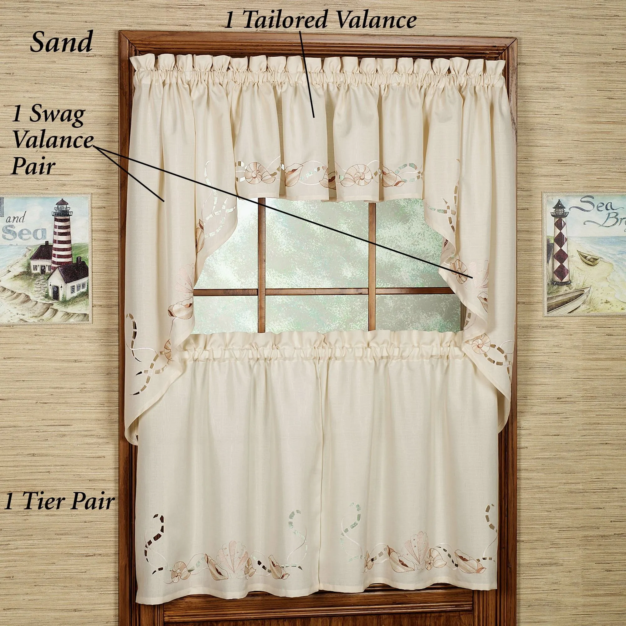 As if buoyed on a fresh coastal wind, the Seabreeze Tier Window Treatment will bring a light, airy touch to any setting. Unlined polyester window accents are textured fabric, adorned with embroidered seashells and cutwork. Specify Tailored Tier Pair or Swag Valance Pair; the Tailored Valance is no longer available. 1.5" rod pockets. Washable. Imported.