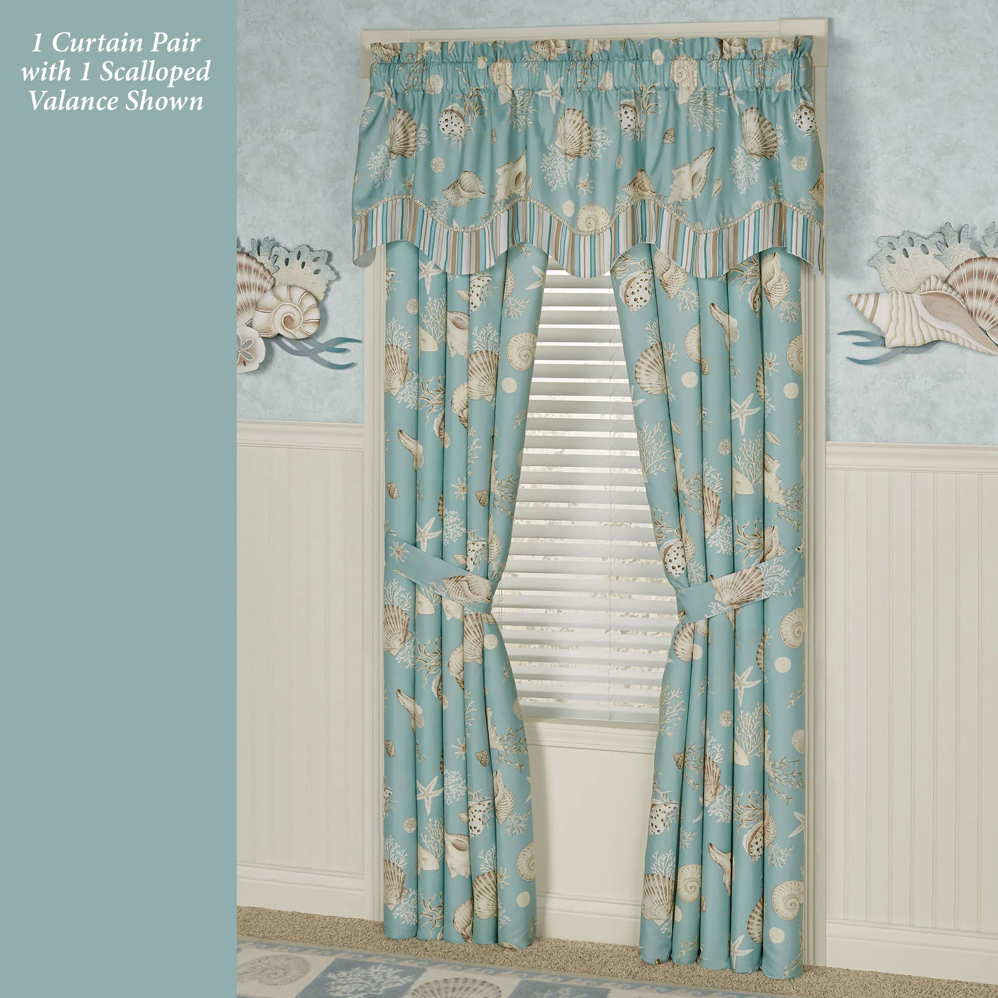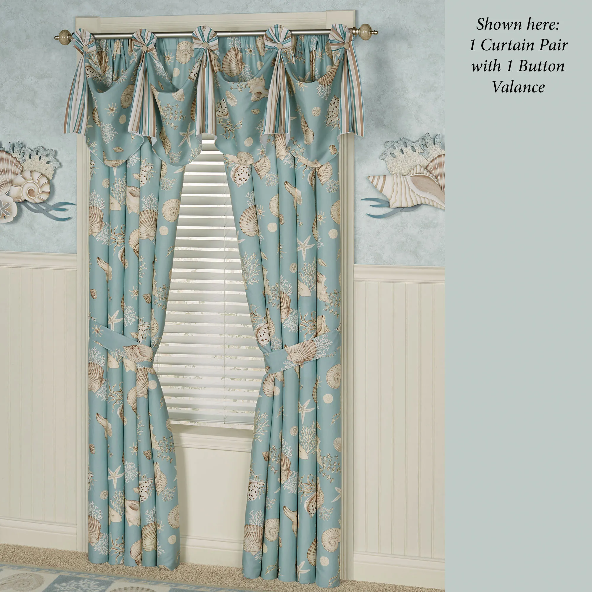 Lined Window Treatments: The tailored Curtains have sea motifs and include reversible tiebacks. Rod pocket is 3". Curtains are available in two lengths. Each Ascot Valance is solid aqua with sea motif embroidery. Rod pocket is 3". The Button Valance has sea motifs, pieced stripes, top buttons, and 3" back tabs for hanging. The Scalloped Valance has sea motifs pieced with stripes and gimp trim. Rod pocket is 3".
