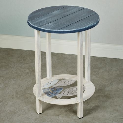 Navigate coastal waters with the sweet school of fish on the Seabrooke Accent Table. The handcrafted and handpainted metal accent table has a dark blue plank-style wooden top and four fish on the bottom shelf. Each fish has a different finish that consists of weathered, distressed shades of midnight blue, slate blue, pale aqua, and gray. The legs are distressed weathered ivory. Due to the handcrafted nature, slight variations may occur. Measures 17"dia.x23"H; weighs 17 lbs.