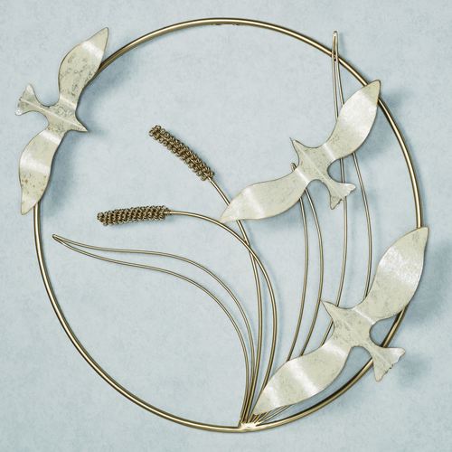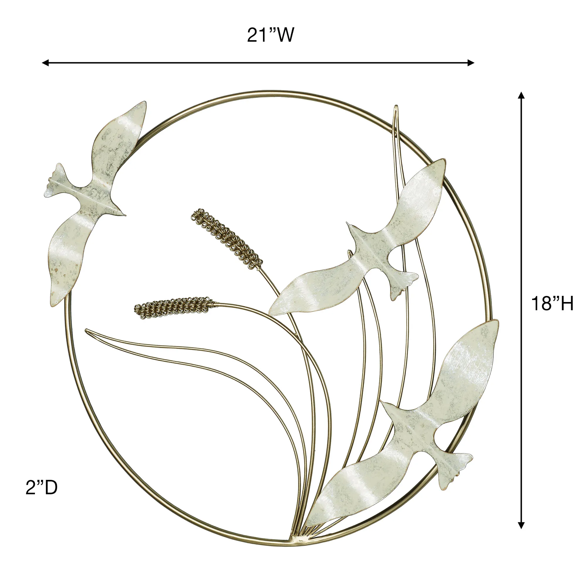 Seagulls in Sea Oats coast along the sea breezes. With a golden openwork circular design, the hand-finished metal wall art features dimensional sea oats, long leaf silhouettes, and three flying seagulls. The ivory seagulls add depth to the design with spread wings mottled by gold and silver highlights. Perfect for your indoor space, covered porch, or enclosed patio, the seagull wall sculpture measures approx. 21"Wx2"Dx18"H.
