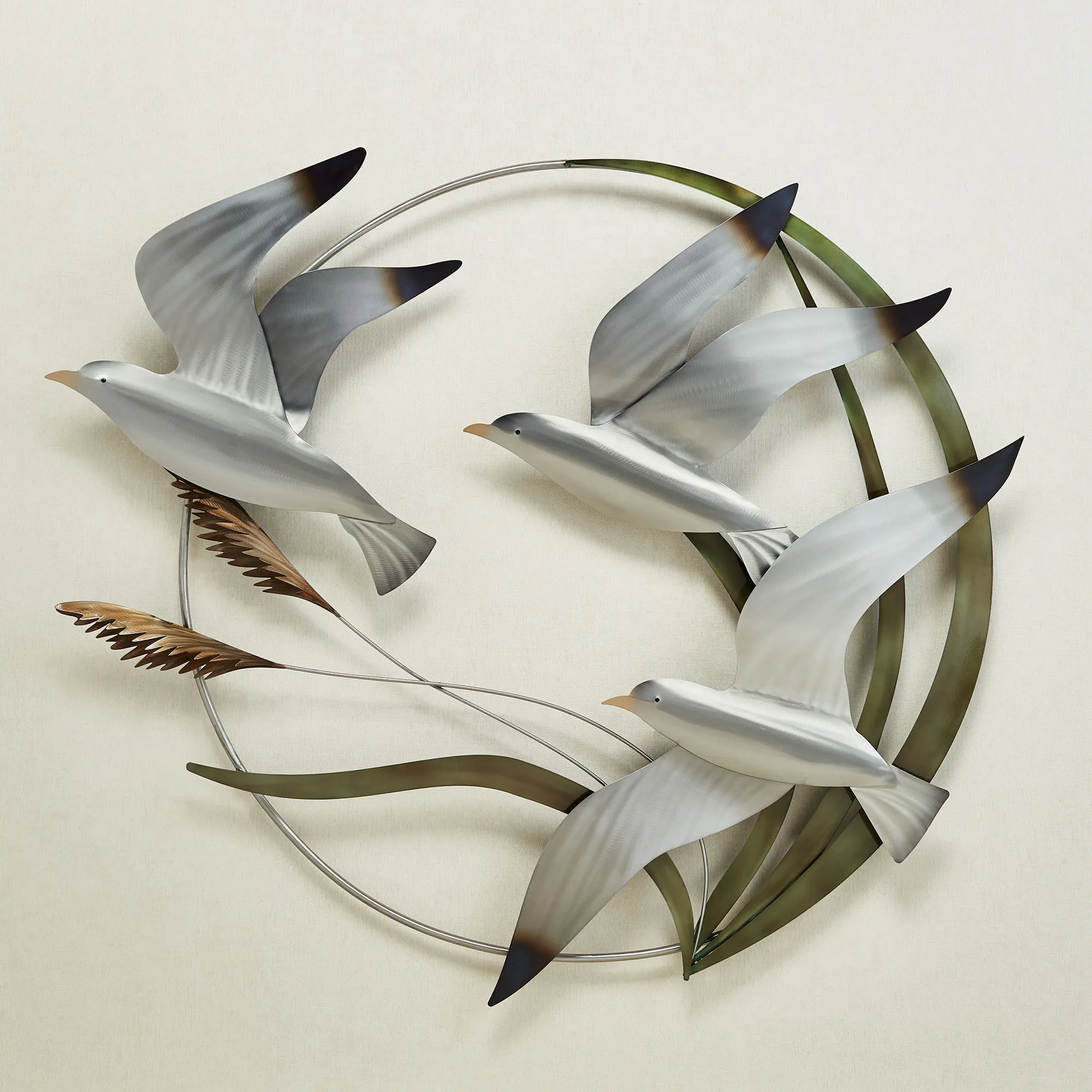 Seagulls drift within the shoreline breezes in this charming round wall sculpture. By artist M. Malizia, the handcrafted stainless steel wall sculpture features an openwork circular frame filled with dimensional sea oats and three flying seagulls. Hand-grinded textures and hand-flamed hues of silver and bronze bring the coastal design to life in your indoor space, covered porch, or enclosed patio. Overall, the coastal wall art measures 39"Wx3"Dx36"H.