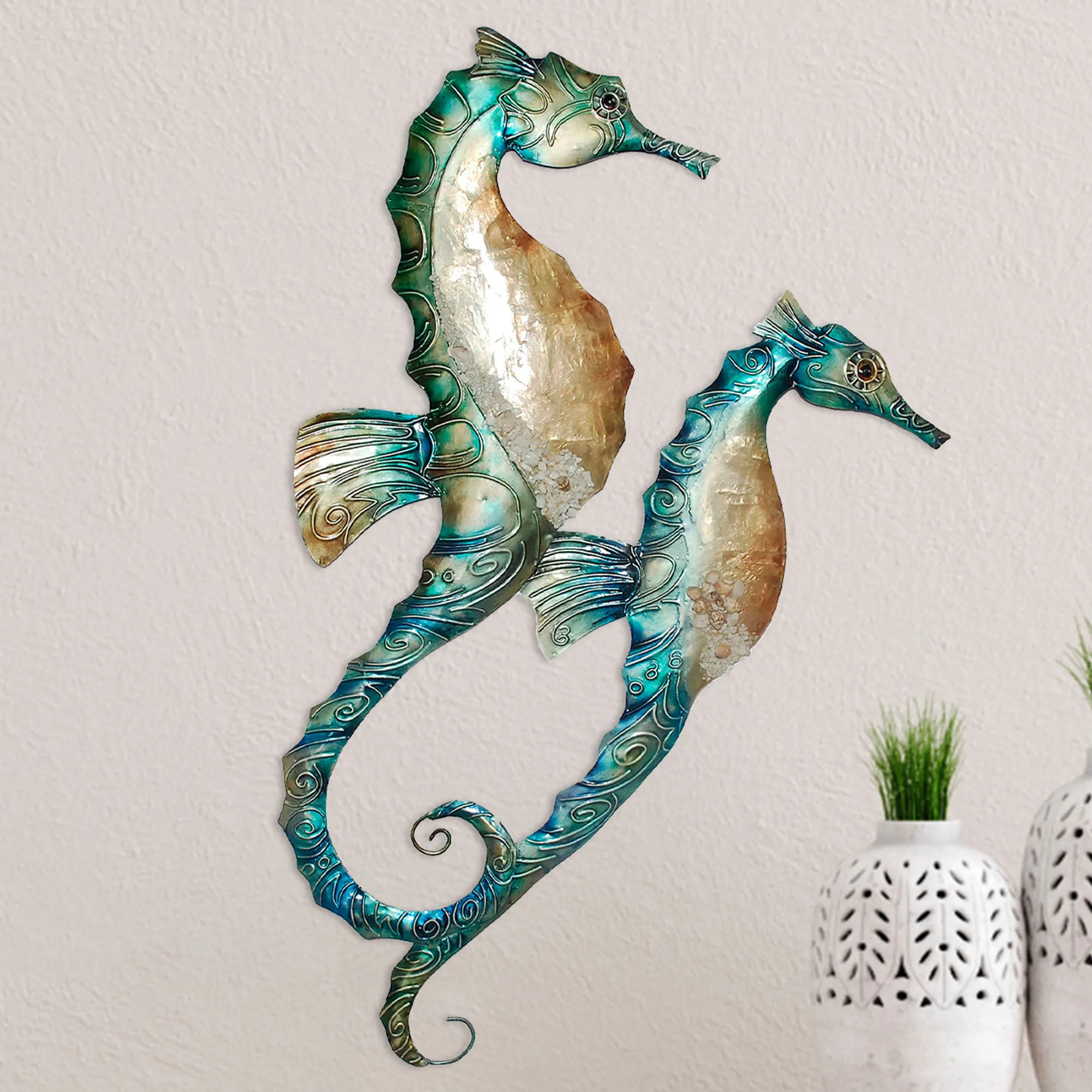 Seahorse Duo Indoor Outdoor Capiz Shell and Metal Wall Art