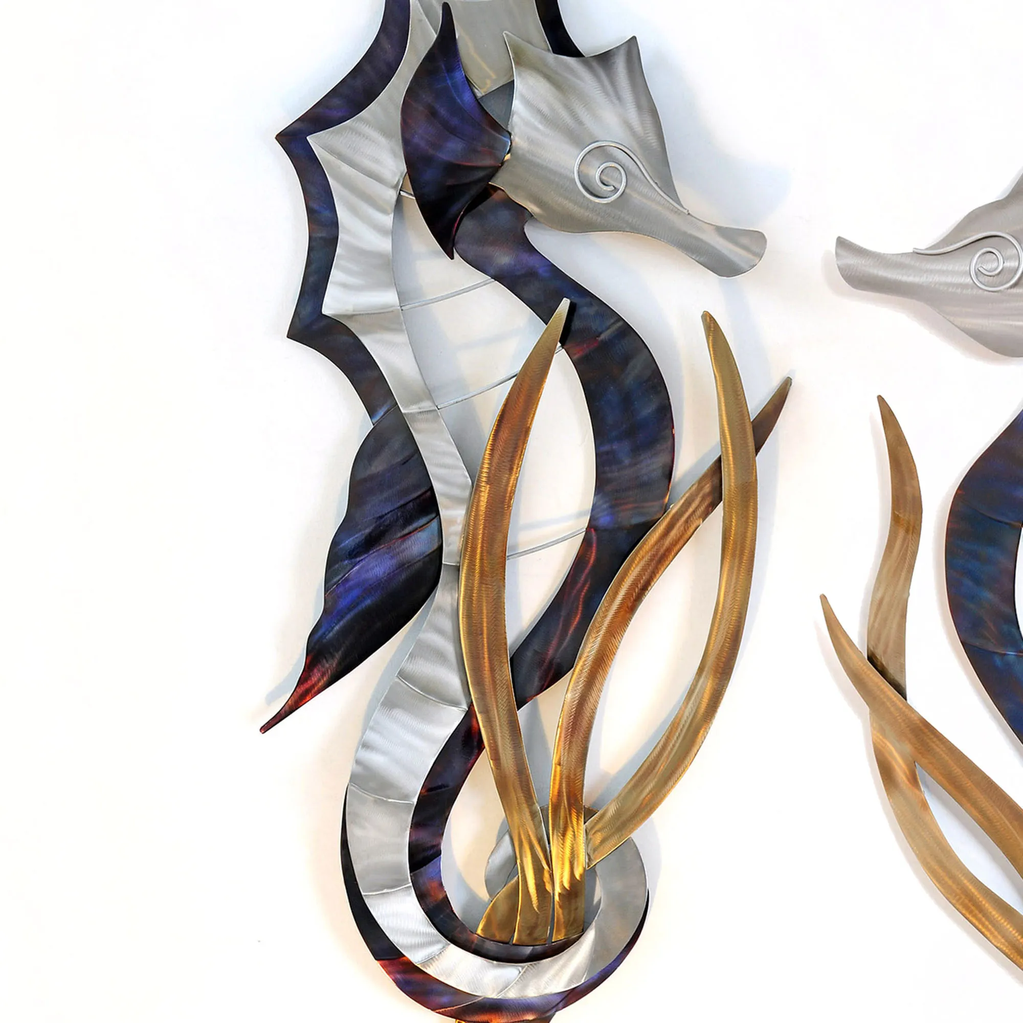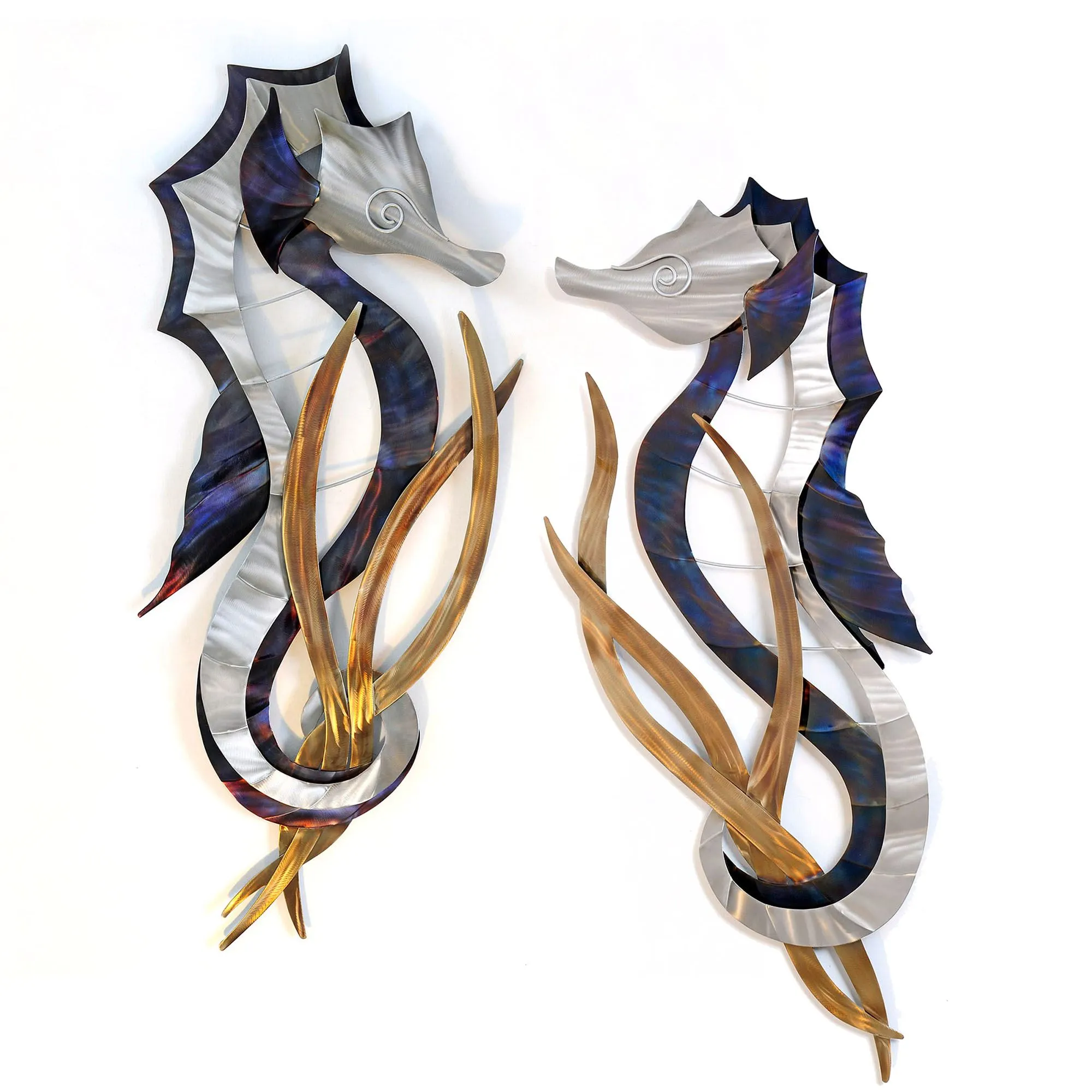 The Seahorse Wall Sculptures are stainless steel and metal.