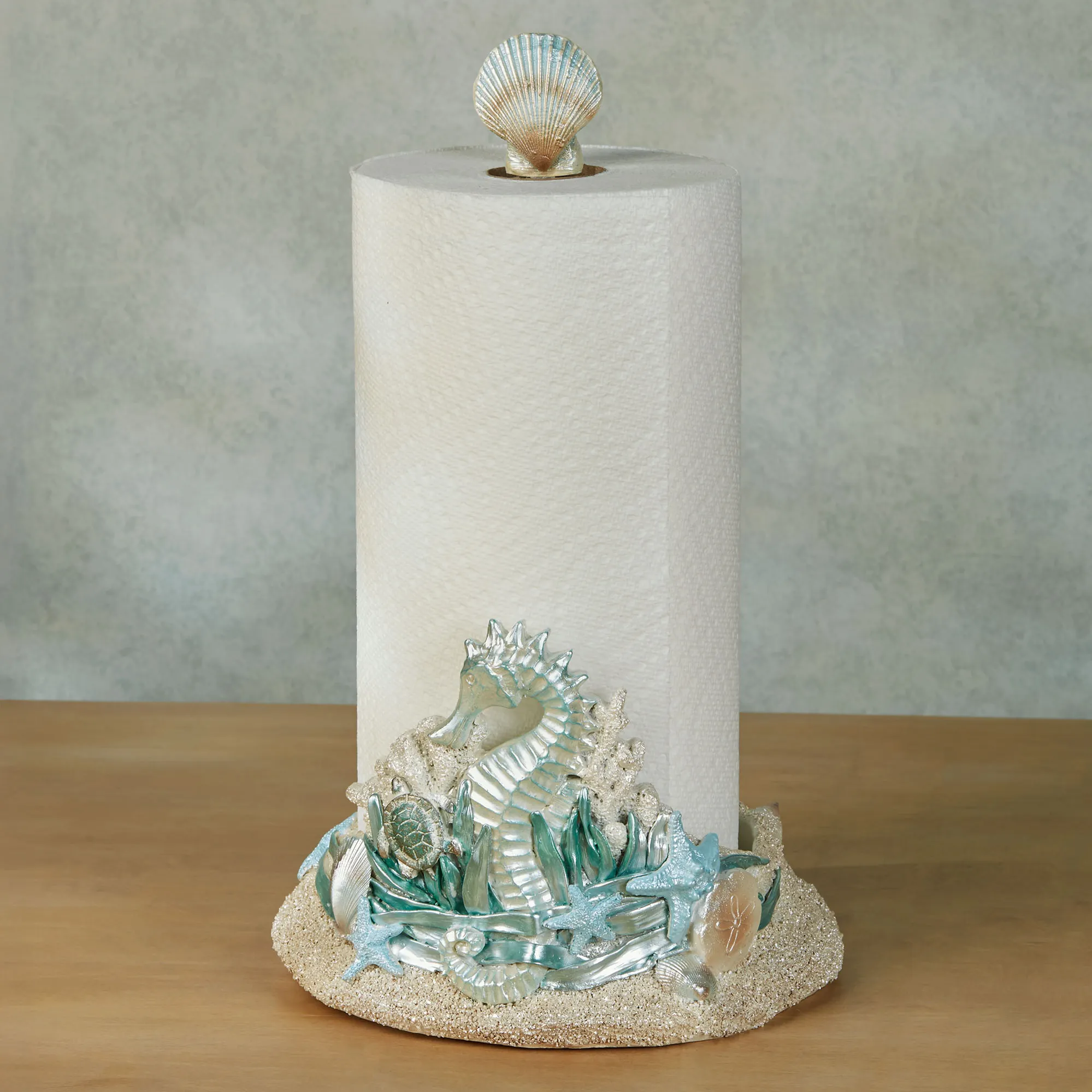 Catch a glimpse of where the Seahorse and sea turtle friends play. Handpainted in pearlescent natural hues, the resin paper towel holder features a sandy textured base, a blue-washed seahorse, a green sea turtle, green grasses, ivory textured coral, starfish, a sand dollar, and shells. The design has a 6" dia. surface space, a center metal bar, and a removable blue scallop shell finial to hold your paper towel roll. Overall, the seahorse paper towel holder measures 9"dia.x15"H.