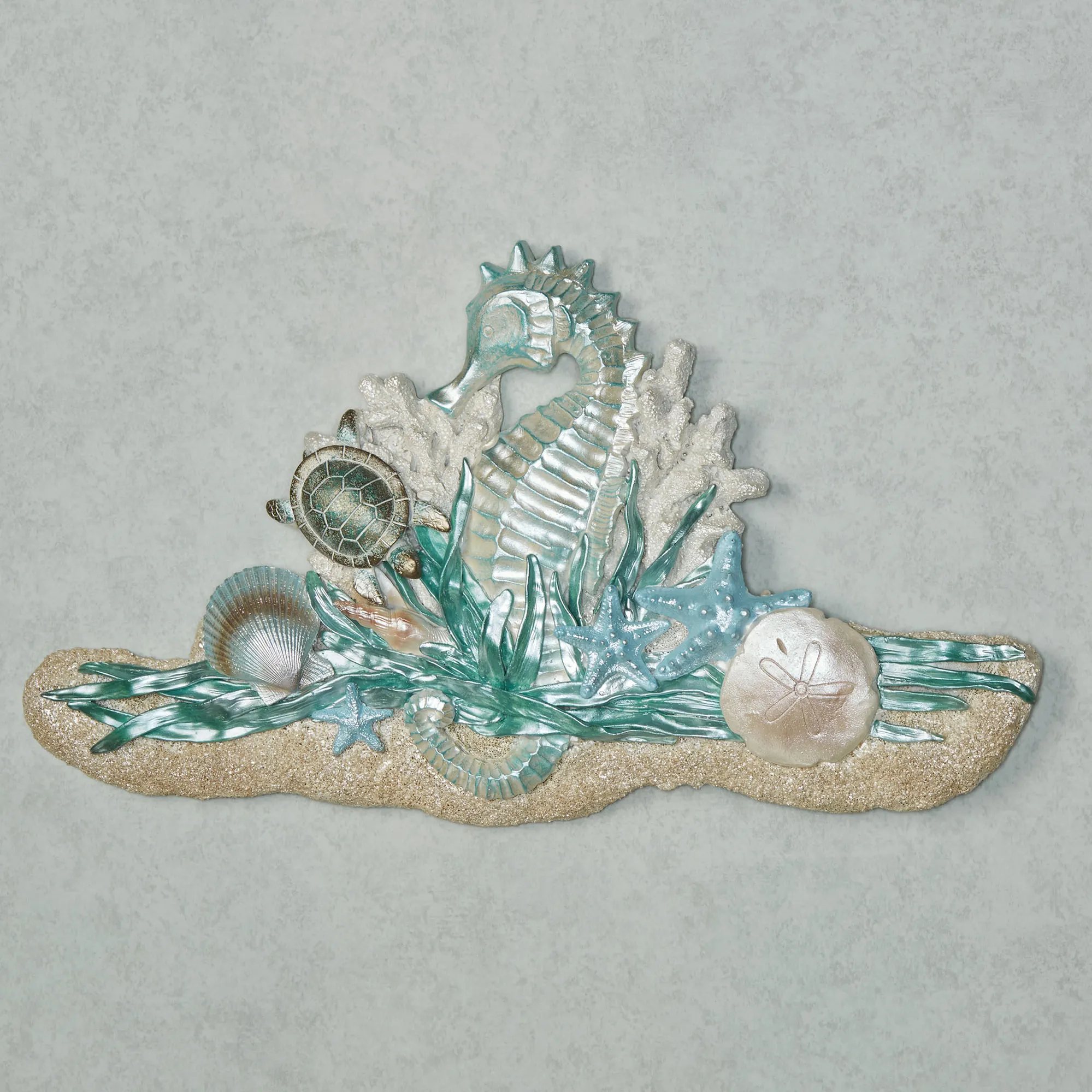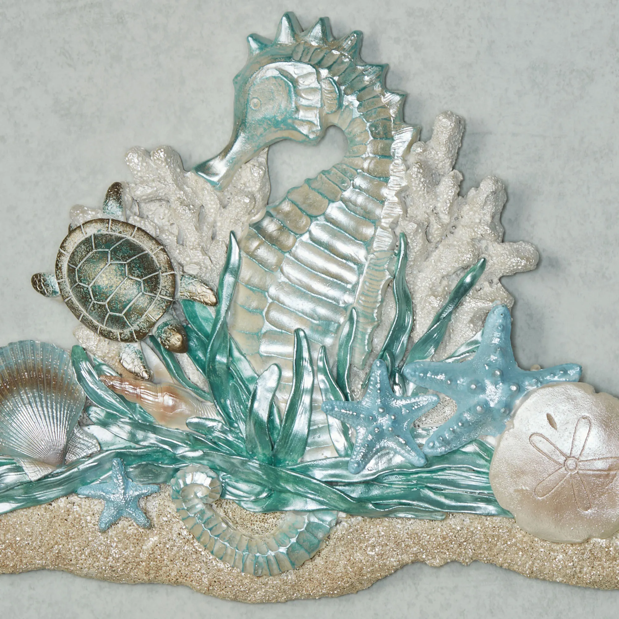 Catch a glimpse of where the Seahorse and sea turtle friends play. Handpainted in pearlescent natural hues, the resin wall plaque features a sandy textured base with a blue-washed seahorse, a green sea turtle, green grasses, ivory textured coral, starfish, a sand dollar, and shells. Perfect alone, in a coastal collage, or above a doorway, the wall accent measures 19"Wx2"Dx11"H.