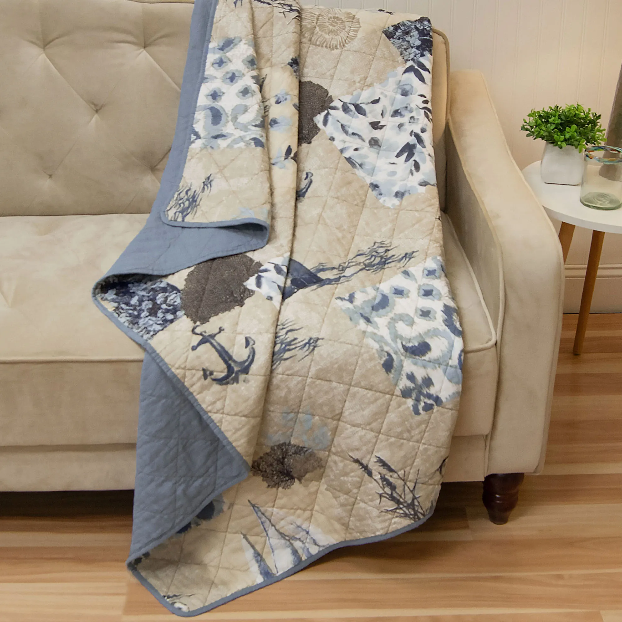 Throw has ocean-inspired motifs with block designs, diamond quilting, bound ends, and a solid blue backing with diamond quilting.