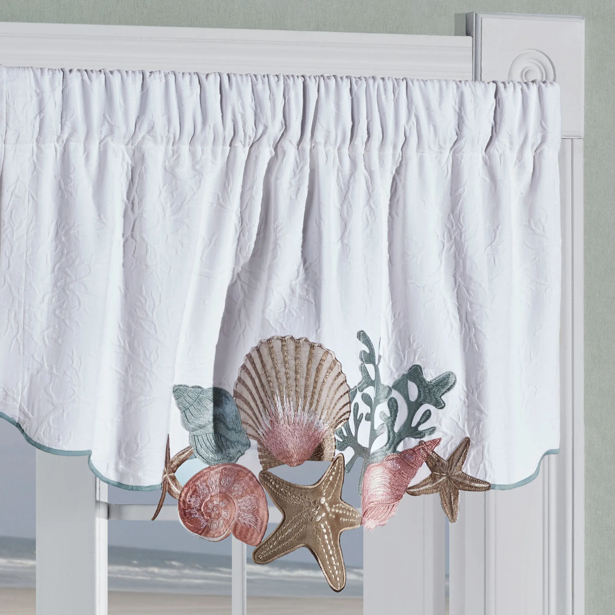 Evoke coral reef sights with the Seashell Medley Window Treatment. Patterned with various coral branches, the woven matelasse cotton/polyester-blend window treatment provides a beautiful home for the velvet applique and embroidered starfish, scallop shells, conch, coral, and nautilus. Soft shades of almond, coral pink, and aqua pop from the white ground. Mimicking soft ocean waves, aqua-hued stitching details the scalloped edges. Window treatment has 3" rod pockets. Specify Ascot Valance or Curtain Pair. Each Ascot Valance features a contour-cut coastal center edge. Curtain Pair has contour-cut inside corners and includes coastal tiebacks. Machine washable. Imported.