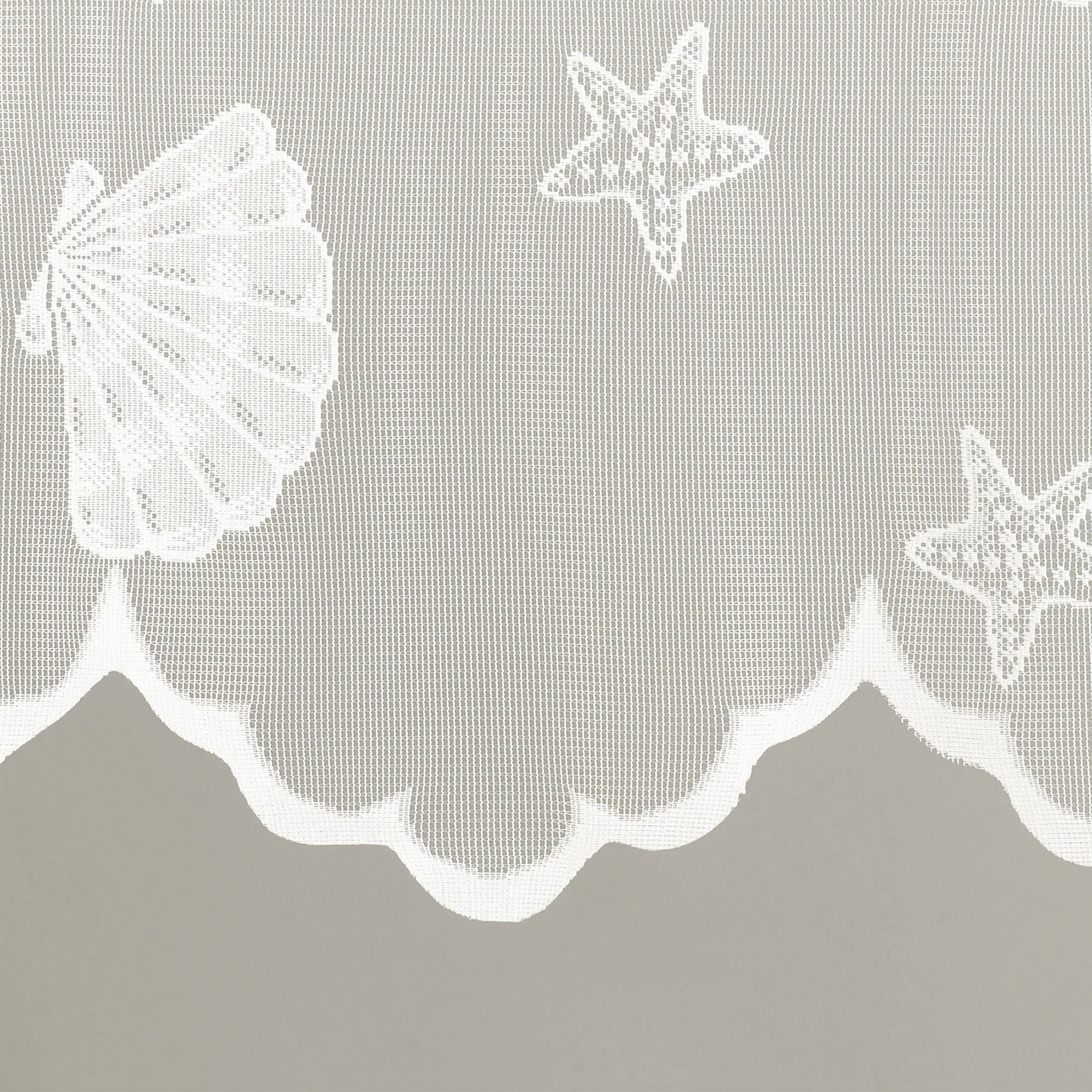 Featuring a classic coastal motif with an assortment of shells and starfish scattered across a delicately knit lace, the Seashells Lace Valance has a deep scalloped bottom hem and selvedge edges. Scalloped window valance is 100% polyester and has a 1.75" rod pocket. Measures 56"Wx18"L. Machine wash. Imported.