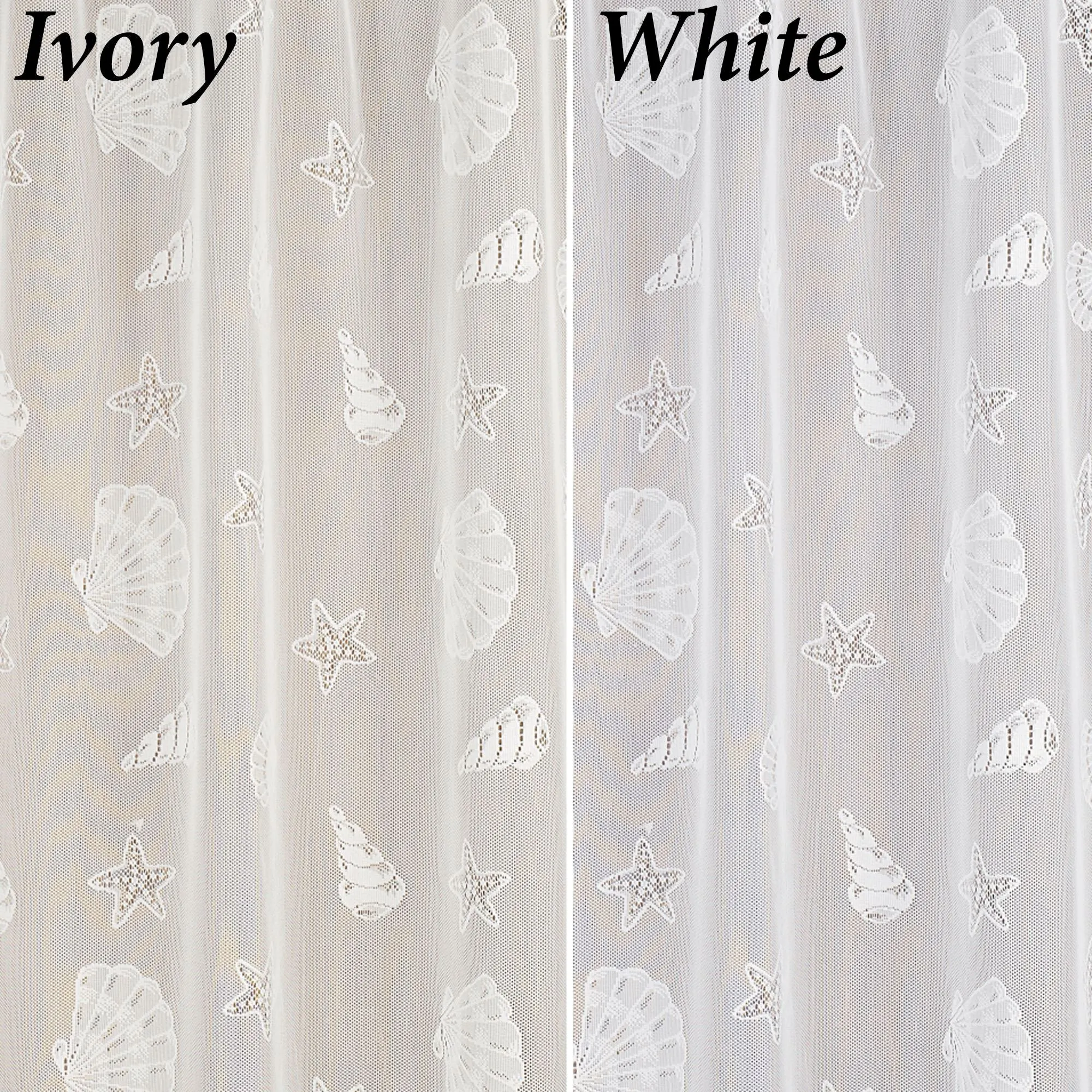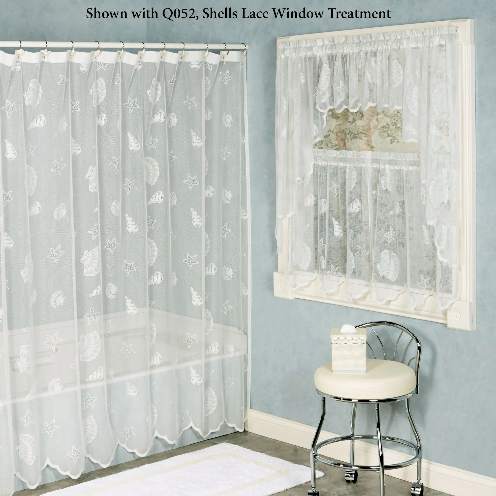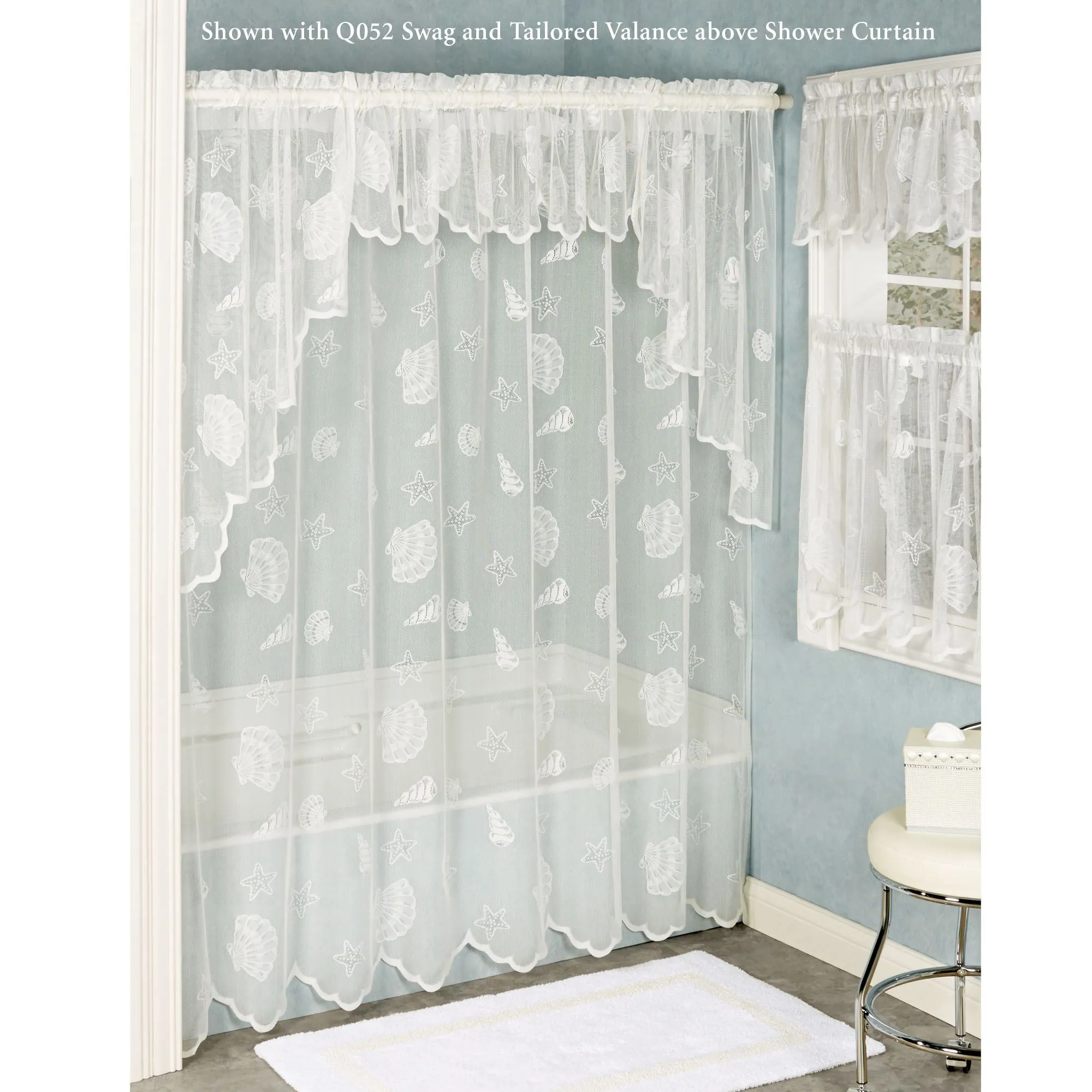 The wispy Seashells Lace Shower Curtain features assorted seashells and starfish scattered across polyester knit lace. Bottom edge is scalloped. Seashell shower curtain measures 72"Wx72"L. Machine washable. Imported.