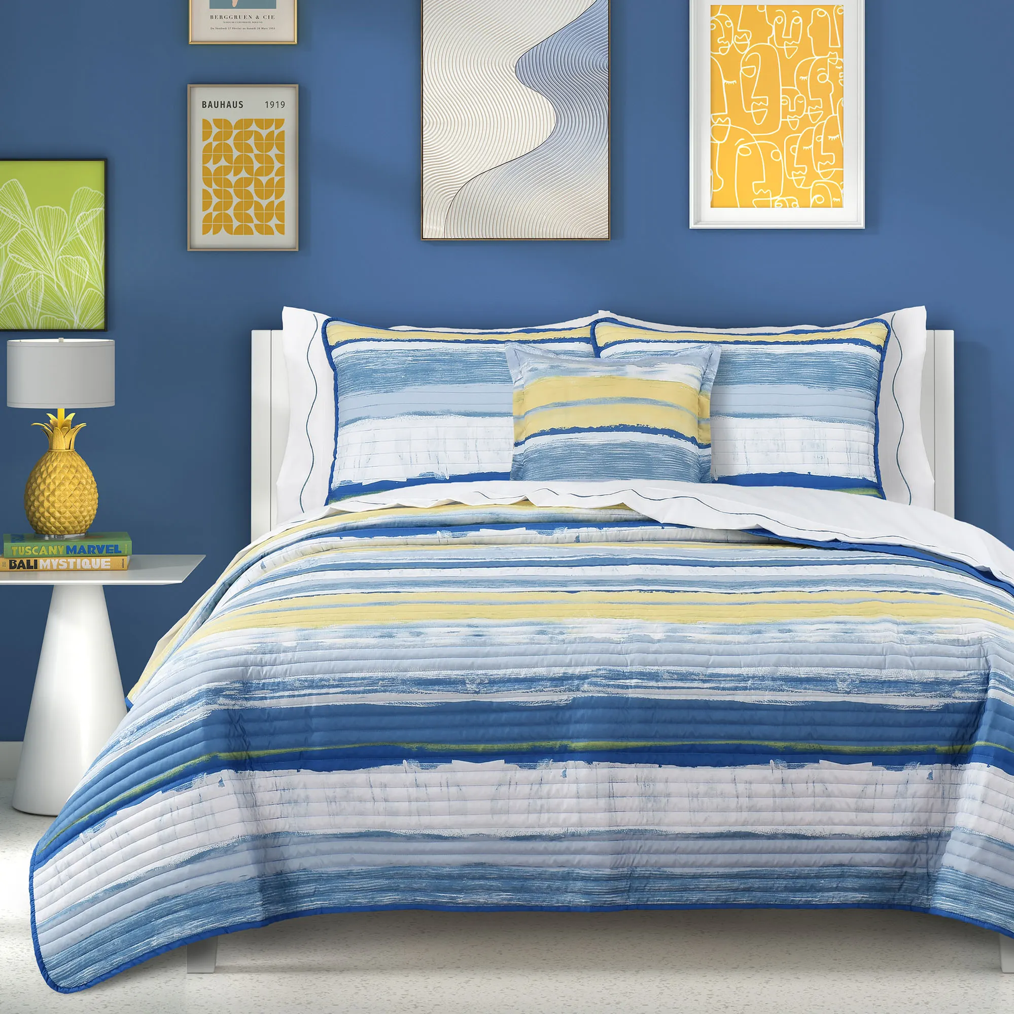 Seashore Blue and Yellow Striped Coastal Quilt Set Bedding from J Queen Bold