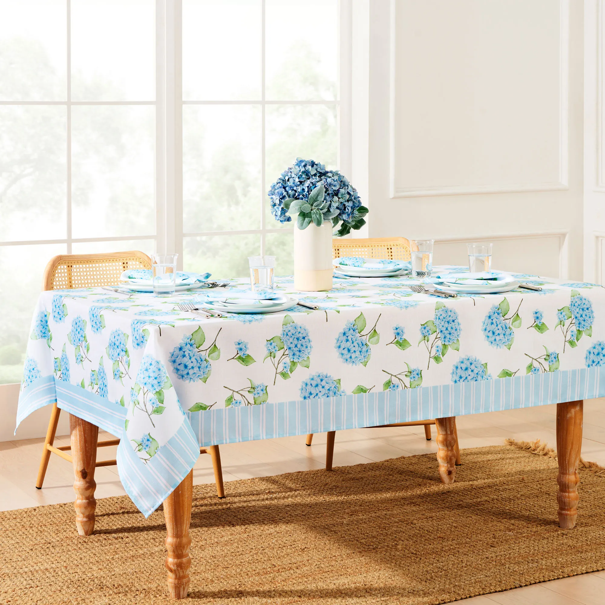 • Hydrangea floral table linens are machine washable