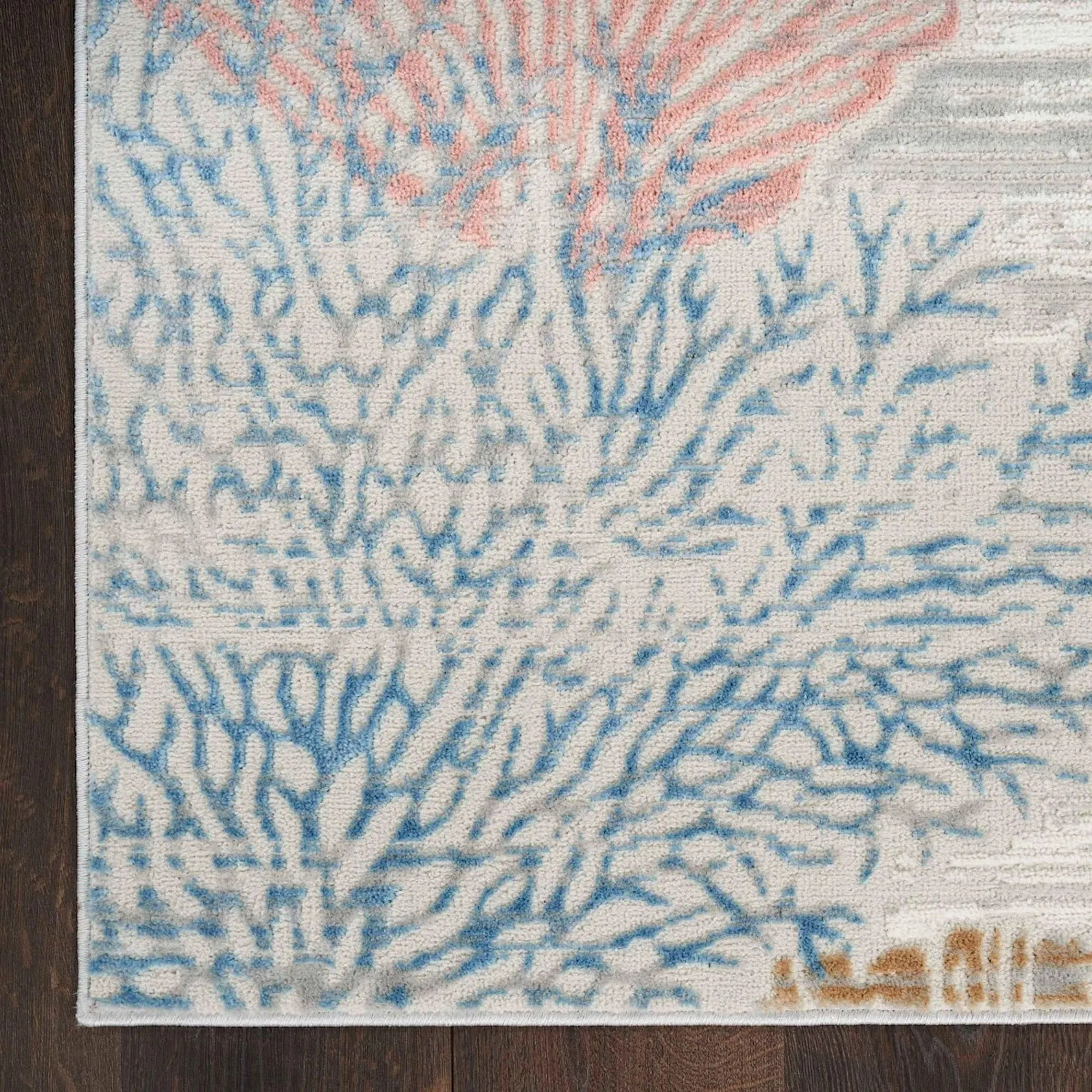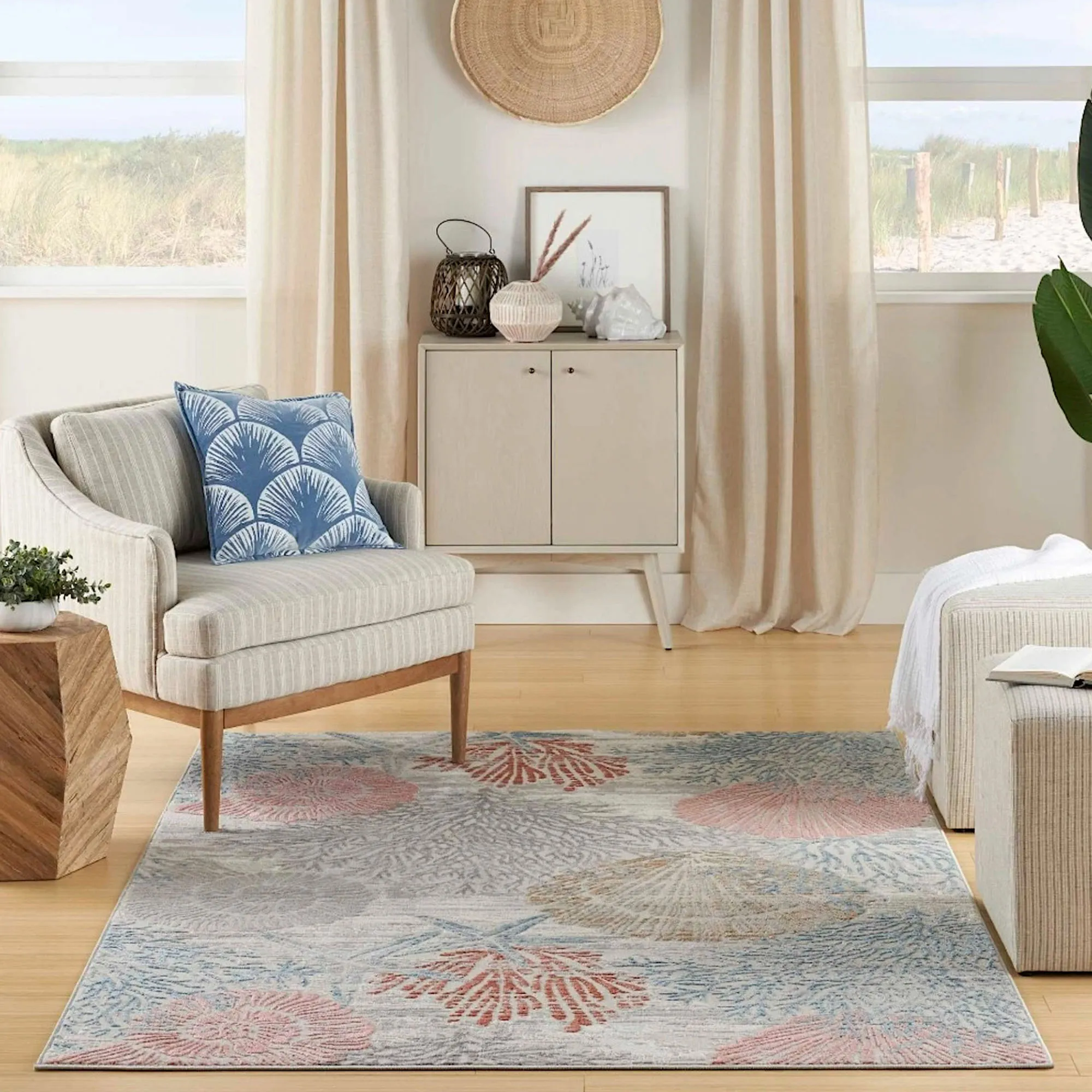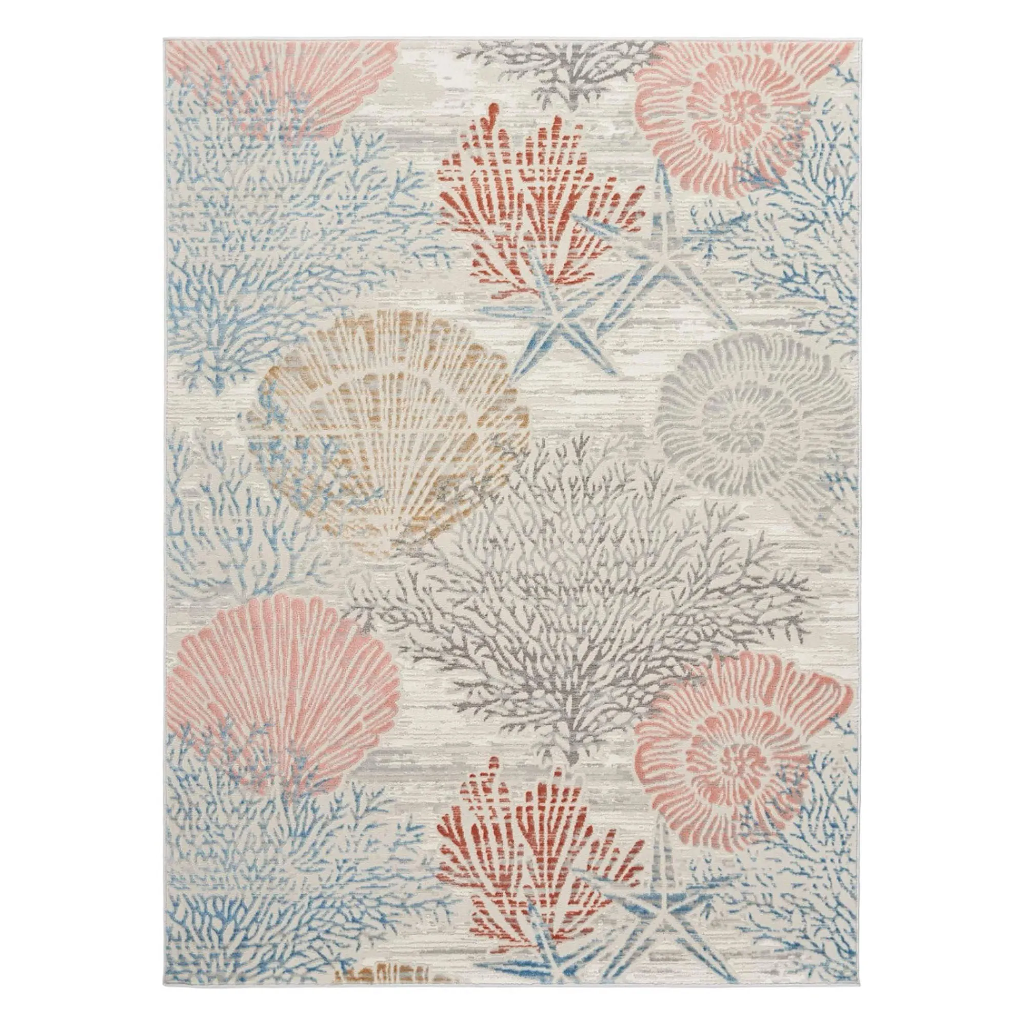 Seaside Treasures are always fun to discover at the beach. This power-loomed, polypropylene/polyester area rug, .34" thick, features a high-low design of seashells, starfish, and coral on a striated background. The coral pink coloration has shades of coral pink, gray, blue, and cinnabar. Backing is latex. We recommend professional cleaning by a rug cleaner. Imported.